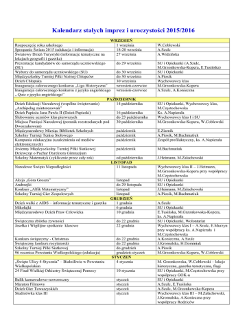 Kalendarz stałych imprez i uroczystości 2015/2016 WRZESIEŃ Rozpoczęcie roku szkolnego 1 września Sprzątanie Świata 2015 (edukacja i informacja) 18-20 września Światowy Dzień Turystyki (informacje tematyczne na 27 września lekcjach geografii i gazetka) Prezentacje kandydatów do samorządu uczniowskiego do 29 września (SU) Wybory do samorządu uczniowskiego (SU) do 30 września Międzyszkolny Turniej Piłki Nożnej Chłopców do 30 września Dzień Chłopaka 30 września Inauguracja całorocznego konkursu „Liga Historyczna” wrzesień-czerwiec Inauguracja całorocznego konkursu z języka angielskiego wrzesień-czerwiec „ Quiz z języka angielskiego” PAŹDZIERNIK Dzień Edukacji Narodowej (wspólne świętowanie) 14 października „Archipelag zainteresowań” Dzień Papieża Jana Pawła II (Dzień Papieski) 16 października Ślubowanie uczniów klas pierwszych do 23 października Miejsca Pamięci Narodowej (pomnik rozstrzelanych pod 30 października Dworzakowem) Międzynarodowy Miesiąc Bibliotek Szkolnych październik Szkolny Turniej Tenisa Stołowego październik Kampania edukacyjna (uzależnienia od mediów październik elektronicznych) Jesienny Międzyszkolny Turniej Piłki Siatkowej październik Dziewcząt o Puchar Dyrektora Gimnazjum Szkolny Matematyk (cyklicznie przez cały rok) od października LISTOPAD Narodowe Święto Niepodległości 11 listopada Akcja „Góra Grosza” Andrzejki Konkurs „Alfik Matematyczny” Szkolny Turniej Gier Zespołowych listopad do 29 listopada listopad listopad GRUDZIEŃ Dzień walki z AIDS – informacje tematyczne i gazetka 1 grudnia Mikołajki 6 grudnia Międzynarodowy Dzień Praw Człowieka 10 grudnia Świąteczna zbiórka żywności Jasełka i Wigilijne spotkanie klasowe Konkurs świąteczny - Christmas Świąteczny konkurs recytatorski Szkolny Turniej Piłki Siatkowej 96 rocznica Powstania Wielkopolskiego (edukacja) „Święto Ulicy 4-Stycznia” – Białośliwie w Powstaniu Wielkopolskim 24 Finał Wielkiej Orkiestry Świątecznej Pomocy Balik karnawałowo-noworoczny Maraton Filmowy Dzień Gier Towarzyskich Studniówka klas III do 22 grudnia 22 grudnia do 22 grudnia do 22 grudnia do grudzień grudzień-styczeń STYCZEŃ 4 stycznia 10 stycznia styczeń styczeń styczeń styczeń W.Coblewski A.Szulc A.Widzińska SU i Opiekunki (A.Szulc, M.Grzonkowska-Kopera, E.Tusińska) SU i Opiekunki A.Piosik Wychowawcy klas M.Grzonkowska-Kopera A.Szulc, A.Konieczna SU i Opiekunki, Wychowawcy klas, M.Częstochowska Ks. A.Napierała Wychowawcy klas I i SU M.Grzonkowska-Kopera, W.Coblewski E.Ziarnik A.Piosik, M.Bachmatiuk Zespół profilaktyczny, ks. A.Napierała M.Bachmatiuk J.Heimann, M.Załachowski Wychowawcy klas II – J.Heimann, M.Grzonkowska-Kopera przy współpracy M.Częstochowska SU i Opiekunki SU i Opiekunki J.Heimann, M.Załachowski A.Piosik, M.Bachmatiuk A.Szulc SU i Opiekunki E.Tusińska, M.Grzonkowska-Kopera, ks. A.Napierała SU i Opiekunki, Wolontariat Wychowawcy klas I – A.Szulc, E.Murzyn przy współpracy ks. A.Napierała i M.Częstochowska A.Konieczna, A.Szulc J.Kromulska, H.Dominiak A.Piosik M.Grzonkowska-Kopera, W.Coblewski M. Grzonkowska, W.Coblewski – lekcje historyczne, gazetka tematyczna, flagi SU i Opiekunki, M.Częstochowska przy współpracy GOK-u SU i Opiekunki A.Szulc, E.Tusińska A.Szulc, M.Grzonkowska-Kopera Wychowawcy klas III – M.Załachowski, J.Kromulska, A.Konieczna przy współpracy Rodziców LUTY 8 luty Dzień Bezpiecznego Internetu Konkurs na kartkę walentynkową Walentynki (poczta, dyskoteka) Konkurs piosenki angielskiej Międzynarodowy Dzień Języka Ojczystego Konkurs filmowy Szkolny Turniej Unihokeja do 14 lutego do 14 lutego luty 21 luty luty luty MARZEC 8 marca 14 marca 17 marca 20 marca 25 marca 27 marca Miedzynarodowy Dzień Kobiet Dzień liczby Π Dzień Języka Angielskiego – Św. Patryk Pierwszy Dzień Wiosny „Dzień Samorządności” Dzień Świętości Życia Międzynarodowy Dzień Teatru (lekcje tematyczne, gazetka) Dzień Języka Polskiego Konkurs matematyczny „Kangur”, Dzień Matematyki Powiatowy Konkurs Matematyczny Szkolny Turniej Piłki Siatkowej 11 rocznica śmierci Jana Pawła II Światowy Dzień Zdrowia marzec marzec marzec marzec KWIECIEŃ 2 kwietnia 7 kwietnia Kwiecień – Miesiąc Pamięci Narodowej (lekcje tematyczne) Międzynarodowy Dzień Ziemi Dzień Języka Niemieckiego Konkurs instrumentalny (akordeoniści) kwiecień Dzień Flagi Rzeczypospolitej Polskiej (lekcje tematyczne) Święto Konstytucji 3 maja (program artystyczny) 22 kwietnia kwiecień kwiecień MAJ 2 maja 3 maja Dzień Bibliotekarzy i Bibliotek Koncert Pieśni Maryjnych (udział) Konkurs „Ortograficzna Corrida” Dzień Nauk Humanistycznych 8 maja maj maj maj Międzyszkolny Turniej Piłki Nożnej Międzynarodowy Dzień Dziecka Dzień Sportu Dzień Patrona maj CZERWIEC 1 czerwca czerwiec 14 czerwca Zakończenie klas III 23 czerwca Zakończenie klas I-II (program artystyczny) 24 czerwca M.Załachowski, wychowawcy klas (lekcje i gazetka tematyczna) M.Częstochowska SU i Opiekunki A.Konieczna, A.Szulc, M.Częstochowska H.Dominiak, J.Kromulska A.Szulc, E.Tusińska A.Piosik, M.Bachmatiuk Wychowawcy klas J.Heimann, M.Załachowski A. Konieczna, A. Szulc SU i Opiekunki Ks. A.Napierała J.Kromulska, H.Dominiak J.Kromulska, H.Dominiak J.Heimann, M. Załachowski J.Heimann, M.Załachowski A.Piosik, M.Bachmatiuk M.Częstochowska, ks. A.Napierała A.Szulc, M.Bachmatiuk, A.Piosik, M.Gruszka A.Grzonkowska-Kopera, W.Coblewski A.Szulc, A.Widzińska E.Murzyn M.Częstochowska A.Grzonkowska-Kopera, W.Coblewski Wychowawcy klas I – A.Szulc, E.Murzyn przy współpracy M.Częstochowska E.Ziarnik M.Częstochowska H.Dominiak, J.Kromulska J.Kromulska; przy współpracy nauczycieli przedmiotów humanistycznych A.Piosik SU i Opiekunki M.Bachmatiuk, A.Piosik, M.Gruszka SU i Opiekunki, przy współpracy ks.A.Napierała i M.Częstochowska, Wychowawcy klas III – M.Załachowski, J.Kromulska, A.Konieczna Wychowawcy klas II 