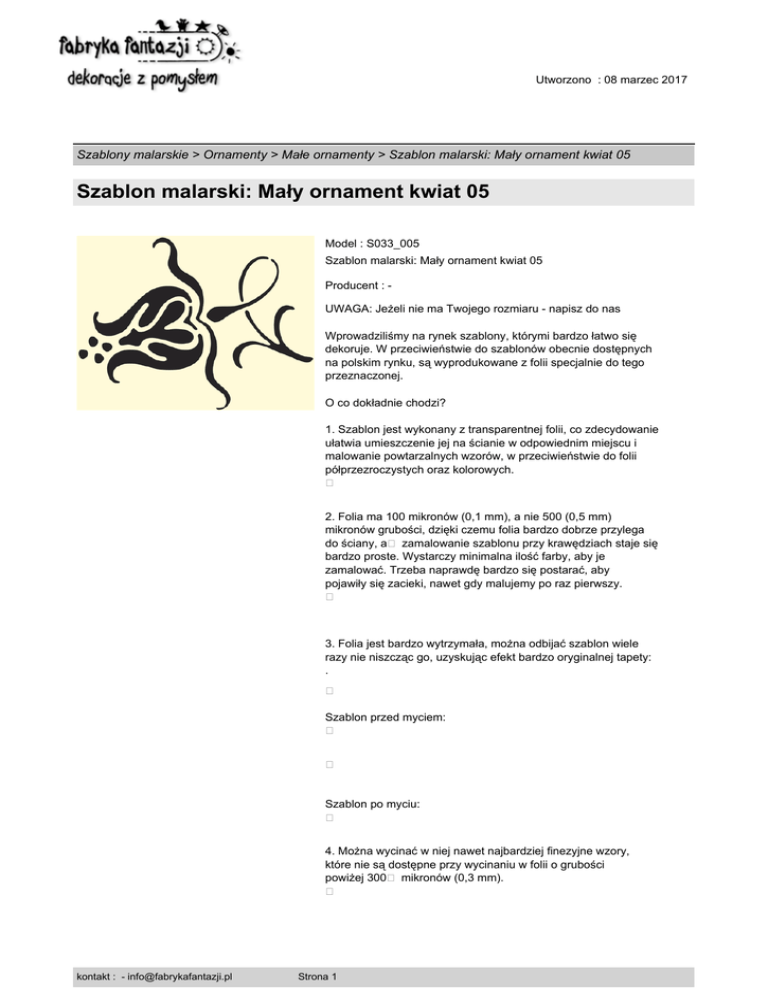 Utworzono : 08 marzec 2017 Szablony malarskie > Ornamenty > Małe ornamenty > Szablon malarski: Mały ornament kwiat 05 Szablon malarski: Mały ornament kwiat 05 Model : S033_005 Szablon malarski: Mały ornament kwiat 05 Producent : UWAGA: Jeżeli nie ma Twojego rozmiaru - napisz do nas Wprowadziliśmy na rynek szablony, którymi bardzo łatwo się dekoruje. W przeciwieństwie do szablonów obecnie dostępnych na polskim rynku, są wyprodukowane z folii specjalnie do tego przeznaczonej. O co dokładnie chodzi? 1. Szablon jest wykonany z transparentnej folii, co zdecydowanie ułatwia umieszczenie jej na ścianie w odpowiednim miejscu i malowanie powtarzalnych wzorów, w przeciwieństwie do folii półprzezroczystych oraz kolorowych. � 2. Folia ma 100 mikronów (0,1 mm), a nie 500 (0,5 mm) mikronów grubości, dzięki czemu folia bardzo dobrze przylega do ściany, a� zamalowanie szablonu przy krawędziach staje się bardzo proste. Wystarczy minimalna ilość farby, aby je zamalować. Trzeba naprawdę bardzo się postarać, aby pojawiły się zacieki, nawet gdy malujemy po raz pierwszy. � 3. Folia jest bardzo wytrzymała, można odbijać szablon wiele razy nie niszcząc go, uzyskując efekt bardzo oryginalnej tapety: . � Szablon przed myciem: � � Szablon po myciu: � 4. Można wycinać w niej nawet najbardziej finezyjne wzory, które nie są dostępne przy wycinaniu w folii o grubości powiżej 300� mikronów (0,3 mm). � kontakt : - [email protected] Strona 1 Utworzono : 08 marzec 2017 Szablony malarskie > Ornamenty > Małe ornamenty > Szablon malarski: Mały ornament kwiat 05 Szablon malarski: Mały ornament kwiat 05 5. Folia nie zapamiętuje kształtu opakowania w którym jest wysyłana, a później przechowywana, dzięki czemu szablon idealnie przylega do ściany i żadne jego elementy nie odstają. 6. Folia, jest bardzo lekka, dlatego łatwo sie maluje, gdyż nie musisz jej trzymać, nawet malując sufit.� Do mocowania folii na ścianie służy specjalny klej w spray'u (który nie zostawia żadnych śladów). Po skończonym malowaniu wystarczy delikatnie zdjąć szablon ze ściany i gotowe! Szablony wykonane z grubej folii są ciężkie i nie utrzymają się na kleju. Wraz z szablonem dodatkowo otrzymasz dokładną instrukcję malowania do danego wzoru oraz jego przykładowe wersje kolorystyczne. Dodatkowo na naszej stronie znajdziesz obszerne poradniki, które poprawadzą Cię za rękę i krok po kroku dowiesz się, co trzeba zrobić, aby Twój malowany projekt był udany. Szukaj pod hasłami: � "Jak malować?"������� oraz������� "Malowane Projekty" A co jeżeli mam pomysł na własny szablon? - Jest możliwe wykonanie szablonu na podstawie Twojego pomysłu.� A resztę pozostaw nam ;) Wykonujemy szablony na zamówienie dla artystów, dekoratorów wnętrz, architektów. Tu czytaj o wizualizacjach i wzorach dopasowanych do Ciebie. W celu przyklejenia szablonu do ściany, należy użyć proponowanego przez nas kleju do repozycjonowania, sprawdzonego przez artystów i plastyków. Dzięki niemu, każdy najdrobniejszy element szablonu zostanie dokładnie przytwierdzony, a ryzyko podcieknięcia farby nie wystąpi. Kupując szablon firmy Fabryka Fantazji masz 100% gwarancję jakości sprzedawanych szablonów, farb, pędzli i wszystkich innych akcesoriów. Jeżeli masz zastrzeżenia do naszych produktów, pamiętaj, że masz prawo do zwrotu w ciągu 10 dni od dostarczenia produktu do Ciebie. Nic nie ryzykujesz. � kontakt : - [email protected] Strona 2 Utworzono : 08 marzec 2017 Szablony malarskie > Ornamenty > Małe ornamenty > Szablon malarski: Mały ornament kwiat 05 Szablon malarski: Mały ornament kwiat 05 Cena : 5,04 zł Brutto ( 4,10 zł Netto) Dostępne opcje Szablon malarski: Mały ornament kwiat 05 : Rozmiar szablonu 8 x 10 cm. Dostępność: Produkt dostępny w naszym sklepie od 04 grudzień 2008 kontakt : - [email protected] Strona 3
