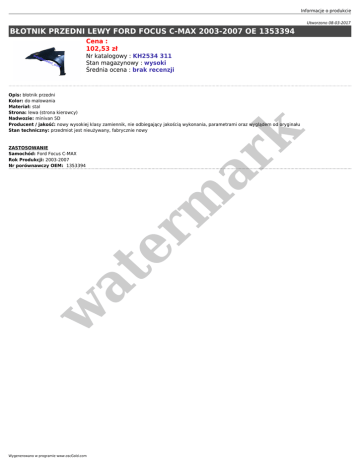 Informacje o produkcie Utworzono 08-03-2017 BŁOTNIK PRZEDNI LEWY FORD FOCUS C-MAX 2003-2007 OE 1353394 Cena : 102,53 zł Nr katalogowy : KH2534 311 Stan magazynowy : wysoki Średnia ocena : brak recenzji w at ZASTOSOWANIE Samochód: Ford Focus C-MAX Rok Produkcji: 2003-2007 Nr porównawczy OEM: 1353394 er m ar k Opis: błotnik przedni Kolor: do malowania Materiał: stal Strona: lewa (strona kierowcy) Nadwozie: minivan 5D Producent / jakość: nowy wysokiej klasy zamiennik, nie odbiegający jakością wykonania, parametrami oraz wyglądem od oryginału Stan techniczny: przedmiot jest nieużywany, fabrycznie nowy Wygenerowano w programie www.oscGold.com