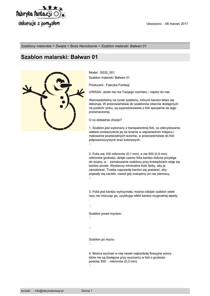 Utworzono : 08 marzec 2017 Szablony malarskie > Święta > Boże Narodzenie > Szablon malarski: Bałwan 01 Szablon malarski: Bałwan 01 Model : S032_001 Szablon malarski: Bałwan 01 Producent : Fabryka Fantazji UWAGA: Jeżeli nie ma Twojego rozmiaru - napisz do nas Wprowadziliśmy na rynek szablony, którymi bardzo łatwo się dekoruje. W przeciwieństwie do szablonów obecnie dostępnych na polskim rynku, są wyprodukowane z folii specjalnie do tego przeznaczonej. O co dokładnie chodzi? 1. Szablon jest wykonany z transparentnej folii, co zdecydowanie ułatwia umieszczenie jej na ścianie w odpowiednim miejscu i malowanie powtarzalnych wzorów, w przeciwieństwie do folii półprzezroczystych oraz kolorowych. � 2. Folia ma 100 mikronów (0,1 mm), a nie 500 (0,5 mm) mikronów grubości, dzięki czemu folia bardzo dobrze przylega do ściany, a� zamalowanie szablonu przy krawędziach staje się bardzo proste. Wystarczy minimalna ilość farby, aby je zamalować. Trzeba naprawdę bardzo się postarać, aby pojawiły się zacieki, nawet gdy malujemy po raz pierwszy. � 3. Folia jest bardzo wytrzymała, można odbijać szablon wiele razy nie niszcząc go, uzyskując efekt bardzo oryginalnej tapety: . � Szablon przed myciem: � � Szablon po myciu: � 4. Można wycinać w niej nawet najbardziej finezyjne wzory, które nie są dostępne przy wycinaniu w folii o grubości powiżej 300� mikronów (0,3 mm). � kontakt : - [email protected] Strona 1 Utworzono : 08 marzec 2017 Szablony malarskie > Święta > Boże Narodzenie > Szablon malarski: Bałwan 01 Szablon malarski: Bałwan 01 5. Folia nie zapamiętuje kształtu opakowania w którym jest wysyłana, a później przechowywana, dzięki czemu szablon idealnie przylega do ściany i żadne jego elementy nie odstają. 6. Folia, jest bardzo lekka, dlatego łatwo sie maluje, gdyż nie musisz jej trzymać, nawet malując sufit.� Do mocowania folii na ścianie służy specjalny klej w spray'u (który nie zostawia żadnych śladów). Po skończonym malowaniu wystarczy delikatnie zdjąć szablon ze ściany i gotowe! Szablony wykonane z grubej folii są ciężkie i nie utrzymają się na kleju. Wraz z szablonem dodatkowo otrzymasz dokładną instrukcję malowania do danego wzoru oraz jego przykładowe wersje kolorystyczne. Dodatkowo na naszej stronie znajdziesz obszerne poradniki, które poprawadzą Cię za rękę i krok po kroku dowiesz się, co trzeba zrobić, aby Twój malowany projekt był udany. Szukaj pod hasłami: � "Jak malować?"������� oraz������� "Malowane Projekty" A co jeżeli mam pomysł na własny szablon? - Jest możliwe wykonanie szablonu na podstawie Twojego pomysłu.� A resztę pozostaw nam ;) Wykonujemy szablony na zamówienie dla artystów, dekoratorów wnętrz, architektów. Tu czytaj o wizualizacjach i wzorach dopasowanych do Ciebie. W celu przyklejenia szablonu do ściany, należy użyć proponowanego przez nas kleju do repozycjonowania, sprawdzonego przez artystów i plastyków. Dzięki niemu, każdy najdrobniejszy element szablonu zostanie dokładnie przytwierdzony, a ryzyko podcieknięcia farby nie wystąpi. Kupując szablon firmy Fabryka Fantazji masz 100% gwarancję jakości sprzedawanych szablonów, farb, pędzli i wszystkich innych akcesoriów. Jeżeli masz zastrzeżenia do naszych produktów, pamiętaj, że masz prawo do zwrotu w ciągu 10 dni od dostarczenia produktu do Ciebie. Nic nie ryzykujesz. � kontakt : - [email protected] Strona 2 Utworzono : 08 marzec 2017 Szablony malarskie > Święta > Boże Narodzenie > Szablon malarski: Bałwan 01 Szablon malarski: Bałwan 01 Cena : 14,11 zł Brutto ( 11,48 zł Netto) Dostępne opcje Szablon malarski: Bałwan 01 : Rozmiar szablonu 36 x 38 cm. Dostępność: Produkt dostępny w naszym sklepie od 01 grudzień 2008 kontakt : - [email protected] Strona 3