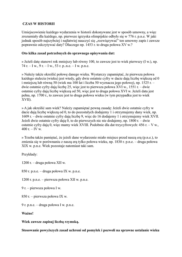CZAS W HISTORII Umiejscowienie każdego wydarzenia w historii dokonywane jest w sposób umowny, a więc zrozumiały dla każdego, np. pierwsze igrzyska olimpijskie odbyły się w 776 r. p.n.e. W jaki jednak sposób najszybciej i najłatwiej nauczyć się „rozwiązywać” ten umowny zapis i zawsze poprawnie odczytywać daty? Dlaczego np. 1453 r. to druga połowa XV w.? Oto kilka zasad potrzebnych do sprawnego opisywania dat: » Jeżeli datę stanowi rok mniejszy lub równy 100, to zawsze jest to wiek pierwszy (I w.), np. 74 r. – I w., 9 r. – I w., 53 r. p..n.e. – I w. p.n.e. » Należy także określić połowę danego wieku. Wystarczy zapamiętać, że pierwsza połowa każdego stulecia (wieku) jest wtedy, gdy dwie ostatnie cyfry w dacie dają liczbę większą od 0 i mniejszą lub równą 50 (wiek ma 100 lat i liczba 50 wyznacza jego połowę), np. 1525 r. – dwie ostatnie cyfry dają liczbę 25, więc jest to pierwsza połowa XVI w., 1551 r. – dwie ostatnie cyfry dają liczbę większą od 50, więc jest to druga połowa XVI w. Jeżeli data jest pełna, np. 1700 r., to zawsze jest to druga połowa wieku (w tym przypadku jest to wiek XVII). » A jak określić sam wiek? Należy zapamiętać pewną zasadę: Jeżeli dwie ostatnie cyfry w dacie dają liczbę większą od 0, to do pozostałych dodajemy 1 i otrzymujemy dany wiek, np. 1609 r. – dwie ostatnie cyfry dają liczbę 9, więc do 16 dodajemy 1 i otrzymujemy wiek XVII. Jeżeli dwie ostatnie cyfry dają 0, to do pierwszych nic nie dodajemy, np. 1800 r. – dwie ostatnie cyfry dają 0, więc mamy wiek XVIII. Podobnie dla dat trzycyfrowych: 456 r. – V w., 400 r. – IV w. » Trzeba także pamiętać, że jeżeli dane wydarzenie miało miejsce przed naszą erą (p.n.e.), to zmienia się w porównaniu z naszą erą tylko połowa wieku, np. 1830 r. p.n.e. – druga połowa XIX w. p.n.e. Wiek pozostaje natomiast taki sam. Przykłady: 1200 r. – druga połowa XII w. 850 r. p.n.e. – druga połowa IX w. p.n.e. 1200 r. p.n.e. – pierwsza połowa XII w. p.n.e. 9 r. – pierwsza połowa I w. 850 r. – pierwsza połowa IX w. 9 r. p.n.e. – druga połowa I w. p.n.e. Ważne! Wiek zawsze zapisuj liczbą rzymską. Stosowanie powyższych zasad uchroni od pomyłek i pozwoli na sprawne ustalanie wieku i jego połowy dla każdej daty. Ciekawostka! Historia nie zna roku 0, dlatego każdy, kto żył na przełomie er, żył „w rzeczywistości” o jeden rok krócej. Np. ktoś, kto urodził się w 50 r. p.n.e., a zmarł w 50 r. n.e., żył 99 lat. Dlaczego? Po 1 r. p.n.e. następuje od razu rok 1 n.e.; nie obowiązuje liczenie czysto matematyczne, gdzie pomiędzy liczbą -1 a liczbą 1 jest jeszcze 0.