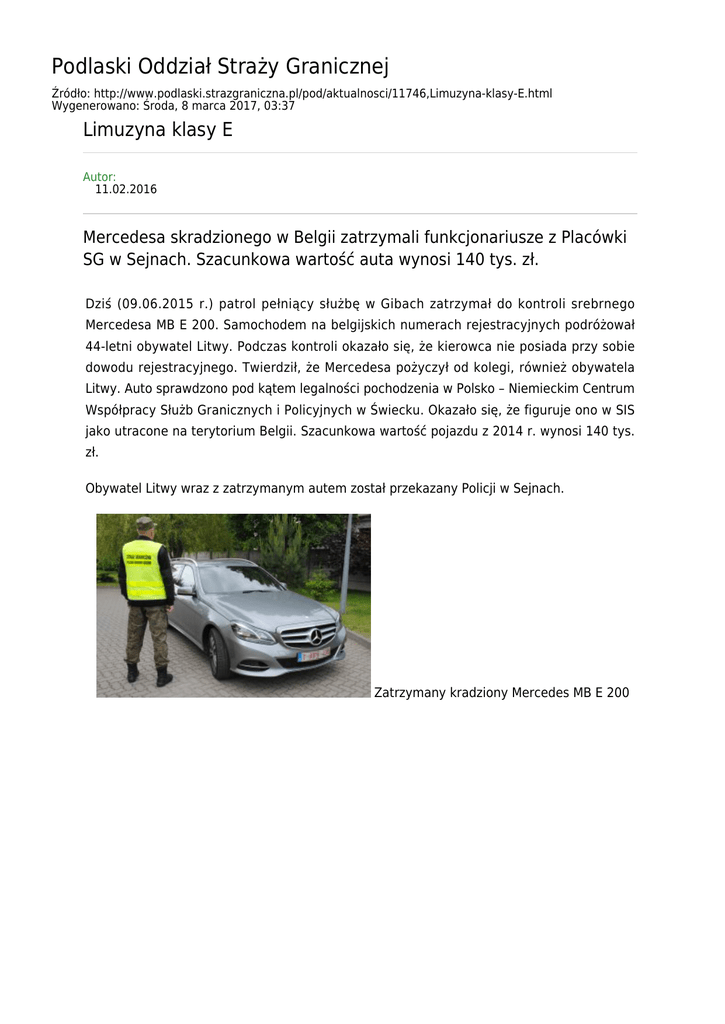 Podlaski Oddział Straży Granicznej Źródło: http://www.podlaski.strazgraniczna.pl/pod/aktualnosci/11746,Limuzyna-klasy-E.html Wygenerowano: Środa, 8 marca 2017, 03:37 Limuzyna klasy E Autor: 11.02.2016 Mercedesa skradzionego w Belgii zatrzymali funkcjonariusze z Placówki SG w Sejnach. Szacunkowa wartość auta wynosi 140 tys. zł. Dziś (09.06.2015 r.) patrol pełniący służbę w Gibach zatrzymał do kontroli srebrnego Mercedesa MB E 200. Samochodem na belgijskich numerach rejestracyjnych podróżował 44-letni obywatel Litwy. Podczas kontroli okazało się, że kierowca nie posiada przy sobie dowodu rejestracyjnego. Twierdził, że Mercedesa pożyczył od kolegi, również obywatela Litwy. Auto sprawdzono pod kątem legalności pochodzenia w Polsko – Niemieckim Centrum Współpracy Służb Granicznych i Policyjnych w Świecku. Okazało się, że figuruje ono w SIS jako utracone na terytorium Belgii. Szacunkowa wartość pojazdu z 2014 r. wynosi 140 tys. zł. Obywatel Litwy wraz z zatrzymanym autem został przekazany Policji w Sejnach. Zatrzymany kradziony Mercedes MB E 200