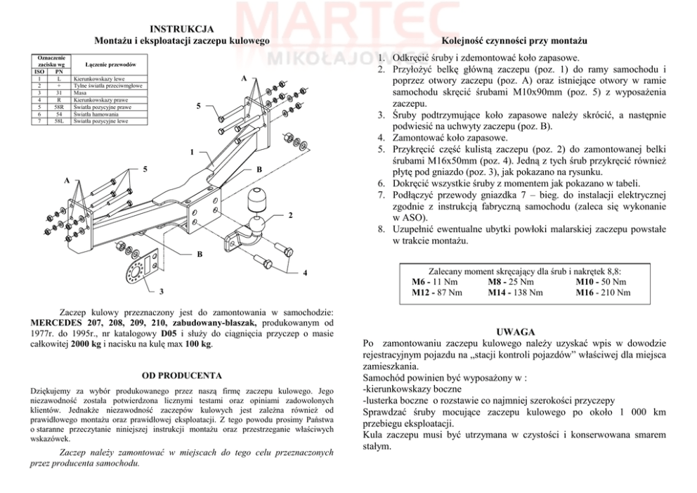 INSTRUKCJA MontaŜu i eksploatacji zaczepu kulowego Oznaczenie zacisku wg ISO PN 1 L 2 + 3 31 4 R 5 58R 6 54 7 58L Kolejność czynności przy montaŜu 1. Odkręcić śruby i zdemontować koło zapasowe. 2. PrzyłoŜyć belkę główną zaczepu (poz. 1) do ramy samochodu i poprzez otwory zaczepu (poz. A) oraz istniejące otwory w ramie samochodu skręcić śrubami M10x90mm (poz. 5) z wyposaŜenia zaczepu. 3. Śruby podtrzymujące koło zapasowe naleŜy skrócić, a następnie podwiesić na uchwyty zaczepu (poz. B). 4. Zamontować koło zapasowe. 5. Przykręcić część kulistą zaczepu (poz. 2) do zamontowanej belki śrubami M16x50mm (poz. 4). Jedną z tych śrub przykręcić równieŜ płytę pod gniazdo (poz. 3), jak pokazano na rysunku. 6. Dokręcić wszystkie śruby z momentem jak pokazano w tabeli. 7. Podłączyć przewody gniazdka 7 – bieg. do instalacji elektrycznej zgodnie z instrukcją fabryczną samochodu (zaleca się wykonanie w ASO). 8. Uzupełnić ewentualne ubytki powłoki malarskiej zaczepu powstałe w trakcie montaŜu. Łączenie przewodów A Kierunkowskazy lewe Tylne światła przeciwmgłowe Masa Kierunkowskazy prawe Światła pozycyjne prawe Światła hamowania Światła pozycyjne lewe 5 1 5 B A 2 B 4 3 Zaczep kulowy przeznaczony jest do zamontowania w samochodzie: MERCEDES 207, 208, 209, 210, zabudowany-blaszak, produkowanym od 1977r. do 1995r., nr katalogowy D05 i słuŜy do ciągnięcia przyczep o masie całkowitej 2000 kg i nacisku na kulę max 100 kg. OD PRODUCENTA Dziękujemy za wybór produkowanego przez naszą firmę zaczepu kulowego. Jego niezawodność została potwierdzona licznymi testami oraz opiniami zadowolonych klientów. JednakŜe niezawodność zaczepów kulowych jest zaleŜna równieŜ od prawidłowego montaŜu oraz prawidłowej eksploatacji. Z tego powodu prosimy Państwa o staranne przeczytanie niniejszej instrukcji montaŜu oraz przestrzeganie właściwych wskazówek. Zaczep naleŜy zamontować w miejscach do tego celu przeznaczonych przez producenta samochodu. Zalecany moment skręcający dla śrub i nakrętek 8,8: M6 - 11 Nm M8 - 25 Nm M10 - 50 Nm M12 - 87 Nm M14 - 138 Nm M16 - 210 Nm UWAGA Po zamontowaniu zaczepu kulowego naleŜy uzyskać wpis w dowodzie rejestracyjnym pojazdu na „stacji kontroli pojazdów” właściwej dla miejsca zamieszkania. Samochód powinien być wyposaŜony w : -kierunkowskazy boczne -lusterka boczne o rozstawie co najmniej szerokości przyczepy Sprawdzać śruby mocujące zaczepu kulowego po około 1 000 km przebiegu eksploatacji. Kula zaczepu musi być utrzymana w czystości i konserwowana smarem stałym. PPUH AUTO-HAK S.J. WyposaŜenie zaczepu kulowego: Produkcja Zaczepów Kulowych Henryk & Zbigniew Nejman 76-200 SŁUPSK ul. Słoneczna 16K tel/fax (059) 8-414-414; 8-414-413 E-mail: [email protected] www.autohak.com.pl Zaczep kulowy bez wyposaŜenia elektrycznego Klasa: A50-X Nr kat. D05 Przeznaczony do zamontowania w samochodzie: Producent: MERCEDES Model: 207, 208, 209, 210 Typ: zabudowany-blaszak produkowanym od 1977r. do 1995r. Dane techniczne: wartość siły D: 13,8 kN maksymalna masa przyczepy: 2000 kg maksymalny nacisk na kulę: 100 kg Numer homologacji zgodnie z dyrektywą 94/20/WE: e20*94/20*0392*00 KARTA GWARANCYJNA Producent udziela gwarancji niniejszą kartą gwarancyjną na okres 24 miesięcy licząc od dnia zakupu zaczepu kulowego do samochodu: MERCEDES 207, 208, 209, 210 zabudowany-blaszak produkowanego od 1977r. do 1995r. Data produkcji .............................. Data zakupu............................................. Zakres gwarancji obejmuje wyłącznie wady jakościowe wynikające z winy producenta. Gwarancja nie obejmuje natomiast uszkodzeń zawinionych przez nabywcę, wynikających z niewłaściwego montaŜu, uŜytkowania lub konserwacji, uszkodzeń mechanicznych, normalnego zuŜycia podczas eksploatacji itp. Gwarancja udzielona na zakupiony towar nie wyłącza, nie ogranicza ani nie zawiesza uprawnień kupującego wynikających z niezgodności towaru z umową. Reklamacje naleŜy zgłaszać w punkcie sprzedaŜy, składając jednocześnie kartę gwarancyjną. Usunięcie "wady" następuje po stwierdzeniu przez punkt sprzedaŜy wspólnie z producentem słuszności złoŜonej reklamacji. Reklamacja powinna być załatwiona w ciągu 14 dni od dnia uznania reklamacji. Karta gwarancyjna jest niewaŜna jeŜeli nie jest wypełniona i podpisana. Data zgłoszenia reklamacji: ................................................................... INFORMACJA WSTĘPNA Zaczep kulowy jest skonstruowany zgodnie z zasadami bezpieczeństwa ruchu drogowego. Zaczep kulowy jest elementem wpływającym na bezpieczeństwo jazdy i moŜe zostać zainstalowany wyłącznie przez personel wyspecjalizowany. Niedopuszczalne jest dokonywanie jakichkolwiek zmian w konstrukcji zaczepu. Powoduje to wygaśniecie dopuszczenia do stosowania. W przypadku obecności masy izolacyjnej lub osłony podwozia w miejscu przylegania zaczepu, naleŜy ją usunąć. Nieosłonięte miejsca karoserii oraz wywiercone otwory naleŜy pomalować farbą antykorozyjną. Informacjami wiąŜącymi odnośnie wartości obciąŜeń są dane podawane przez producenta samochodu, względnie wartości maksymalnej masy przyczepy oraz maksymalnego nacisku na kulę, przy czym wartości parametrów zaczepu kulowego nie mogą być przekroczone. Wzór do obliczania wartości siły D: Maks. masa przyczepy [kg] x Maks. masa samochodu [kg] Maks. masa przyczepy [kg] + Maks. masa samochodu [kg] X 9,81 = 1000 D [kN]