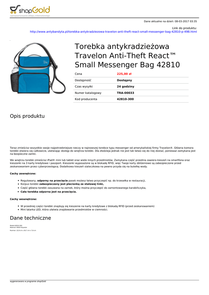 Dane aktualne na dzień: 08-03-2017 03:35 Link do produktu: http://www.antybandyta.pl/torebka-antykradziezowa-travelon-anti-theft-react-small-messenger-bag-42810-p-498.html Torebka antykradzieżowa Travelon Anti-Theft React™ Small Messenger Bag 42810 Cena 225,00 zł Dostępność Dostępny Czas wysyłki 24 godziny Numer katalogowy TRA-00033 Kod producenta 42810-300 Opis produktu Teraz zmieścisz wszystkie swoje najpotrzebniejsze rzeczy w najnowszej torebce typu messenger od amerykańskiej firmy Travelon®. Główna komora torebki otwiera się całkowicie, ułatwiając dostęp do wnętrza torebki. Dla złodzieja jednak nie jest tak łatwo się do niej dostać, ponieważ zamykana jest na bezpieczne zamki. We wnętrzu torebki zmieścisz iPad® mini lub tablet oraz wiele innych przedmiotów. Zamykana część przednia zawiera kieszeń na smartfona oraz kieszonki na 3 karty kredytowe i paszport. Kieszonki wyposażone są w blokadę RFID, więc Twoje karty zbliżeniowe są zabezpieczone przed zeskanowaniem przez cyberprzestępcę. Dodatkowa kieszeń siateczkowa na pewno przyda się na butelkę wody. Cechy zewnętrzne: Regulowany, odporny na przecięcie pasek możesz łatwo przyczepić np. do krzesełka w restauracji, Korpus torebki zabezpieczony jest plecionką ze stalowej linki, Część główna torebki zasuwana na zamek, który można przyczepić do zamontowanego karabińczyka, Cała torebka odporna jest na przecięcia. Cechy wewnętrzne: W przedniej części torebki znajdują się kieszenie na karty kredytowe z blokadą RFID (przed zeskanowaniem) Mini latarka LED, która ułatwia znajdowanie przedmiotów w ciemności. Dane techniczne Model:42810-300 Materiał: 900D Polyester Rozmiar: 22,8 cm x 26,7 cm x 7,6 cm wygenerowano w programie shopGold wygenerowano w programie shopGold Powered by TCPDF (www.tcpdf.org)