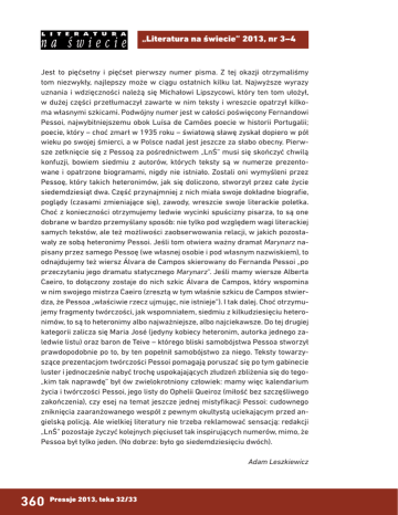„Literatura na świecie” 2013, nr 3–4 Jest to pięćsetny i pięćset pierwszy numer pisma. Z tej okazji otrzymaliśmy tom niezwykły, najlepszy może w ciągu ostatnich kilku lat. Najwyższe wyrazy uznania i wdzięczności należą się Michałowi Lipszycowi, który ten tom ułożył, w dużej części przetłumaczył zawarte w nim teksty i wreszcie opatrzył kilkoma własnymi szkicami. Podwójny numer jest w całości poświęcony Fernandowi Pessoi, najwybitniejszemu obok Luísa de Camões poecie w historii Portugalii; poecie, który – choć zmarł w 1935 roku – światową sławę zyskał dopiero w pół wieku po swojej śmierci, a w Polsce nadal jest jeszcze za słabo obecny. Pierwsze zetknięcie się z Pessoą za pośrednictwem „LnŚ” musi się skończyć chwilą konfuzji, bowiem siedmiu z autorów, których teksty są w numerze prezentowane i opatrzone biogramami, nigdy nie istniało. Zostali oni wymyśleni przez Pessoę, który takich heteronimów, jak się doliczono, stworzył przez całe życie siedemdziesiąt dwa. Część przynajmniej z nich miała swoje dokładne biografie, poglądy (czasami zmieniające się), zawody, wreszcie swoje literackie poletka. Choć z konieczności otrzymujemy ledwie wycinki spuścizny pisarza, to są one dobrane w bardzo przemyślany sposób: nie tylko pod względem wagi literackiej samych tekstów, ale też możliwości zaobserwowania relacji, w jakich pozostawały ze sobą heteronimy Pessoi. Jeśli tom otwiera ważny dramat Marynarz napisany przez samego Pessoę (we własnej osobie i pod własnym nazwiskiem), to odnajdujemy też wiersz Álvara de Campos skierowany do Fernanda Pessoi „po przeczytaniu jego dramatu statycznego Marynarz”. Jeśli mamy wiersze Alberta Caeiro, to dołączony zostaje do nich szkic Álvara de Campos, który wspomina w nim swojego mistrza Caeiro (zresztą w tym właśnie szkicu de Campos stwierdza, że Pessoa „właściwie rzecz ujmując, nie istnieje”). I tak dalej. Choć otrzymujemy fragmenty twórczości, jak wspomniałem, siedmiu z kilkudziesięciu heteronimów, to są to heteronimy albo najważniejsze, albo najciekawsze. Do tej drugiej kategorii zalicza się Maria José (jedyny kobiecy heteronim, autorka jednego zaledwie listu) oraz baron de Teive – którego bliski samobójstwa Pessoa stworzył prawdopodobnie po to, by ten popełnił samobójstwo za niego. Teksty towarzyszące prezentacjom twórczości Pessoi pomagają poruszać się po tym gabinecie luster i jednocześnie nabyć trochę uspokajających złudzeń zbliżenia się do tego„kim tak naprawdę” był ów zwielokrotniony człowiek: mamy więc kalendarium życia i twórczości Pessoi, jego listy do Ophelii Queiroz (miłość bez szczęśliwego zakończenia), czy esej na temat jeszcze jednej mistyfikacji Pessoi: cudownego zniknięcia zaaranżowanego wespół z pewnym okultystą uciekającym przed angielską policją. Ale wielkiej literatury nie trzeba reklamować sensacją: redakcji „LnŚ” pozostaje życzyć kolejnych pięciuset tak inspirujących numerów, mimo, że Pessoa był tylko jeden. (No dobrze: było go siedemdziesięciu dwóch). Adam Leszkiewicz 360 Pressje 2013, teka 32/33