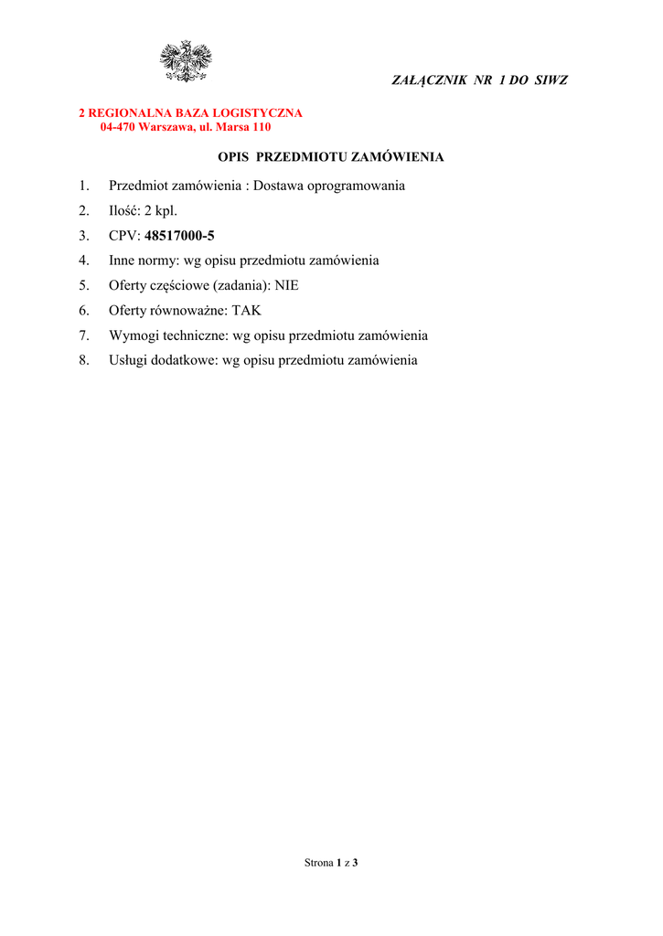 1. Przedmiot zamówienia : Dostawa oprogramowania 2. Ilość: 2 kpl
