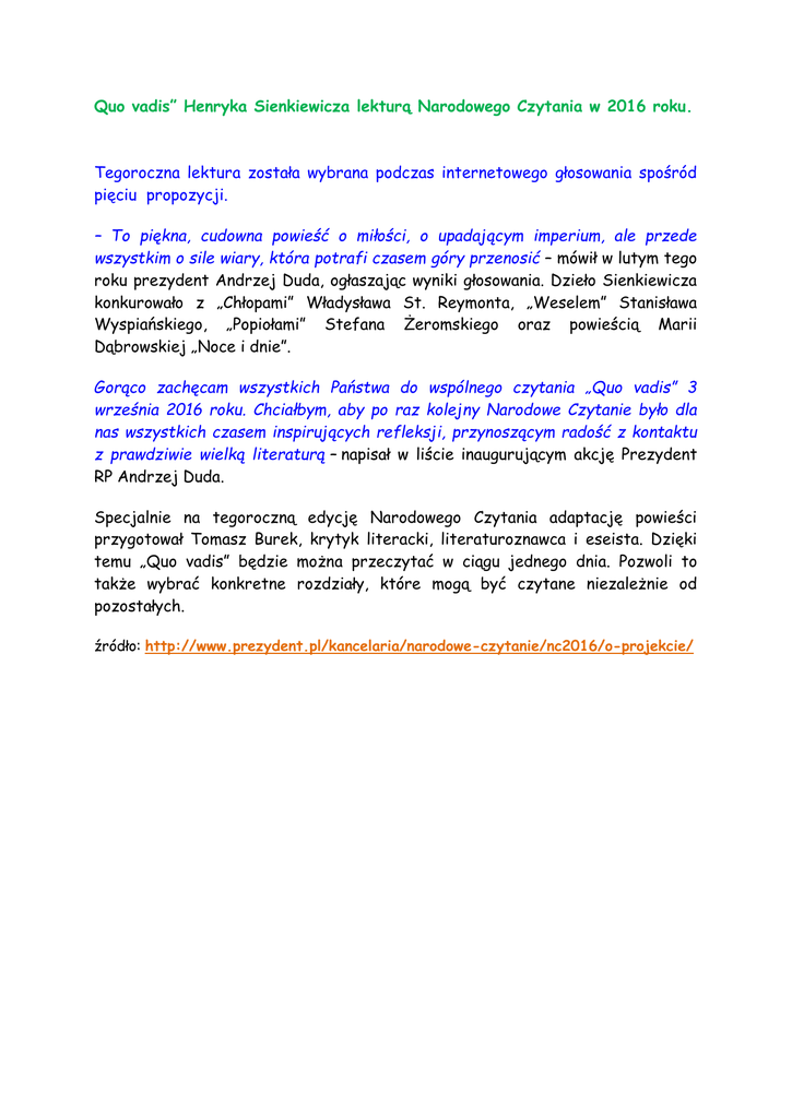 Quo vadis” Henryka Sienkiewicza lekturą Narodowego Czytania w 2016 roku. Tegoroczna lektura została wybrana podczas internetowego głosowania spośród pięciu propozycji. – To piękna, cudowna powieść o miłości, o upadającym imperium, ale przede wszystkim o sile wiary, która potrafi czasem góry przenosić – mówił w lutym tego roku prezydent Andrzej Duda, ogłaszając wyniki głosowania. Dzieło Sienkiewicza konkurowało z „Chłopami” Władysława St. Reymonta, „Weselem” Stanisława Wyspiańskiego, „Popiołami” Stefana Żeromskiego oraz powieścią Marii Dąbrowskiej „Noce i dnie”. Gorąco zachęcam wszystkich Państwa do wspólnego czytania „Quo vadis” 3 września 2016 roku. Chciałbym, aby po raz kolejny Narodowe Czytanie było dla nas wszystkich czasem inspirujących refleksji, przynoszącym radość z kontaktu z prawdziwie wielką literaturą – napisał w liście inaugurującym akcję Prezydent RP Andrzej Duda. Specjalnie na tegoroczną edycję Narodowego Czytania adaptację powieści przygotował Tomasz Burek, krytyk literacki, literaturoznawca i eseista. Dzięki temu „Quo vadis” będzie można przeczytać w ciągu jednego dnia. Pozwoli to także wybrać konkretne rozdziały, które mogą być czytane niezależnie od pozostałych. źródło: http://www.prezydent.pl/kancelaria/narodowe-czytanie/nc2016/o-projekcie/