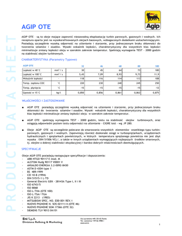 AGIP OTE AGIP OTE – są to oleje mające zapewnić niezawodną eksploatację turbin parowych, gazowych i wodnych. Ich receptura oparta jest na wysokorafinowanych olejach bazowych, wzbogaconych dodatkami uszlachetniającymi. Posiadają szczególnie wysoką odporność na utlenianie i starzenie, przy jednoczesnym braku skłonności do tworzenia szlamów i osadów. Wysoki wskaźnik lepkości, charakterystyczny dla wszystkich klas lepkości minimalizuje zmiany lepkości oleju w szerokim zakresie temperatur. Spełniają wymagania TEST - 2000 godzin na stabilność olejów turbinowych. CHARAKTERYSTYKA (Parametry Typowe) AGIP OTE 32 46 68 80 100 2 30 45 64 73 100 Lepkość w 100°C 2 mm / s 5,45 7,09 8,93 9,73 11,9 Wskaźnik lepkości - 118 116 114 113 108 Temp. zapłonu COC °C 220 230 240 245 250 Temp. płynięcia °C -15 -15 -15 -15 -12 Gęstość w 15°C kg/l 0,850 0,856 0,861 0,863 0,875 Lepkość w 40°C mm / s WŁAŚCIWOŚCI I ZASTOSOWANIE ■ AGIP OTE posiadają szczególnie wysoką odporność na utlenianie i starzenie, przy jednoczesnym braku skłonności do tworzenia szlamów i osadów. Wysoki wskaźnik lepkości, charakterystyczny dla wszystkich klas lepkości minimalizuje zmiany lepkości oleju w szerokim zakresie temperatur. ■ AGIP OTE spełniają wymagania TEST - 2000 godzin, testu na stabilność olejów osiągają odpowiedni poziom testu odporności na utlenianie - CIGRE test - wg .IP 280. ■ Oleje AGIP OTE są szczególnie polecane do smarowania wszystkich elementów wszelkiego typu turbin: parowych, gazowych i wodnych. Zapewniają równieŜ doskonałe osiągi w turbospręŜarkach, urządzeniach hydraulicznych i spręŜarkach powietrznych, w których temperatura spręŜanego powietrza nie jest zbyt wysoka /DIN 51506 VCL/, a takŜe w innych urządzeniach wymagających najlepszych środków smarowych, tj. olejów o dobrej stabilności oksydacyjnej i bardzo dobrych właściwościach deemulgujących. turbinowych, oraz SPECYFIKACJE Oleje AGIP OTE posiadają następujące specyfikacje i dopuszczenia: ABB HTGD 90117 E mod. M ALSTOM Hudg 90117 V0001 V ANSALDO ENERGIA 3.2-0092-8430 ASTM D 4304 type 1 BS 489:1999 CEI 10-8 (1994) DIN 51515-1 L-TD General Electric GEK - 28143A Type I, II i III ISO 6743/5 ISO 8068 ISO-L-THA (OTE 100) ISO-L-TSA/-TGA JIS K 2213 – (1983) MITSUBISHI SPEC. NO. E00-001 REV.1 NUOVO PIGNONE N. SOS 02111/4 (OTE 46) NUOVO PIGNONE SOM 17366 (OTE 32) SIEMENS TLV 9013 04/01 1