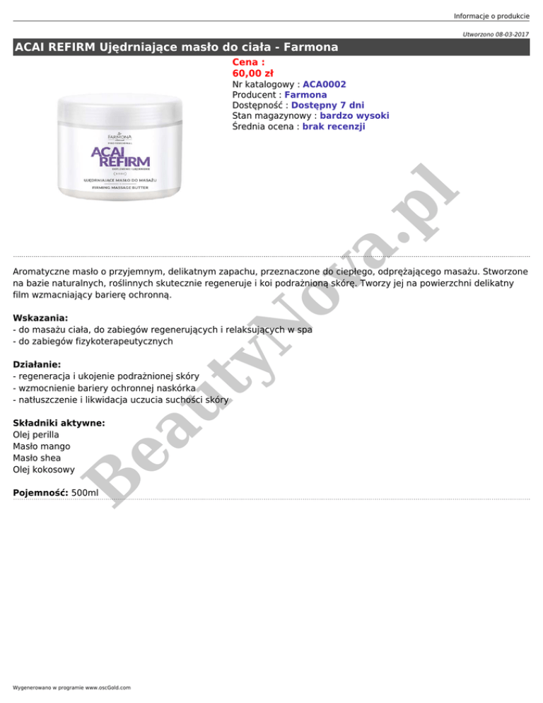 Informacje o produkcie Utworzono 08-03-2017 ACAI REFIRM Ujędrniające masło do ciała - Farmona Cena : 60,00 zł a. pl Nr katalogowy : ACA0002 Producent : Farmona Dostępność : Dostępny 7 dni Stan magazynowy : bardzo wysoki Średnia ocena : brak recenzji ov Aromatyczne masło o przyjemnym, delikatnym zapachu, przeznaczone do ciepłego, odprężającego masażu. Stworzone na bazie naturalnych, roślinnych skutecznie regeneruje i koi podrażnioną skórę. Tworzy jej na powierzchni delikatny film wzmacniający barierę ochronną. yN Wskazania: - do masażu ciała, do zabiegów regenerujących i relaksujących w spa - do zabiegów fizykoterapeutycznych B ea Składniki aktywne: Olej perilla Masło mango Masło shea Olej kokosowy ut Działanie: - regeneracja i ukojenie podrażnionej skóry - wzmocnienie bariery ochronnej naskórka - natłuszczenie i likwidacja uczucia suchości skóry Pojemność: 500ml Wygenerowano w programie www.oscGold.com