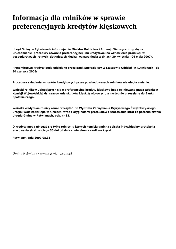 Informacja dla rolników w sprawie preferencyjnych kredytów klęskowych Urząd Gminy w Rytwianach informuje, że Minister Rolnictwa i Rozwoju Wsi wyraził zgodę na uruchomienie procedury otwarcia preferencyjnej linii kredytowej na wznowienie produkcji w gospodarstwach rolnych dotkniętych klęską wymarznięcia w dniach 30 kwietnia - 04 maja 2007r. Przedmiotowe kredyty będą udzielane przez Bank Spółdzielczy w Staszowie Oddział w Rytwianach do 30 czerwca 2008r. Procedura składania wniosków kredytowych przez poszkodowanych rolników nie uległa zmianie. Wnioski rolników ubiegających się o preferencyjne kredyty klęskowe będą opiniowane przez członków Komisji Wojewódzkiej ds. szacowania skutków klęsk żywiołowych, a następnie przesyłane do Banku Spółdzielczego. Wnioski kredytowe rolnicy winni przesyłać do Wydziału Zarządzania Kryzysowego Świętokrzyskiego Urzędu Wojewódzkiego w Kielcach wraz z oryginałami protokołów z szacowania strat za pośrednictwem Urzędu Gminy w Rytwianach, pok. nr 33. O kredyty mogą ubiegać się tylko rolnicy, u których komisja gminna spisała indywidualny protokół z szacowania strat w ciągu 30 dni od dnia stwierdzenia skutków klęski. Rytwiany, dnia 2007.08.31 Gmina Rytwiany - www.rytwiany.com.pl