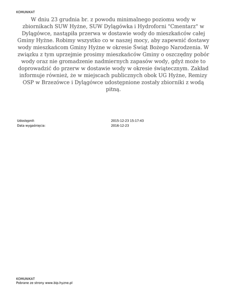 KOMUNIKAT W dniu 23 grudnia br. z powodu minimalnego poziomu wody w zbiornikach SUW Hyżne, SUW Dylągówka i Hydroforni "Cmentarz" w Dylągówce, nastąpiła przerwa w dostawie wody do mieszkańców całej Gminy Hyżne. Robimy wszystko co w naszej mocy, aby zapewnić dostawy wody mieszkańcom Gminy Hyżne w okresie Świąt Bożego Narodzenia. W związku z tym uprzejmie prosimy mieszkańców Gminy o oszczędny pobór wody oraz nie gromadzenie nadmiernych zapasów wody, gdyż może to doprowadzić do przerw w dostawie wody w okresie świątecznym. Zakład informuje również, że w miejscach publicznych obok UG Hyżne, Remizy OSP w Brzezówce i Dylągówce udostępnione zostały zbiorniki z wodą pitną. Udostępnił: 2015-12-23 15:17:43 Data wygaśnięcia: 2016-12-23 KOMUNIKAT Pobrane ze strony www.bip.hyzne.pl