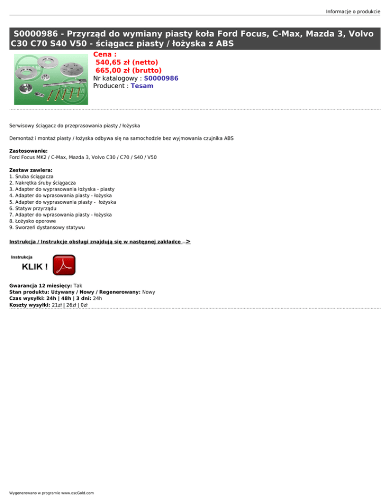 Informacje o produkcie S0000986 - Przyrząd do wymiany piasty koła Ford Focus, C-Max, Mazda 3, Volvo C30 C70 S40 V50 - ściągacz piasty / łożyska z ABS Cena : 540,65 zł (netto) 665,00 zł (brutto) Nr katalogowy : S0000986 Producent : Tesam Serwisowy ściągacz do przeprasowania piasty / łożyska Demontaż i montaż piasty / łożyska odbywa się na samochodzie bez wyjmowania czujnika ABS Zastosowanie: Ford Focus MK2 / C-Max, Mazda 3, Volvo C30 / C70 / S40 / V50 Zestaw zawiera: 1. Śruba ściągacza 2. Nakrętka śruby ściągacza 3. Adapter do wyprasowania łożyska - piasty 4. Adapter do wprasowania piasty - łożyska 5. Adapter do wyprasowania piasty - łożyska 6. Statyw przyrządu 7. Adapter do wprasowania piasty - łożyska 8. Łożysko oporowe 9. Sworzeń dystansowy statywu Instrukcja / Instrukcje obsługi znajdują się w następnej zakładce Gwarancja 12 miesięcy: Tak Stan produktu: Używany / Nowy / Regenerowany: Nowy Czas wysyłki: 24h | 48h | 3 dni: 24h Koszty wysyłki: 21zł | 26zł | 0zł Wygenerowano w programie www.oscGold.com > ----
