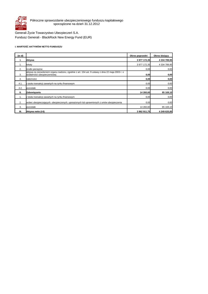 Półroczne sprawozdanie ubezpieczeniowego funduszu kapitałowego sporządzone na dzień 31.12.2012 Generali Życie Towarzystwo Ubezpieczeń S.A. Fundusz Generali - BlackRock New Energy Fund (EUR) I. WARTOŚĆ AKTYWÓW NETTO FUNDUSZU (w zł) Okres poprzedni Okres bieżący I. Aktywa 3 977 172,35 4 334 789,95 1. lokaty 3 977 172,35 4 334 789,95 2. 0,00 0,00 3. środki pieniężne aktywa za zezwoleniem organu nadzoru, zgodnie z art. 154 ust. 9 ustawy z dnia 22 maja 2003 r. o działalności ubezpieczeniowej 0,00 0,00 4. należności 0,00 0,00 4.1. z tytułu transakcji zawartych na rynku finansowym 0,00 0,00 4.2. pozostałe 0,00 0,00 14 260,60 85 169,10 0,00 0,00 II. Zobowiązania 1. z tytułu transakcji zawartych na rynku finansowym 2. wobec ubezpieczających, ubezpieczonych, uposażonych lub uprawnionych z umów ubezpieczenia 3. pozostałe III. Aktywa netto (I-II) 0,00 0,00 14 260,60 85 169,10 3 962 911,75 4 249 620,85 Półroczne sprawozdanie ubezpieczeniowego funduszu kapitałowego sporządzone na dzień 31.12.2012 Generali Życie Towarzystwo Ubezpieczeń S.A. Fundusz Generali - BlackRock New Energy Fund (EUR) II. ZMIANY AKTYWÓW NETTO FUNDUSZU (w zł) Okres poprzedni Okres bieżący A. Aktywa netto funduszu na początek okresu sprawozdawczego 2 982 749,22 B. Stan netto z działalności operacyjnej (I-II) 1 324 181,08 558 607,00 I. Zwiększenia funduszu 2 487 855,20 1 915 956,08 1. tytułem składek zwiększających wartość funduszu 1 892 872,58 1 637 263,00 2. pozostałe przychody 0,00 0,00 3. pozostałe zwiększenia II. Zmniejszenia funduszu 1. tytułem wykupu 2. tytułem wypłat pozostałych świadczeń ubezpieczeniowych 3. tytułem opłat za ryzyko ubezpieczeniowe oraz innych opłat potrącanych z funduszu 4. tytułem zwrotu składek ubezpieczeniowych 5. tytułem opłat za zarządzanie funduszem oraz innych opłat tytułem administrowania funduszem 6. pozostałe koszty 7. pozostałe zmniejszenia C. Wynik netto z działalności inwestycyjnej D. Aktywa netto funduszu na koniec okresu sprawozdawczego 3 962 911,75 594 982,62 278 693,08 1 163 674,12 1 357 349,08 210 935,49 435 332,15 0,00 2 737,01 43 167,70 3 053,04 0,00 0,00 65 769,52 78 483,79 0,00 0,00 843 801,41 837 743,09 -344 018,55 -271 897,90 3 962 911,75 4 249 620,85 Półroczne sprawozdanie ubezpieczeniowego funduszu kapitałowego sporządzone na dzień 31.12.2012 Generali Życie Towarzystwo Ubezpieczeń S.A. Fundusz Generali - BlackRock New Energy Fund (EUR) III. LICZBA I WARTOŚĆ JEDNOSTEK ROZRACHUNKOWYCH ( w zł ) 1. Okres poprzedni Okres bieżący Liczba jednostek rozrachunkowych: 1.1. liczba jednostek rozrachunkowych na początek okresu sprawozdawczego 135 704,728 200 275,518 1.2. liczba jednostek rozrachunkowych na koniec okresu sprawozdawczego 200 275,518 229 467,364 2. Wartość jednostki rozrachunkowej ( w zł ): 2.1. wartość jednostki rozrachunkowej na początek okresu sprawozdawczego 21,9797 19,7873 2.2 minimalna wartość jednostki rozrachunkowej w okresie sprawozdawczym 17,4949 17,9772 2.3. maksymalna wartość jednostki rozrachunkowej w okresie sprawozdawczym 23,1062 20,9155 2.4. wartość jednostki rozrachunkowej na koniec okresu sprawozdawczego 19,7873 18,5195 Półroczne sprawozdanie ubezpieczeniowego funduszu kapitałowego sporządzone na dzień 31.12.2012 Generali Życie Towarzystwo Ubezpieczeń S.A. Fundusz Generali - BlackRock New Energy Fund (EUR) IV. ZESTAWIENIE AKTYWÓW NETTO FUNDUSZU 1 I. Wartośc bilansowa (w zł) Udział w aktywach funduszu (w %) 2 3 2. Lokaty (suma 1-12) papiery wartościowe emitowane, poręczone lub gwarantowane przez Skarb Państwa lub organizacje międzynarodowe, których członkiem jest Rzeczpospolita Polska obligacje emitowane lub poręczone przez jednostki samorządu terytorialnego lub związki jednostek samorządu terytorialnego 0,00 0,00% 3. inne dłużne papiery wartościowe o stałej stopie dochodu 0,00 0,00% 4. akcje 0,00 0,00% 5. 6. 0,00 4 334 789,95 0,00% 100,00% 7. udziały jednostki uczestnictwa i certyfikaty inwestycyjne w funduszach inwestycyjnych instrumenty pochodne, o ile służą zmniejszeniu ryzyka związanego z innymi aktywami stanowiącymi pokrycie rezerw techniczno-ubezpieczeniowych 0,00 0,00% 8. inne papiery wartościowe o zmiennej kwocie dochodu 0,00 0,00% 9. pożyczki 0,00 0,00% 10. nieruchomości 0,00 0,00% 11. depozyty bankowe 0,00 0,00% 12. 0,00 0,00% II. pozostałe lokaty Aktywa za zezwoleniem organu nadzoru, zgodnie z art. 154 ust. 9 ustawy z dnia 22 maja 2003 r. o działalności ubezpieczeniowej 0,00 0,00% III. Środki pieniężne 0,00 0,00% IV. Należności 0,00 0,00% V. Zobowiązania VI. Aktywa netto (w tym) 1. krajowe 2. zagraniczne - kraje UE 3. zagraniczne - kraje poza UE 1. 4 334 789,95 100,00% 0,00 0,00% 85 169,10 1,96% 4 249 620,85 98,04% -85 169,10 -1,96% 4 334 789,95 100,00% 0,00 0,00%