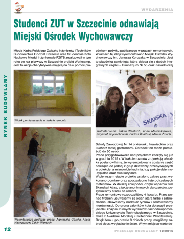 WYDA RZEN I A Studenci ZUT w Szczecinie odnawiają Miejski Ośrodek Wychowawczy Widok pomieszczenia w trakcie remontu Wolontariusze: Żaklin Wantuch, Anna Marcinkiewicz, Krzysztof Wojciechowski, Bartosz Kosiński, Marcin Żmuda Wolontariusze podczas pracy: Agnieszka Górska, Alicja Hawryszków, Żaklin Wantuch 12 fot. Krzysztof Wojciechowski fot. Alicja Hawryszków cówkom pożytku publicznego w pracach remontowych. W ramach tej akcji wyremontowano Miejski Ośrodek Wychowawczy im. Janusza Korczaka w Szczecinie. Jest to placówka zamknięta, która składa się z dwóch integralnych części – Gimnazjum Nr 53 oraz Zasadniczej fot. Krzysztof Wojciechowski R YNE K BUDOWLANY Młoda Kadra Polskiego Związku Inżynierów i Techników Budownictwa Oddział Szczecin oraz Studenckie Koło Naukowe Młodzi Inżynierowie PZITB zrealizowali w tym roku po raz pierwszy w Szczecinie projekt Workcamp. Jest to akcja charytatywna mającą na celu pomoc pla- Szkoły Zawodowej Nr 14 o kierunku krawieckim oraz kucharz małej gastronomi. Ośrodek ten może pomieścić do 60 osób. Prace przygotowawcze nad projektem zaczęły się już w grudniu 2015 r. W trakcie rozmów z dyrekcją ośrodka postanowiliśmy, że wyremontowana zostanie część należąca do jednej z grup dziewcząt przebywających w obiekcie, a mianowicie kuchnia, trzy pokoje dzienno-sypialne oraz dwa korytarze. W pierwszym etapie projektu ustalono zakres prac, wykonano pomiary oraz sporządzono listę potrzebnych materiałów. W dalszej kolejności, dzięki wsparciu firm Skanska i Atlas, a także anonimowych darczyńców, pozyskaliśmy środki na remont. Prace remontowe rozpoczęliśmy 4 lipca br. Przez ponad tydzień usuwaliśmy ze ścian starą farbę i zabrudzenia, skuwaliśmy nadmiar tynków i szlifowaliśmy nierówności. Do grona członków koła dołączyli przyjaciele i znajomi z innych wydziałów Zachodniopomorskiego Uniwersytetu Technologicznego w Szczecinie, także z Akademii Morskiej i Politechniki Wrocławskiej. Dzięki temu, po prawie 9 dniach pracy, mogliśmy zabrać się za wygładzanie ścian. W tym miejscu warto doPRzeg l Ąd bu d owl any 12/2016 Efekty końcowe dwutygodniowych prac wolontariuszy dać, że w kilka dni prawie 300 m2 ścian wyszpachlowały głównie dwie koleżanki. W tym czasie reszta ekipy szlifowała powierzchnie ścian i przygotowywała wnę- trza do malowania. Trzy dni przed końcem prac, przy pomocy ekipy fachowców z firmy Skanska, w pomieszczeniu kuchennym zostały położone ceramiczne płytki okładzinowe na ponad 10 m2. Prace zakończono 21.07.2016 r. Dzięki wsparciu ww. firm, w postaci materiałów budowlanych i doradztwa technicznego, udało nam się w 14 dni odnowić i pomalować około 400 m2 powierzchni ścian i sufitów, położyć kilka metrów kwadratowych płytek ceramicznych oraz wymienić najbardziej uszkodzone szafki kuchenne. Jednak projekt Workcamp to nie tylko praca fizyczna. Podczas tych dwóch tygodni mogliśmy wykorzystać w praktyce wiedzę zdobytą podczas studiowania, nauczyć się nowych umiejętności, dzielić się swoją wiedzą z innymi, zyskać nowych przyjaciół. Nauczyliśmy się współpracować i wspierać się wzajemnie. Mimo różnych przeszkód wynikających z usterek technicznych i nieprzewidzianych sytuacji w czasie prac remontowych udało nam się skończyć projekt Workcamp Szczecin 2016 w oczekiwanym terminie. Dodatkową satysfakcję czerpiemy z faktu, iż to przedsięwzięcie realizowaliśmy pierwszy raz i wszystkie nasze zamierzenia doprowadziliśmy do finału. Mamy nadzieję, że dzięki współpracy z firmami i ludźmi dobrej woli uda się przygotować drugą edycję w przyszłym roku. Żaklin Wantuch, Krzysztof Wojciechowski Polski Związek Inżynierów i Techników Budownictwa przy współudziale R YNE K BUDOWLANY fot. Alicja Hawryszków WYDAR ZEN I A Ministerstwa Infrastruktury i Budownictwa oraz Głównego Urzędu Nadzoru Budowlanego ogłaszają: Konkurs PZITB BUDOWA ROKU 2016 edycja XXVII Konkurs organizowany jest od ponad 25 lat. Promuje on polskie budownictwo oraz firmy budowlane, znacząco przyczyniając się do ich rozwoju. Dzięki bogatej tradycji „Budowa Roku” stała się jednym z najbardziej prestiżowych przeglądów osiągnięć polskiego budownictwa. Uczestnicy wszystkich naszych edycji oddali do użytku ponad 1300 inwestycji w całej Polsce. Dotychczas w Konkursie brało udział ponad 1600 inwestorów, developerów, generalnych wykonawców orazz jednostek projektowych, co dobitnie świadczy o tym, że Konkurs BUDOWA ROKU skupia elitę polskich uczestników procesu inwestycyjnego. Serdecznie zapraszamy do udziału www.budowaroku.pl BR_do_PB_175x125.indd 1 PR zeglĄ d bu d ow l an y 12/2016 13/10/16 9:59:31 AM 13