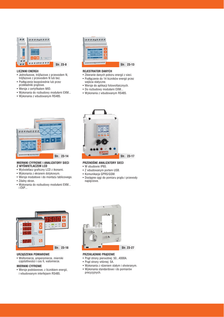 Str. 23-8 LICZNIKI ENERGII • Jednofazowe, trójfazowe z przewodem N, trójfazowe z przewodem N lub bez. • Podłączenie bezpośrednie lub przez przekładniki prądowe. • Wersje z certyfikatem MID. • Wykonania do rozbudowy modułami EXM... • Wykonania z wbudowanym RS485. Str. 23-14 MIERNIKI CYFROWE I ANALIZATORY SIECI Z WYŚWIETLACZEM LCD • Wyświetlacz graficzny LCD z ikonami. • Wykonania z ekranem dotykowym. • Wersje modułowe i do montażu tablicowego. • Zdalny ekran. • Wykonania do rozbudowy modułami EXM... i EXP... Str. 23-18 URZĄDZENIA POMIAROWE • Woltomierze, amperomierze, mierniki częstotliwości i cos fi, watomierze. MIERNIKI CYFROWE • Wersje podstawowe, z licznikiem energii, i wbudowanym interfejsem RS485. Str. 23-13 REJESTRATOR DANYCH • Zbieranie danych poboru energii z sieci. • Podłączenie do 14 liczników energii przez wejścia statyczne. • Wersje do aplikacji fotowoltaicznych. • Do rozbudowy modułami EXM... • Wykonania z wbudowanym RS485. Str. 23-17 PRZENOŚNE ANALIZATORY SIECI • W obudowie IP65. • Z wbudowanym portem USB. • Komunikacja GPRS/GSM. • Dostępne cęgi do pomiaru prądu i przewody napięciowe. Str. 23-27 PRZEKŁADNIKI PRĄDOWE • Prąd strony pierwotnej: 50...4000A. • Prąd strony wtórnej: 5A. • Wykonania z rdzeniem stałym i otwieranym. • Wykonania standardowe i do pomiarów precyzyjnych. URZĄDZENIA 23 POMIAROWE I PRZEKŁADNIKI PRĄDOWE Cyfrowe woltomierze, amperomierze, watomierze, mierniki częstotliwości i cos fi. Cyfrowe mierniki i analizatory sieci, z możliwością rozbudowy oraz wyświetlaczem graficznym LCD. Możliwość stosowania w układach jednofazowych, dwufazowych i trójfazowych. Idealne do zastosowania w systemach dystrybucji energii, kogeneracji, agregatów prądotwórczych i instalacji w maszynach. Wysoka dokładność pomiarów. Całkowicie programowalne wejścia i wyjścia cyfrowe. Interfejsy komunikacji do programowania i zdalnej kontroli: RS485, RS232, USB, Ethernet, Profibus-DP. Liczniki energii ROZDZ. - STR. Jednofazowe..................................................................................................................................................................... Jednofazowe, certyfikat MID ........................................................................................................................................... Trójfazowe z przewodem N lub bez .................................................................................................................................. Trójfazowe z przewodem N, certyfikat MID ..................................................................................................................... Trójfazowe z przewodem N lub bez, certyfikat UTF .......................................................................................................... 23 23 23 23 23 - 8 9 10 11 12 Rejestratory danych Zastosowanie ogólne ....................................................................................................................................................... Zastosowanie do monitoringu i zarządzania w układach fotowoltaiki .............................................................................. 23 - 13 23 - 13 Cyfrowe urządzenia pomiarowe Modułowe mierniki z wyświetlaczem LCD ....................................................................................................................... Tablicowe mierniki z wyświetlaczem LCD ........................................................................................................................ Tablicowe analizatory sieci z dotykowym wyświetlaczem LCD ........................................................................................ Tablicowe urządzenia pomiarowe z wyświetlaczem LED ................................................................................................. Tablicowe mierniki z wyświetlaczem LED ........................................................................................................................ Modułowe urządzenia pomiarowe z wyświetlaczem LED ................................................................................................ 23 23 23 23 23 23 - 14 16 17 18 20 23 Urządzenia do komunikacji, osłony ochronne, akcesoria .......................................................... 23 - 25 Konwertery, bramki, kable łączące ..................................................................................... 23 - 26 Przekładniki prądowe ..................................................................................................... 23 - 27 Z ARZĄDZANIE ENERGIĄ Wymiary ..................................................................................................................... 23 - 30 Schematy elektryczne ..................................................................................................... 23 - 33 Dane techniczne ............................................................................................................ 23 - 36 Urządzenia pomiarowe i przekładniki prądowe SYSTEM ZARZĄDZANIA DMG 900 + EXP10 31 Jakość Energii według EN 50160 Stacja transformatorowa SN/nn DMG 800 + EXP10 04 Kontrola temperatury Rozdzielnia główna DME D310 (T2 MID) DMG 800 DMG 800 DMG 700 DMG 600 - DMG 610 M Rozdzielnia sekcyjna 23 M DME D310 T2 DME D300 T2 M DMG 100 DMG 110 DMG 800 + EXP… Kontrola procesu i warunków otoczenia DMG 300 DMG 210 DMG 200 DME D330 M DME D100 T1 DME D110 T1 DME D115 T1 DME D120 T1 DME CD 23-2 Urządzenia pomiarowe i przekładniki prądowe MONITORING URZĄDZEŃ LOVATO ELECTRIC Analizator sieci + Modem GSM (modbus ASCII) Modem Synergy Regulator współczynnika mocy Miernik Przełacznik układu SZR Konwertery RS485/Ethernet Liczniki energii Mikro PLC Softstarty VL Napedy do regulacji predkości Miernik Liczniki energii DME z wyj. impulsowym Ethernet 23 Informacje o procesie i otoczeniu RS485 Sygnał elektryczny 23-3 Urządzen