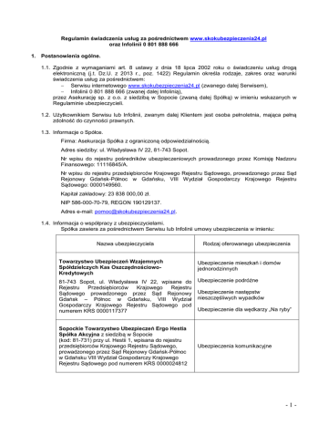 Regulamin świadczenia usług za pośrednictwem www.skokubezpieczenia24.pl oraz Infolinii 0 801 888 666 1. Postanowienia ogólne. 1.1. Zgodnie z wymaganiami art. 8 ustawy z dnia 18 lipca 2002 roku o świadczeniu usług drogą elektroniczną (j.t. Dz.U. z 2013 r., poz. 1422) Regulamin określa rodzaje, zakres oraz warunki świadczenia usług za pośrednictwem: Serwisu internetowego www.skokubezpieczenia24.pl (zwanego dalej Serwisem), Infolinii 0 801 888 666 (zwanej dalej Infolinią), przez Asekurację sp. z o.o. z siedzibą w Sopocie (zwaną dalej Spółką) w imieniu wskazanych w Regulaminie ubezpieczycieli. 1.2. Użytkownikiem Serwisu lub Infolinii, zwanym dalej Klientem jest osoba pełnoletnia, mająca pełną zdolność do czynności prawnych. 1.3. Informacje o Spółce. Firma: Asekuracja Spółka z ograniczoną odpowiedzialnością. Adres siedziby: ul. Władysława IV 22, 81-743 Sopot. Nr wpisu do rejestru pośredników ubezpieczeniowych prowadzonego przez Komisję Nadzoru Finansowego: 11116845/A. Nr wpisu do rejestru przedsiębiorców Krajowego Rejestru Sądowego, prowadzonego przez Sąd Rejonowy Gdańsk-Północ w Gdańsku, VIII Wydział Gospodarczy Krajowego Rejestru Sądowego: 0000149560. Kapitał zakładowy: 23 838 000,00 zł. NIP 586-000-70-79, REGON 190129137. Adres e-mail: [email protected]. 1.4. Informacja o współpracy z ubezpieczycielami. Spółka zawiera za pośrednictwem Serwisu lub Infolinii umowy ubezpieczenia w imieniu: Nazwa ubezpieczyciela Rodzaj oferowanego ubezpieczenia Towarzystwo Ubezpieczeń Wzajemnych Spółdzielczych Kas OszczędnościowoKredytowych Ubezpieczenie mieszkań i domów jednorodzinnych 81-743 Sopot, ul. Władysława IV 22, wpisane do Rejestru Przedsiębiorców Krajowego Rejestru Sądowego prowadzonego przez Sąd Rejonowy Gdańsk – Północ w Gdańsku, VIII Wydział Gospodarczy Krajowego Rejestru Sądowego pod numerem KRS 0000117377 Ubezpieczenie podróżne Sopockie Towarzystwo Ubezpieczeń Ergo Hestia Spółka Akcyjna z siedzibą w Sopocie (kod: 81-731) przy ul. Hestii 1, wpisana do rejestru przedsiębiorców Krajowego Rejestru Sądowego, prowadzonego przez Sąd Rejonowy Gdańsk-Północ w Gdańsku VIII Wydział Gospodarczy Krajowego Rejestru Sądowego pod numerem KRS 0000024812 Ubezpieczenie następstw nieszczęśliwych wypadków Ubezpieczenie dla wędkarzy „Na ryby” Ubezpieczenia komunikacyjne -1- Spółka, w ramach umowy grupowego ubezpieczenia assistance, zapewnia Klientom, którzy zawarli w Serwisie: umowę ubezpieczenia mieszkań i domów jednorodzinnych, umowę ubezpieczenia podróżnego, nieodpłatnie, ubezpieczenie świadczenia pomocy na korzyść osób, które popadły w trudności w czasie podróży lub podczas nieobecności w miejscu zamieszkania. Świadczenia oferowane w zakresie assistance regulują poszczególne warunki ubezpieczenia assistance, dostępne w Serwisie nieodpłatnie, które można przeglądać, drukować lub utrwalać. 1.5. Informacja pośrednika ubezpieczeniowego, która zawiera dodatkowe informacje o Spółce, sporządzona zgodnie z wymaganiami ustawy z dnia 22 maja 2003 r. o pośrednictwie ubezpieczeniowym (j.t. Dz.U. z 2014 r., poz. 1450 ze zm.), stanowi osobny dokument. Informacja pośrednika ubezpieczeniowego jest dostępna w Serwisie nieodpłatnie i można ją przeglądać, drukować lub utrwalać. 1.6. Korzystanie z usług za pośrednictwem Serwisu lub Infolinii, na warunkach określonych w Regulaminie, wymaga akceptacji treści Regulaminu oraz przestrzegania jego postanowień. Regulamin jest dostępny w Serwisie nieodpłatnie i można go przeglądać, drukować lub utrwalać. 1.7. Korzystanie z usług za pośrednictwem Serwisu lub Infolinii oznacza nawiązanie pomiędzy Użytkownikiem i Spółką umowy o świadczenie usług drogą elektroniczną, której prawa i obowiązki stron określa Regulamin. Zawarcie umowy o świadczenie usług drogą elektroniczną następuje z chwilą akceptacji Regulaminu przez Użytkownika. 1.8. Użytkownik może rozwiązać umowę o świadczenie usług drogą elektroniczną w każdej chwili, usuwając indywidualne konto użytkownika przez wybór opcji „usuń konto”, opuszczając Serwis w przypadku niezarejestrowania indywidualnego konta użytkownika lub kończąc rozmowę z Konsultantem Infolinii. 1.9. Spółka może rozwiązać umowę o świadczenie usług drogą elektroniczną z powodu awarii Serwisu, nieprzestrzegania przez Użytkownika postanowień Regulaminu lub bezwzględnie obowiązujących przepisów prawa, o czym Użytkownik zostanie poinformowany za pośrednictwem Serwisu lub Infolinii. 1.10. Rozwiązanie umowy o świadczenie usług drogą elektroniczną nie powoduje rozwiązania zawartych za pośrednictwem Serwisu lub Infolinii umów ubezpieczenia. 1.11. W sprawach nieuregulowanych w Regulaminie do świadczenia usług za pośrednictwem Serwisu lub Infolinii stosuje się powszechnie obowiązujące przepisy prawa, w tym ustawy z dnia 18 lipca 2002 roku o świadczeniu usług drogą elektroniczną (j.t. Dz.U. z 2013 r., poz. 1422), ustawy z dnia 30 maja 2014 roku o prawach konsumenta (Dz.U. z 2014 r., poz. 847), ustawy z dnia 23 kwietnia 1964 roku kodeks cywilny (j.t. Dz.U. z 2014 r., poz. 121), ustawy z dnia 29 sierpnia 1997 roku o ochronie danych osobowych (t.j. Dz.U. z 2014 r., poz. 1182), ustawy z dnia 22 maja 2003 roku o działalności ubezpieczeniowej (t.j. Dz.U. z 2013 r. , poz. 950 ze zm.), ustawy z dnia 2 maja 2003 r. o pośrednictwie ubezpieczeniowym (Dz.U. z 2014 r., poz. 1450 ze zm.), ustawy z dnia 22 maja 2003 r. o ubezpieczeniach obowiązkowych, Ubezpieczeniowym Funduszu Gwarancyjnym i Polskim Biurze Ubezpieczycieli Komunikacyjnych (j.t. Dz.U. z 2013 r., poz. 392 ze zm.), ustawy z dnia 5 sierpnia 2015 roku o rozpatrywaniu reklamacji przez podmioty rynku finansowego i o Rzeczniku Finansowym (Dz.U. z 2015 r., poz. 1348). 1.12. Serwis umożliwia: 1.12.1. zapoznanie się z ofertą Spółki, 1.12.2. obliczenie składki ubezpieczeniowej, 1.12.3. zawarcie u