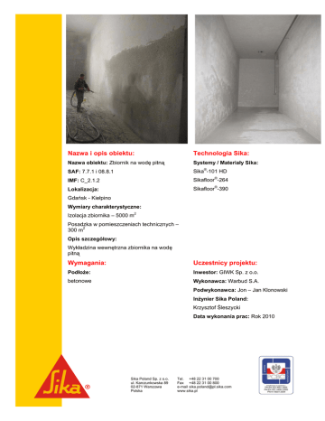 Nazwa i opis obiektu: Technologia Sika: Nazwa obiektu: Zbiornik na wodę pitną Systemy / Materiały Sika: SAF: 7.7.1 i 08.8.1 Sika®-101 HD IMF: C_2.1.2 Sikafloor®-264 Lokalizacja: Sikafloor®-390 Gdańsk - Kiełpino Wymiary charakterystyczne: Izolacja zbiornika – 5000 m2 Posadzka w pomieszczeniach technicznych – 300 m2 Opis szczegółowy: Wykładzina wewnętrzna zbiornika na wodę pitną Wymagania: Uczestnicy projektu: Podłoże: Inwestor: GIWK Sp. z o.o. betonowe Wykonawca: Warbud S.A. Podwykonawca: Jon – Jan Klonowski Inżynier Sika Poland: Krzysztof Śleszycki Data wykonania prac: Rok 2010 Sika Poland Sp. z o.o. ul. Karczunkowska 89 02-871 Warszawa Polska Tel. +48 22 31 00 700 Fax +48 22 31 00 800 e-mail [email protected] www.sika.pl