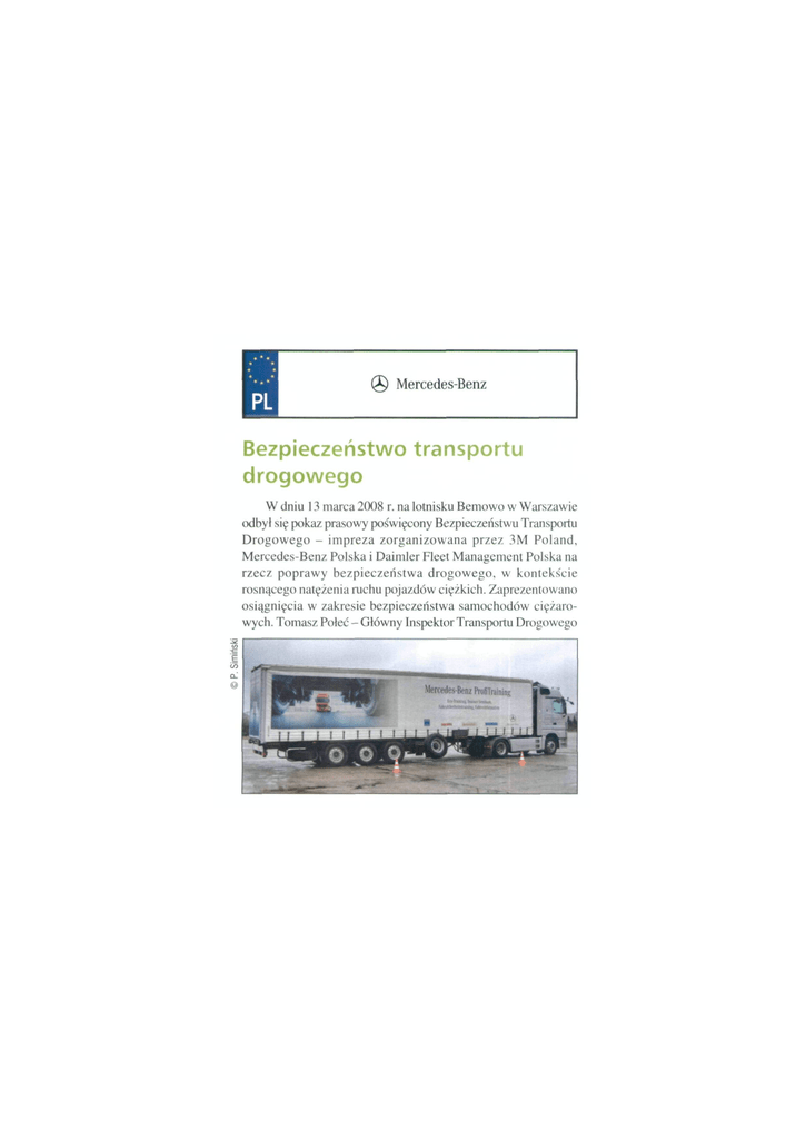 I (J) Mercedes-Benz Bezpieczeństwo transportu drogowego W dniu 13 marca 2008 r. na lotnisku Bemowo w Warszawie odbył się pokaz prasowy poświęcony Bezpieczeństwu Transportu Drogowego - impreza zorganizowana przez 3M Poland, Mercedes-Benz Polska i Daimler Fleet Management Polska na rzecz poprawy bezpieczeństwa drogowego, w kontekście rosnącego natężenia ruchu pojazdów ciężkich. Zaprezentowano osiągnięcia w zakresie bezpieczeństwa samochodów ciężaro wych. Tomasz Połeć - Główny Inspektor Transportu Drogowego i Benz ProfiTrainins - otworzył spotkanie swoją prezentacją na temat bezpiecznego mocowania ładunków. Firma 3M Poland przygotowała pokaz tasTn odblaskowych służących oznakowaniu konturów pojaz dów ciężarowych, podczas którego można było zobaczyć różnicę pomiędzy ciągnikiem z naczepą oznakowaną taśmą konturową, a zestawem nieoznakowanym. W pokazie konturówek wyko rzystano dwie naczepy: jedną wyposażoną w grafikę nieodblaskową i tas'mę konturową w kolorze żółtym oraz drugą mającą grafikę odblaskową w pełnym oznakowaniu konturowym koloru białego. Podczas pokazu można było przekonać się, jak zwięk sza się widoczność samochodu ciężarowego, który oznakowany jest odblaskowymi taśmami konturowymi. Tak oznakowany pojazd zauważalny jest już z odleglos'ci 1000 m. Więcej informacji na temat regulacji prawnych oraz wyników badań i opinii ekspertów na temat oznakowania konturowego można znaleźć w serwisie internetowym akcji poświęconej bezpiecznemu transportowi drogowemu www.konturowka.pl. Strona ta została objęta ofi cjalnym patronatem honorowym KRBRD oraz ITS, a firmy 3M oraz Mercedes-Benz są jej partnerami wspierającymi. Drugi z organizatorów pokazu, firma Mercedes-Benz Polska zademon strowała zaawansowane systemy bezpieczeństwa samochodów ciężarowych - rewolucyjny system hamowania awaryjnego Active Brake Assist, asystent pasa ruchu oraz system stabilizacji toru jazdy działające w ramach systemu Telligent. Zalety wymie nionych systemów przedstawiono w praktycznym pokazie z zestawami ciągnik Actros z naczepą. Firma Daimler Fleet Mana gement podczas konferencji towarzyszącej pokazowi przedstawiła prezentację na temat swojej oferty wynajmu długoterminowego oraz działalności w zakresie bezpieczeństwa wśród użytkowni ków samochodów firmowych. Firma od 3 lat jest partnerem pro gramu „Fleet Safety. Bezpieczne Auto Firmowe". To pierwszy w Polsce kompleksowy program szkoleniowy, którego celem jest zwiększenie bezpieczeństwa pracowników firmy (kierowców flotowych) oraz redukcja ogólnych kosztów floty samochodo wej. Firmy 3M Poland, Mercedes-Benz oraz Daimler Fleet Management podejmują coraz to nowe inicjatywy, które dopro wadzają do zwiększenia bezpieczeństwa w ruchu drogowym zarówno samochodowym, jak i pieszym. Jako członkowie Partnerstwa dla Bezpieczeństwa Drogowego przez cały rok prowadzą projekty zwiększające świadomość zagrożeń czy hających na drogach oraz sposobów ich zapobiegania. (PS)