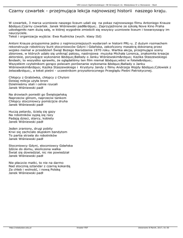 VIII Liceum Ogólnokształcące i 58 Gimnazjum im. Władysława IV w Warszawie - Start Czarny czwartek - przejmująca lekcja najnowszej historii naszego kraju. W czwartek, 3 marca uczniowie naszego liceum udali się na pokaz najnowszego filmu Antoniego Krauze „Czarny czwartek. Janek Wiśniewski padł”. Zaprzyjaźnione ze szkołą Nove Kino Praha udostępniło nam dużą salę, w której wygodnie zmieścili się wszyscy uczniowie liceum i towarzyszący im nauczyciele. Tekst i organizacja wyjścia: Ewa Rudnicka (wych. klasy IId) Antoni Krauze przypomina jedno z najmroczniejszych wydarzeń w historii PRL-u. Z dużym rozmachem rekonstruuje robotniczy bunt stoczniowców Gdyni i Gdańska, zakończony masakrą dokonaną przez wojsko niemal w przeddzień Świąt Bożego Narodzenia 1970 roku. Wartka akcja, przejmujące sceny zbiorowe, w których udało się uniknąć patosu, nastrojowa muzyka Michała Lorenca, znakomite kreacje aktorskie, porywające wykonanie „Ballady o Janku Wiśniewskim” Kazika Staszewskiego – to wszystko sprawiło, że oglądaliśmy ten film niemal „wbici w fotele”. Wszystkim czytelnikom gorąco polecam porównanie wykonania „Ballady o Janku Wiśniewskim” Kazika Staszewskiego i Krystyny Jandy z filmu Andrzeja Wajdy „Człowiek z żelaza”, a tekst pieśni - uczestnikom przyszłorocznego Przeglądu Pieśni Patriotycznej. Chłopcy z Grabówka, chłopcy z Chyloni Dzisiaj milicja użyła broni Dzielnieśmy stali i celnie rzucali Janek Wiśniewski padł Na drzwiach ponieśli go Świętojańską Naprzeciw glinom, naprzeciw tankom Chłopcy stoczniowcy pomścijcie druha Janek Wiśniewski padł Huczą petardy, ścielą się gazy Na robotników sypią się razy Padają dzieci, starcy, kobiety Janek Wiśniewski padł Jeden zraniony, drugi pobity Krwi się zachciało słupskim bandytom To partia strzela do robotników Janek Wiśniewski padł Stoczniowcy Gdyni, stoczniowcy Gdańska Idźcie do domu, skończona walka Świat się dowiedział, nic nie powiedział Janek Wiśniewski padł Nie płaczcie matki, to nie na darmo Nad stocznią sztandar z czarną kokardą Za chleb i wolność, i nową Polskę Janek Wiśniewski padł http://wladyslaw.edu.pl Kreator PDF Utworzono 8 March, 2017, 01:36