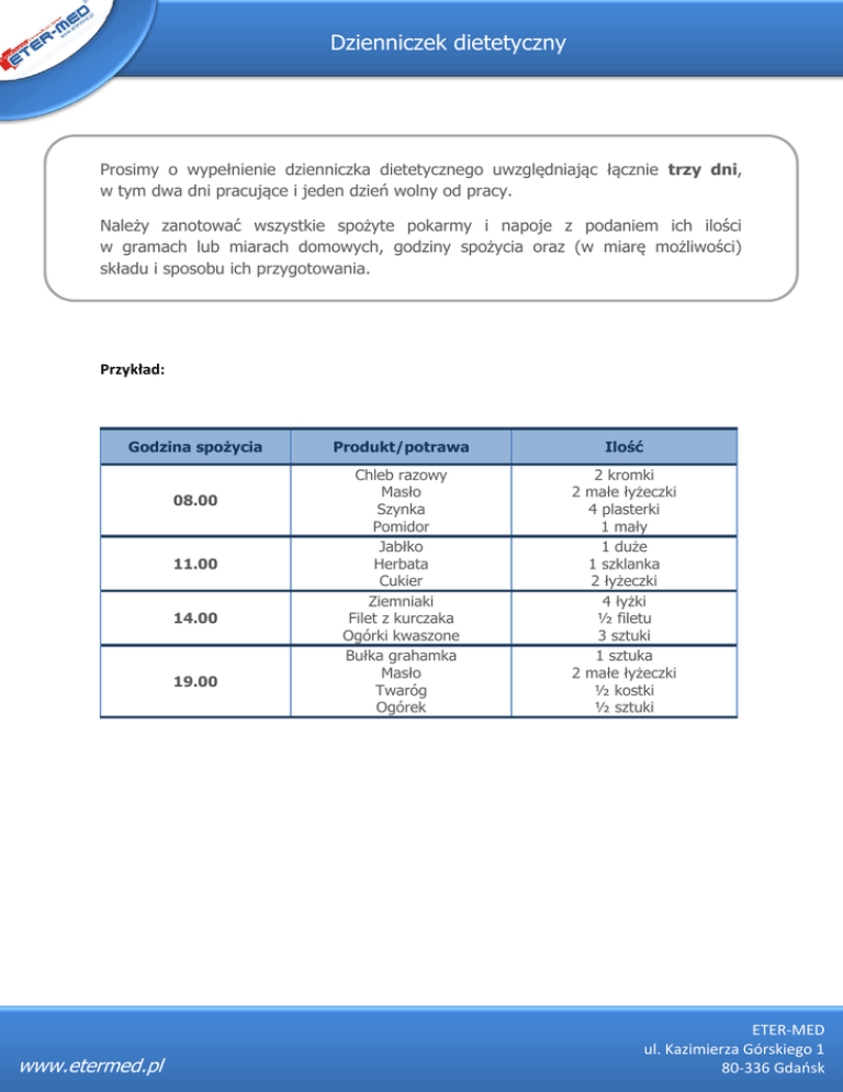 Dzienniczek dietetyczny Prosimy o wypełnienie dzienniczka dietetycznego uwzględniając łącznie trzy dni, w tym dwa dni pracujące i jeden dzień wolny od pracy. Należy zanotować wszystkie spożyte pokarmy i napoje z podaniem ich ilości w gramach lub miarach domowych, godziny spożycia oraz (w miarę możliwości) składu i sposobu ich przygotowania. Przykład: Godzina spożycia 08.00 11.00 14.00 19.00 www.etermed.pl Produkt/potrawa Ilość Chleb razowy Masło Szynka Pomidor Jabłko Herbata Cukier Ziemniaki Filet z kurczaka Ogórki kwaszone Bułka grahamka Masło Twaróg Ogórek 2 kromki 2 małe łyżeczki 4 plasterki 1 mały 1 duże 1 szklanka 2 łyżeczki 4 łyżki ½ filetu 3 sztuki 1 sztuka 2 małe łyżeczki ½ kostki ½ sztuki ETER-MED ul. Kazimierza Górskiego 1 80-336 Gdańsk Dzienniczek dietetyczny Data: ……………………………………………. DZIEŃ PRACUJĄCY Godzina spożycia www.etermed.pl Produkt/potrawa Ilość ETER-MED ul. Kazimierza Górskiego 1 80-336 Gdańsk Dzienniczek dietetyczny Data: ……………………………………………. DZIEŃ PRACUJĄCY Godzina spożycia www.etermed.pl Produkt/potrawa Ilość ETER-MED ul. Kazimierza Górskiego 1 80-336 Gdańsk Dzienniczek dietetyczny Data: ……………………………………………. DZIEŃ WOLNY OD PRACY Godzina spożycia www.etermed.pl Produkt/potrawa Ilość ETER-MED ul. Kazimierza Górskiego 1 80-336 Gdańsk