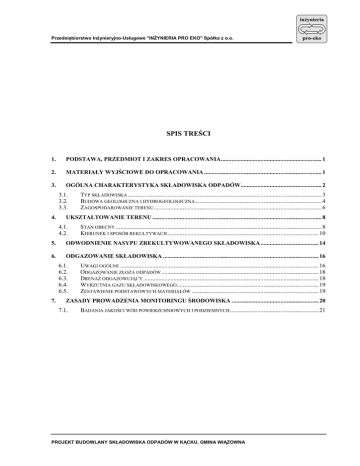 Przedsiębiorstwo Inżynieryjno-Usługowe "INŻYNIERIA PRO EKO" Spółka z o.o. SPIS TREŚCI 1. PODSTAWA, PRZEDMIOT I ZAKRES OPRACOWANIA.................................................................. 1 2. MATERIAŁY WYJŚCIOWE DO OPRACOWANIA ............................................................................. 1 3. OGÓLNA CHARAKTERYSTYKA SKŁADOWISKA ODPADÓW..................................................... 2 3.1. 3.2. 3.3. 4. TYP SKŁADOWISKA ............................................................................................................................... 3 BUDOWA GEOLOGICZNA I HYDROGEOLOGICZNA ................................................................................... 4 ZAGOSPODAROWANIE TERENU .............................................................................................................. 6 UKSZTAŁTOWANIE TERENU ............................................................................................................... 8 4.1. 4.2. STAN OBECNY ....................................................................................................................................... 8 KIERUNEK I SPOSÓB REKULTYWACJI ................................................................................................... 10 5. ODWODNIENIE NASYPU ZREKULTYWOWANEGO SKŁADOWISKA...................................... 14 6. ODGAZOWANIE SKŁADOWISKA ...................................................................................................... 16 6.1. 6.2. 6.3. 6.4. 6.5. 7. UWAGI OGÓLNE .................................................................................................................................. 16 ODGAZOWANIE ZŁOŻA ODPADÓW ....................................................................................................... 18 DRENAŻ ODGAZOWUJĄCY ................................................................................................................... 18 WYRZUTNIA GAZU SKŁADOWISKOWEGO............................................................................................. 19 ZESTAWIENIE PODSTAWOWYCH MATERIAŁÓW ................................................................................... 19 ZASADY PROWADZENIA MONITORINGU ŚRODOWISKA ......................................................... 20 7.1. BADANIA JAKOŚCI WÓD POWIERZCHNIOWYCH I PODZIEMNYCH .......................................................... 21 PROJEKT BUDOWLANY SKŁADOWISKA ODPADÓW W KĄCKU, GMINA WIĄZOWNA Przedsiębiorstwo Inżynieryjno-Usługowe "INŻYNIERIA PRO EKO" Spółka z o.o. 1. PODSTAWA, PRZEDMIOT I ZAKRES OPRACOWANIA Opracowanie niniejsze zostało wykonane w Przedsiębiorstwie Inżynieryjno-Usługowym „INŻYNIERIA PRO EKO” na podstawie Umowy nr CRU 27/03 (nasz numer 4/03) z dnia 18.03.2003 r. oraz Aneksu nr 1 z dnia 18 marca 2003 r. podpisanych z Urzędem Gminy Wiązowna. Przedmiotem opracowania jest analiza sposobu uporządkowania terenu działki o numerze ewidencyjnym 696/2 zajmowanej przez składowisko odpadów dla Wiązownej w Kącku z porównawczym oszacowaniem kosztów oraz projekt budowlany rekultywacji składowiska odpadów innych niż niebezpieczne i obojętne, deponowanych na terenie tej działki, zlokalizowanej w Kącku, Gmina Wiązowna. Przedmiotem niniejszej części opracowania jest projekt budowlany rekultywacji składowiska odpadów innych niż niebezpieczne i obojętne, deponowanych na terenie części działki 696/2, zlokalizowanej w Kącku, gmina Wiązowna. Zakres niniejszego opracowania obejmuje: 2. wskazanie i omówienie kierunku oraz sposobu rekultywacji składowiska, projekt robót ziemnych związanych z docelowym ukształtowaniem korpusu składowiska, projekt pokrywy rekultywacyjnej (z warstwą uszczelniającą) składowiska, projekt odgazowania składowiska, projekt odwodnienia korpusu składowiska. MATERIAŁY WYJŚCIOWE DO OPRACOWANIA Projekt budowlany rekultywacji składowiska opracowano na podstawie następujących materiałów: wypis z rejestru gruntów, stwierdzający, że działki 449/1, 449/2 i 696/1 położone w miejscowości Kąck są własnością Gminy Wiązowna, wypis z tekstu miejscowego planu ogólnego przestrzennego zagospodarowania Gminy Wiązowna, zatwierdzonego uchwałą nr 25/V/94 Rady Gminy z dnia 26.05.1994 r. (Dz. Urz. Woj. Stoł. Warszawskiego nr 22, poz. 194 z późniejszymi zmianami) wraz z wyrysem z planu, obejmującym lokalizację składowiska, „Program budowy wysypiska odpadów dla Gminy Wiązowna wraz z oceną przydatności przewidywanej lokalizacji” opracowany w roku 1993 przez Przedsiębiorstwo Inżynieryjno-Usługowe „INŻYNIERIA PRO EKO” Spółka z o.o. w Warszawie, „Techniczne badania podłoża gruntowego pod projektowany I etap budowy wysypiska śmieci dla Gminy Wiązowna w Kącku” opracowane w roku 1993 przez mgr Jolantę Falkowską, PROJEKT BUDOWLANY REKULTYWACJI SKŁADOWISKA ODPADÓW W KĄCKU, GMINA WIĄZOWNA 1 Przedsiębiorstwo Inżynieryjno-Usługowe "INŻYNIERIA PRO EKO" Spółka z o.o. 3. protokół oględzin przeprowadzonych przez Wojewódzki Inspektorat Ochrony Środowiska w Warszawie w dniu 08.10.2002 r. na terenie dzikiego składowiska odpadów we wsi Kąck Gmina Wiązowna, protokół z kontroli przeprowadzonych przez Mazowieckiego Wojewódzkiego Inspektora Ochrony Środowiska w Warszawie w dniach 08 i 18 października 2002 r. w Urzędzie Gminy Wiązowna dotyczącej składowiska odpadów komunalnych w Kącku, zarządzenia pokontrolne Mazowieckiego Wojewódzkiego Inspektora Ochrony Środowiska w Warszawie z dnia 16.12.2002 r. dotyczące składowiska odpadów w Kącku, Gmina Wiązowna, protokół z dnia 26.03.2003 r. z wykonania wykopów o głębokości 2,00 m w sześciu punktach na terenie działki nr 696/2 dla określenia obszaru zalegania odpadów, „Analiza sposobu uporządkowania terenu działki nr ewid. 696/2 zajmowanego przez składowisko odpadów komunalnych w Kącku Gmina Wiązowna z porównawczym oszacowaniem kosztów” sp