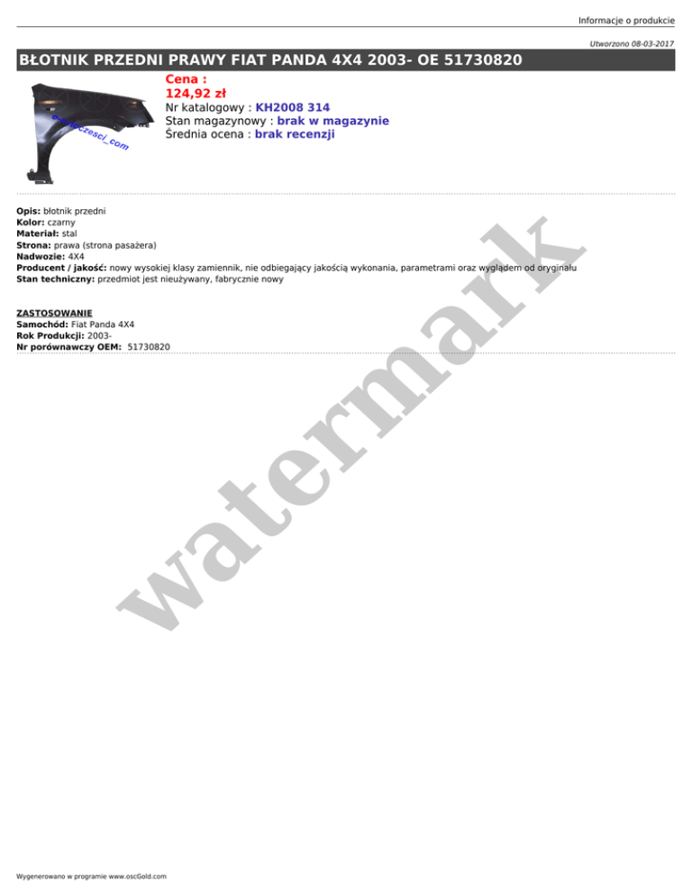 Informacje o produkcie Utworzono 08-03-2017 BŁOTNIK PRZEDNI PRAWY FIAT PANDA 4X4 2003- OE 51730820 Cena : 124,92 zł Nr katalogowy : KH2008 314 Stan magazynowy : brak w magazynie Średnia ocena : brak recenzji w at ZASTOSOWANIE Samochód: Fiat Panda 4X4 Rok Produkcji: 2003Nr porównawczy OEM: 51730820 er m ar k Opis: błotnik przedni Kolor: czarny Materiał: stal Strona: prawa (strona pasażera) Nadwozie: 4X4 Producent / jakość: nowy wysokiej klasy zamiennik, nie odbiegający jakością wykonania, parametrami oraz wyglądem od oryginału Stan techniczny: przedmiot jest nieużywany, fabrycznie nowy Wygenerowano w programie www.oscGold.com