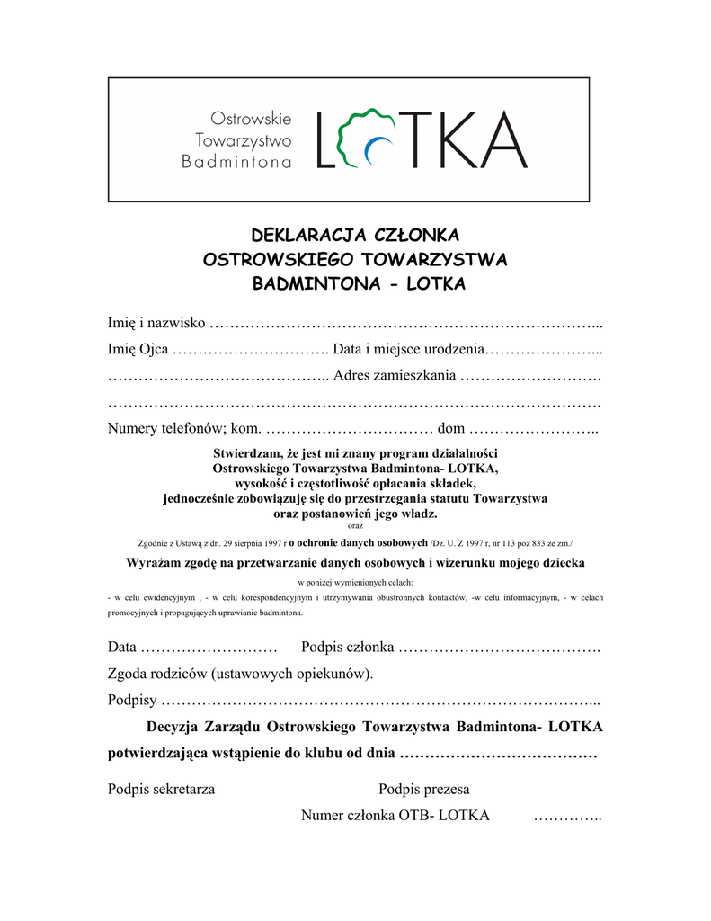 DEKLARACJA CZŁONKA OSTROWSKIEGO TOWARZYSTWA BADMINTONA - LOTKA Imię i nazwisko …………………………………………………………………... Imię Ojca …………………………. Data i miejsce urodzenia…………………... …………………………………….. Adres zamieszkania ………………………. ……………………………………………………………………………………. Numery telefonów; kom. …………………………… dom …………………….. Stwierdzam, że jest mi znany program działalności Ostrowskiego Towarzystwa Badmintona- LOTKA, wysokość i częstotliwość opłacania składek, jednocześnie zobowiązuję się do przestrzegania statutu Towarzystwa oraz postanowień jego władz. oraz Zgodnie z Ustawą z dn. 29 sierpnia 1997 r o ochronie danych osobowych /Dz. U. Z 1997 r, nr 113 poz 833 ze zm./ Wyrażam zgodę na przetwarzanie danych osobowych i wizerunku mojego dziecka w poniżej wymienionych celach: - w celu ewidencyjnym , - w celu korespondencyjnym i utrzymywania obustronnych kontaktów, -w celu informacyjnym, - w celach promocyjnych i propagujących uprawianie badmintona. Data ……………………… Podpis członka …………………………………. Zgoda rodziców (ustawowych opiekunów). Podpisy …………………………………………………………………………... Decyzja Zarządu Ostrowskiego Towarzystwa Badmintona- LOTKA potwierdzająca wstąpienie do klubu od dnia ………………………………… Podpis sekretarza Podpis prezesa Numer członka OTB- LOTKA …………..