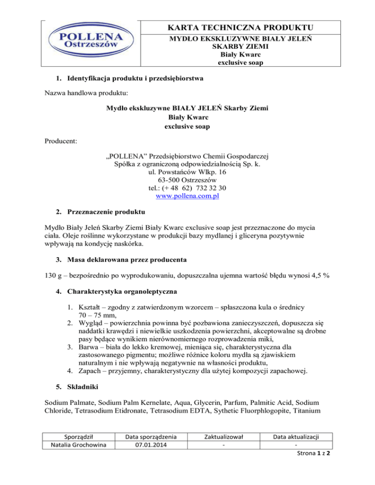 KARTA TECHNICZNA PRODUKTU MYDŁO EKSKLUZYWNE BIAŁY JELEŃ SKARBY ZIEMI Biały Kwarc exclusive soap 1. Identyfikacja produktu i przedsiębiorstwa Nazwa handlowa produktu: Mydło ekskluzywne BIAŁY JELEŃ Skarby Ziemi Biały Kwarc exclusive soap Producent: „POLLENA” Przedsiębiorstwo Chemii Gospodarczej Spółka z ograniczoną odpowiedzialnością Sp. k. ul. Powstańców Wlkp. 16 63-500 Ostrzeszów tel.: (+ 48 62) 732 32 30 www.pollena.com.pl 2. Przeznaczenie produktu Mydło Biały Jeleń Skarby Ziemi Biały Kwarc exclusive soap jest przeznaczone do mycia ciała. Oleje roślinne wykorzystane w produkcji bazy mydlanej i gliceryna pozytywnie wpływają na kondycję naskórka. 3. Masa deklarowana przez producenta 130 g – bezpośrednio po wyprodukowaniu, dopuszczalna ujemna wartość błędu wynosi 4,5 % 4. Charakterystyka organoleptyczna 1. Kształt – zgodny z zatwierdzonym wzorcem – spłaszczona kula o średnicy 70 – 75 mm, 2. Wygląd – powierzchnia powinna być pozbawiona zanieczyszczeń, dopuszcza się naddatki krawędzi i niewielkie uszkodzenia powierzchni, akceptowalne są drobne pasy będące wynikiem nierównomiernego rozprowadzenia miki, 3. Barwa – biała do lekko kremowej, mieniąca się, charakterystyczna dla zastosowanego pigmentu; możliwe różnice koloru mydła są zjawiskiem naturalnym i nie wpływają negatywnie na własności produktu, 4. Zapach – przyjemny, charakterystyczny dla użytej kompozycji zapachowej. 5. Składniki Sodium Palmate, Sodium Palm Kernelate, Aqua, Glycerin, Parfum, Palmitic Acid, Sodium Chloride, Tetrasodium Etidronate, Tetrasodium EDTA, Sythetic Fluorphlogopite, Titanium Sporządził Natalia Grochowina Data sporządzenia 07.01.2014 Zaktualizował - Data aktualizacji Strona 1 z 2 KARTA TECHNICZNA PRODUKTU MYDŁO EKSKLUZYWNE BIAŁY JELEŃ SKARBY ZIEMI Biały Kwarc exclusive soap Dioxide, Tin Oxide, Butylphenyl Methylpropional, Alpha – Isomethyl Ionone, Citronellol, Hexyl Cinnamal, Limonene, Linalool 6. Parametry fizykochemiczne pH ≥ 10 1. pH 1% roztworu wodnego: 7. Okres trwałości 3 lata od daty produkcji. Po tym okresie może być stosowany po sprawdzeniu zgodności parametrów z wymaganiami normy zakładowej ZN. 8. Przechowywanie Temperatura powietrza w suchych, krytych i czystych pomieszczeniach nie powinna być niższa niż 5°C i nie wyższa niż 35°C. Wilgotność względna powietrza nie powinna przekraczać 70%. 9. Sposób użycia Namydlić zwilżoną skórę, wmasować i dokładnie spłukać wodą. 10. Uzyskane atesty Posiada Ocenę Bezpieczeństwa Kosmetyku, badania dermatologiczne. Notyfikacja CPNP (Cosmetic Products Notification Portal) – nr referencyjny: 1655099 PKWiU: 20.42.19.0 Sporządził Natalia Grochowina Data sporządzenia 07.01.2014 Zaktualizował - Data aktualizacji Strona 2 z 2