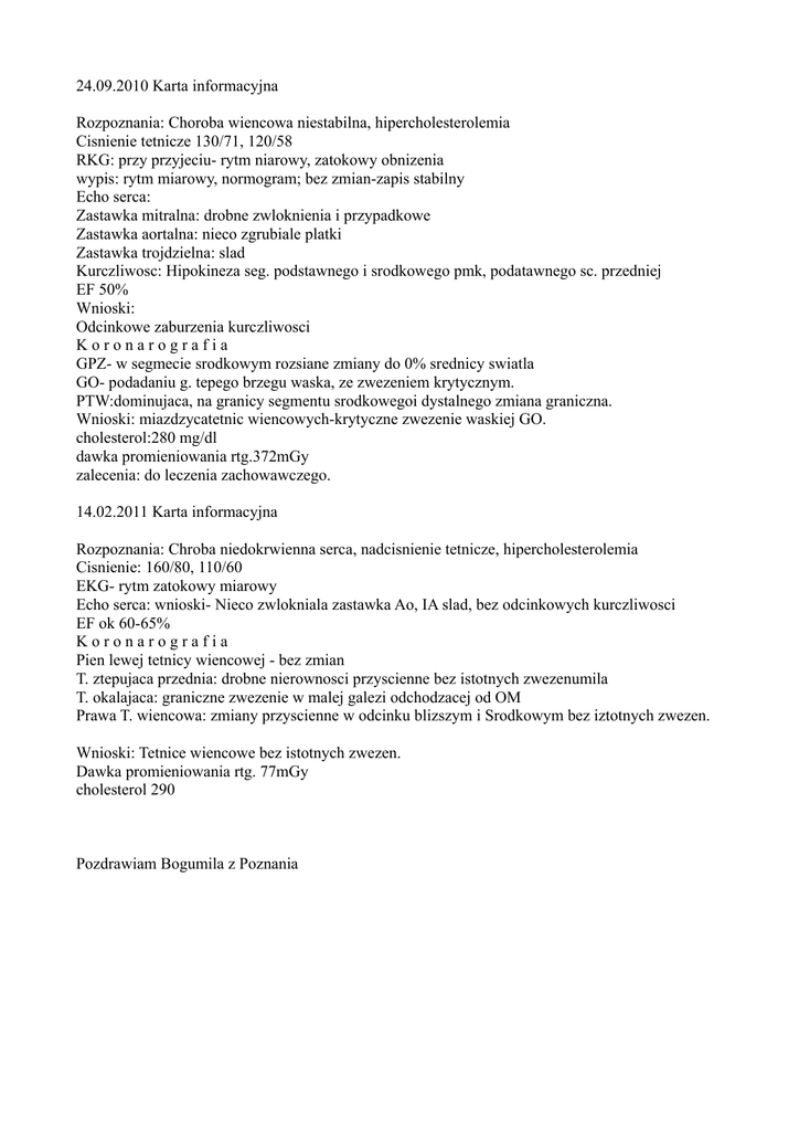 24.09.2010 Karta informacyjna Rozpoznania: Choroba wiencowa niestabilna, hipercholesterolemia Cisnienie tetnicze 130/71, 120/58 RKG: przy przyjeciu- rytm niarowy, zatokowy obnizenia wypis: rytm miarowy, normogram; bez zmian-zapis stabilny Echo serca: Zastawka mitralna: drobne zwloknienia i przypadkowe Zastawka aortalna: nieco zgrubiale platki Zastawka trojdzielna: slad Kurczliwosc: Hipokineza seg. podstawnego i srodkowego pmk, podatawnego sc. przedniej EF 50% Wnioski: Odcinkowe zaburzenia kurczliwosci Koronarografia GPZ- w segmecie srodkowym rozsiane zmiany do 0% srednicy swiatla GO- podadaniu g. tepego brzegu waska, ze zwezeniem krytycznym. PTW:dominujaca, na granicy segmentu srodkowegoi dystalnego zmiana graniczna. Wnioski: miazdzycatetnic wiencowych-krytyczne zwezenie waskiej GO. cholesterol:280 mg/dl dawka promieniowania rtg.372mGy zalecenia: do leczenia zachowawczego. 14.02.2011 Karta informacyjna Rozpoznania: Chroba niedokrwienna serca, nadcisnienie tetnicze, hipercholesterolemia Cisnienie: 160/80, 110/60 EKG- rytm zatokowy miarowy Echo serca: wnioski- Nieco zwlokniala zastawka Ao, IA slad, bez odcinkowych kurczliwosci EF ok 60-65% Koronarografia Pien lewej tetnicy wiencowej - bez zmian T. ztepujaca przednia: drobne nierownosci przyscienne bez istotnych zwezenumila T. okalajaca: graniczne zwezenie w malej galezi odchodzacej od OM Prawa T. wiencowa: zmiany przyscienne w odcinku blizszym i Srodkowym bez iztotnych zwezen. Wnioski: Tetnice wiencowe bez istotnych zwezen. Dawka promieniowania rtg. 77mGy cholesterol 290 Pozdrawiam Bogumila z Poznania