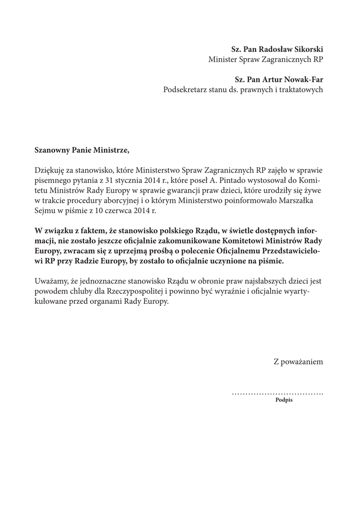 Sz. Pan Radosław Sikorski Minister Spraw Zagranicznych RP Sz. Pan Artur Nowak-Far Podsekretarz stanu ds. prawnych i traktatowych Szanowny Panie Ministrze, Dziękuję za stanowisko, które Ministerstwo Spraw Zagranicznych RP zajęło w sprawie pisemnego pytania z 31 stycznia 2014 r., które poseł A. Pintado wystosował do Komitetu Ministrów Rady Europy w sprawie gwarancji praw dzieci, które urodziły się żywe w trakcie procedury aborcyjnej i o którym Ministerstwo poinformowało Marszałka Sejmu w piśmie z 10 czerwca 2014 r. W związku z faktem, że stanowisko polskiego Rządu, w świetle dostępnych informacji, nie zostało jeszcze oficjalnie zakomunikowane Komitetowi Ministrów Rady Europy, zwracam się z uprzejmą prośbą o polecenie Oficjalnemu Przedstawicielowi RP przy Radzie Europy, by zostało to oficjalnie uczynione na piśmie. Uważamy, że jednoznaczne stanowisko Rządu w obronie praw najsłabszych dzieci jest powodem chluby dla Rzeczypospolitej i powinno być wyraźnie i oficjalnie wyartykułowane przed organami Rady Europy. Z poważaniem ……………………………. Podpis