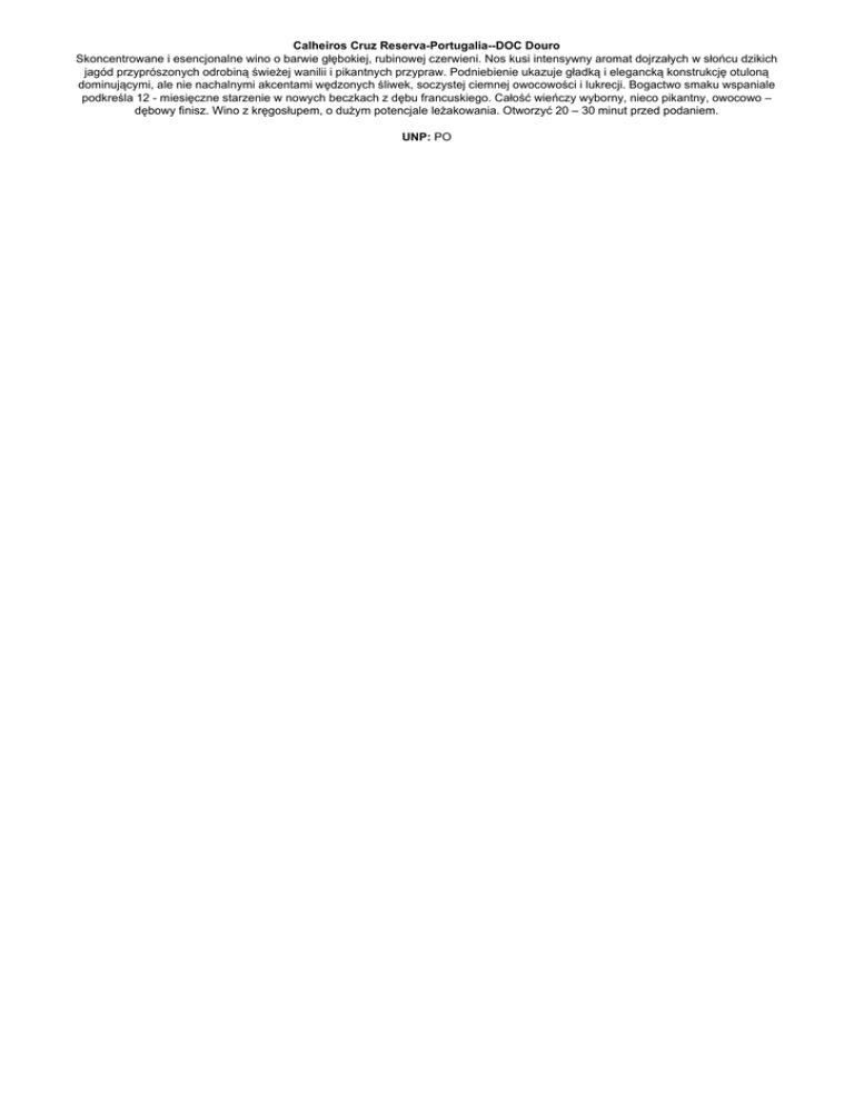 Calheiros Cruz Reserva-Portugalia--DOC Douro Skoncentrowane i esencjonalne wino o barwie głębokiej, rubinowej czerwieni. Nos kusi intensywny aromat dojrzałych w słońcu dzikich jagód przyprószonych odrobiną świeżej wanilii i pikantnych przypraw. Podniebienie ukazuje gładką i elegancką konstrukcję otuloną dominującymi, ale nie nachalnymi akcentami wędzonych śliwek, soczystej ciemnej owocowości i lukrecji. Bogactwo smaku wspaniale podkreśla 12 - miesięczne starzenie w nowych beczkach z dębu francuskiego. Całość wieńczy wyborny, nieco pikantny, owocowo – dębowy finisz. Wino z kręgosłupem, o dużym potencjale leżakowania. Otworzyć 20 – 30 minut przed podaniem. UNP: PO