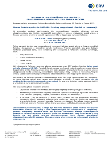 INSTRUKCJA DLA PODRÓŻUJĄCYCH DO EGIPTU DLA KLIENTÓW SUNSHINE HOLIDAY SPÓŁKA AKCYJNA Podczas podróży ubezpiecza Państwa Europäische Reiseversicherung AG Oddział w Polsce (ERV). Numer Państwa polisy to 1000484. Prosimy przygotować również nr rezerwacji. W przypadku nagłego zachorowania lub nieszczęśliwego wypadku objętego ochroną ubezpieczeniową, gdy istnieje konieczność skorzystania z pomocy medycznej, przed wizytą u lekarza uprzejmie prosimy o kontakt z partnerem ERV w Egipcie pod numerem telefonu: +20 128 181 3000 (obsługa w języku polskim), lub: +20 100 048 1112, SMS: +20 106 664 2421. Tylko uprzedni kontakt pod wspomnianymi numerami telefonu przed wizytą u lekarza umożliwi Państwu skorzystanie z bezpłatnej porady medycznej. Prosimy pamiętać, aby przy każdym kontakcie przekazać dane, które umożliwią ERV nawiązanie z Państwem kontaktu zwrotnego, m.in.: • imię i nazwisko, • numer telefonu do kontaktu, • nazwę hotelu, • numer pokoju. Gdy skorzystają Państwo z pomocy lekarza wskazanego przez ERV zapłacą Państwo tylko koszt udziału własnego 25 EUR. Pozostały koszt pomocy medycznej zostanie rozliczony przez lekarza bezpośrednio z ERV. Prosimy zawsze mieć przy sobie paszport oraz potwierdzenie zawarcia umowy ubezpieczenia (karta assistance, potwierdzenie rezerwacji podróży - umowa o wycieczkę).Przepisy umowy ubezpieczenia dotyczące wyłączenia odpowiedzialności ERV mają w pełni zastosowanie. Gdy udadzą się Państwo do lekarza niewskazanego przez ERV, czyli z pominięciem ww. procedury, to muszą Państwo pokryć koszt porady ambulatoryjnej w całości. W takim przypadku nie ma możliwości bezgotówkowego rozliczenia usługi. Po powrocie do Polski należy wystąpić do ERV z wnioskiem o zwrot poniesionych kosztów. Aby skutecznie zgłosić roszczenie prosimy: • uzyskać od lekarza dokumentację zawierającą diagnozę lekarską i oryginał rachunku, • zabezpieczyć wszelkie inne oryginały dowodów zapłaty uzasadniające zgłaszane roszczenia – np. rachunki (paragony) z apteki, rachunki za dojazdy do lekarza itp., • w terminie 7 dni po powrocie do Polski należy przesłać do ERV wypełniony formularz zgłoszenia szkody, uzyskaną dokumentację medyczną i rachunki (koniecznie oryginały) oraz potwierdzenie rezerwacji podroży (umowa o wycieczkę); formularze można wypełnić online lub pobrać w formacie pdf ze strony www.erv.pl (zakładka „Likwidacja szkód”). Jednocześnie przestrzegamy, iż mogą być Państwo zachęcani przez lekarzy stosujących nieuczciwe praktyki lub osoby z nimi współpracujące do skorzystania z „bezpłatnej” pomocy medycznej. Ponadto może być Państwu oferowana kuracja zapobiegawcza przeciwko różnym chorobom w postaci leków lub szczepionek. Jest to oszustwo i taka kuracja nie jest objęta ochroną ubezpieczeniową. Może również powodować nieprzewidziane skutki uboczne. Dlatego prosimy o korzystanie ze wskazanych placówek medycznych. Życzymy udanego wypoczynku! Europäische Reiseversicherung AG www.erv.pl Sąd Rejonowy w Gdańsku REGON 193072350, Członek ETI Group Oddział w Polsce [email protected] VII Wydział Gospodarczy NIP 2040000303, European Travel Insurance Group ul. Chmielna 101/102 +48 58 324 88 50 Krajowego Rejestru Sądowego, Kapitał zakładowy KRS 0000214412, 52 000 000 EUR 80-748 Gdańsk