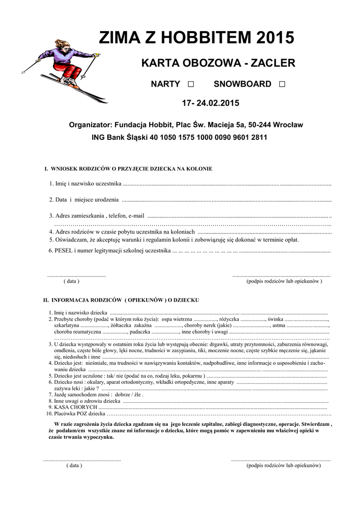 ZIMA Z HOBBITEM 2015 KARTA OBOZOWA - ZACLER NARTY □ SNOWBOARD □ 17- 24.02.2015 Organizator: Fundacja Hobbit, Plac Św. Macieja 5a, 50-244 Wrocław ING Bank Śląski 40 1050 1575 1000 0090 9601 2811 I. WNIOSEK RODZICÓW O PRZYJĘCIE DZIECKA NA KOLONIE 1. Imię i nazwisko uczestnika ....................................................................................................... .................................. 2. Data i miejsce urodzenia .......................................................................................................................................... 3. Adres zamieszkania , telefon, e-mail ....................................................................................................................... .. ……………………………………………………………………………………………………………………….. 4. Adres rodziców w czasie pobytu uczestnika na koloniach ........................................................................................ 5. Oświadczam, że akceptuję warunki i regulamin kolonii i zobowiązuję się dokonać w terminie opłat. 6. PESEL i numer legitymacji szkolnej uczestnika ... ... ... ... ... ... ... ... ... ... ... ............................................................ ........................................... ( data ) ........................................................................ (podpis rodziców lub opiekunów ) II. INFORMACJA RODZICÓW ( OPIEKUNÓW ) O DZIECKU 1. Imię i nazwisko dziecka ............................................................................................... ................................................................ 2. Przebyte choroby (podać w którym roku życia): ospa wietrzna ................., różyczka .................., świnka ..............................., szkarlatyna ...................., żółtaczka zakaźna ...................., choroby nerek (jakie) ..........................., astma ................... ..........., choroba reumatyczna .................., padaczka ...................., inne choroby i uwagi ......................................................................... ……………………………………………………………………………………………………………………………………. 3. U dziecka występowały w ostatnim roku życia lub występują obecnie: drgawki, utraty przytomności, zaburzenia równowagi, omdlenia, częste bóle głowy, lęki nocne, trudności w zasypianiu, tiki, moczenie nocne, częste szybkie męczenie się, jąkanie się, niedosłuch i inne ...................................................................................................... ................................................................ 4. Dziecko jest: nieśmiałe, ma trudności w nawiązywaniu kontaktów, nadpobudliwe, inne informacje o usposobieniu i zachowaniu dziecka ............................................................................................................................... ................................................ 5. Dziecko jest uczulone : tak/ nie (podać na co, rodzaj leku, pokarmu ) ........................................................................................ 6. Dziecko nosi : okulary, aparat ortodontyczny, wkładki ortopedyczne, inne aparaty .................................................................. zażywa leki : jakie ? .............................................................................................................. ....................................................... 7. Jazdę samochodem znosi : dobrze / źle . 8. Inne uwagi o zdrowiu dziecka .................................................................................................................... .................................. 9. KASA CHORYCH ....................................................................................................................................................................... 10. Placówka POZ dziecka ………………………………………………………………………………………………………...…. W razie zagrożenia życia dziecka zgadzam się na jego leczenie szpitalne, zabiegi diagnostyczne, operacje. Stwierdzam , że podałam/em wszystkie znane mi informacje o dziecku, które mogą pomóc w zapewnieniu mu właściwej opieki w czasie trwania wypoczynku. ......................................................... ( data ) ......................................................................... (podpis rodziców lub opiekunów) III. INFORMACJA WYCHOWAWCY KLASY O DZIECKU (w przypadku braku możliwości uzyskania opinii wychowawcy klasy - wypełnia rodzic lub opiekun) .................................................................................................................................................................................................. ................ ................................................................................................................... ............................................................................................... ............................................................................................................................. ..................................................................................... ............................................................................................................................. ..................................................................................... ............................................. ( data ) .............................................................. .... ( pieczęć lub nazwa i adres szkoły ) .................................................................. (podpis wychowawcy klasy) IV. INFORMACJA O SZCZEPIENIACH lub przedstawienie książeczki zdrowia z aktualnym wpisem szczepień Szczepienia ochronne (podać r