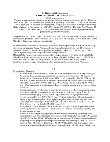 UCHWAŁA NR .................. RADY MIEJSKIEJ W PIASECZNIE z dnia ...................... W sprawie wezwania do usunięcia naruszenia interesu prawnego w trybie art. 101 Ustawy z dnia 08.03.1990 r o samorządzie gminnym ( jednolity tekst Dz. U. z 2001 r. Nr 142 poz. 1591 z późn. zm.) w związku z uchwałą Rady Miejskiej w Piasecznie w związku z uchwałą Rady Miejskiej w Piasecznie Nr 613/LI/98 z dnia 29.04.1998 r. ( Dz. Urz. Woj. Warsz. Nr 11 z dnia 01.07.1998 r. poz.132) w przedmiocie miejscowego planu zagospodarowania przestrzennego miasta Piaseczna. Na podstawie art. 18 ust. 2 pkt. 5 w związku z art. 101 Ustawy z dnia 8 marca 1990 r. o samorządzie gminnym ( tekst jednolity Dz. U. z 2001 r. Nr 142 poz. 1591 z późn. zm.) Rada Miejska w Piasecznie uchwala co następuje : §1 Po rozpoznaniu wezwania do usunięcia naruszenia interesu prawnego Wandy Wróblewskiej reprezentowanej przez Radcę Prawnego Beatę Generałowicz, w trybie art. 101, Ustawy z dnia 08.03.1990 r o samorządzie gminnym ( jednolity tekst Dz. U. Nr 142 poz. 1591 z 2001 r. z późn. zm.) Rada Miejska w Piasecznie postanawia : Odrzucić skargę dotyczącą naruszenia interesu prawnego, w związku z uchwałą Rady Miejskiej w Piasecznie w związku z uchwałą Rady Miejskiej w Piasecznie Nr 613/LI/98 z dnia 29.04.1998 r. ( Dz. Urz. Woj. Warsz. Nr 11 z dnia 01.07.1998 r. poz.132) w przedmiocie miejscowego planu zagospodarowania przestrzennego miasta Piaseczna. §2 Uzasadnienie faktyczne : 1. Pismem znak 626948/BRM/S z dnia 4.11.2011, skarżąca wezwała Radę Miejską w Piasecznie do usunięcia naruszenia interesu prawnego w trybie art. 101 Ustawy o Samorządzie Gminnym z dnia 8 marca 1990 r. ( tekst jednolity : Dz. U. 2001 Nr 142 poz. 1591 z późn. zmianami ) w związku z uchwałą Rady Miejskiej w Piasecznie Nr 613/LI/98 z dnia 29.04.1998 r. ( Dz. Urz. Woj. Warsz. Nr 11 z dnia 01.07.1998 r. poz.132) w przedmiocie miejscowego planu zagospodarowania przestrzennego miasta Piaseczna. 1. Skarżąca zarzuciła przedmiotowej uchwale naruszenie procedury sporządzania mpzp polegające na braku powiadomiona jej stosownie do treści art. 18 ust. 2 pkt. 5 wówczas obowiązującej ustawy z dnia 7 lipca 1994 roku o zagospodarowaniu przestrzennym (Dz. U. z 1999r Nr.15 poz. 139 tekst jednolity z późn. zmianami), o terminie wyłożenia do publicznego wglądu projektu planu miasta Piaseczna zatw. Uchwałą Rady Miejskiej w Piasecznie Nr 613/LI/98 z dnia 29.04.1998 r. ( Dz. Urz. Woj. Warsz. Nr 11 z dnia 01.07.1998 r. poz.132) 2. W archiwum Urzędu Miasta i Gminy Piaseczno brak jest dowodów powiadomienia skarżącej stosownie do treści art. 18 ust. 2 pkt. 5 o terminie wyłożenia projektu planu do publicznego wglądu . 3. W obszarze, w którym znajduje się działka skarżącej zaskarżony miejscowy plan zagospodarowania przestrzennego zatwierdzony uchwałą Rady Miejskiej w Piasecznie Nr 613/LI/98 z dnia 29/04/1998r obecnie nie obowiązuje. W obszarze tym obowiązuje miejscowy plan zagospodarowania przestrzennego zatwierdzony w dniu 2.07.2008 r. uchwałą Rady Miejskiej w Piasecznie Nr 654/XXIV/2008. Plan ten wygasił plan zatwierdzony uchwałą Rady Miejskiej w Piasecznie Nr 613/LI/98 z dnia 29/04/1998r 1 w granicach obszaru objętym uchwałą Rady Miejskiej w Piasecznie Nr 654/XXIV/2008. 4. Do planu zatwierdzonego w dniu 2.07.2008 r. uchwałą Rady Miejskiej w Piasecznie Nr 654/XXIV/2008 przystąpiono uchwałą nr 1487/LVII/06 Rady Miejskiej w Piasecznie w dniu 23 października 2006 r w procedurze planistycznej państwo Wróblewscy uczestniczyli poprzez składanie wniosków i uwag do realizowanej zmiany planu. 5. Skarżąca zgadzała się z ustaleniami miejscowego planu zagospodarowania przestrzennego miasta Piaseczna, zatw. Uchwałą Rady Miejskiej w Piasecznie Nr 613/LI/98 z dnia 29.04.1998 r. ( Dz. Urz. Woj. Warsz. z dnia 01.07.1998 r. Nr 11 poz.132) co potwierdziła w treści składanych wniosków i uwag do realizowanej zmiany planu polegającej na utrzymaniu funkcji ustalonej w skarżonej uchwale. 6. Zgodnie z art. 34 ustawy z dnia 23 marca 2003 r. o planowaniu i zagospodarowaniu przestrzennym ( Dz. U. Nr 80 poz. 717 z dnia 10.05.2003 r. ze zm.) wejście wżycie planu miejscowego powoduje utratę mocy obowiązującej innych planów zagospodarowania przestrzennego lub ich części odnoszących się do objętego nim terenu. W związku z utratą mocy skarżonego planu w granicach działki skarżących, skarga dotyczącą naruszenia interesu prawnego jest bezprzedmiotowa 7. W związku z powyższym postanawia się odrzucić skargę dotyczącą naruszenia interesu prawnego , w związku z uchwałą Rady Miejskiej w Piasecznie w związku z uchwałą Rady Miejskiej w Piasecznie Nr 613/LI/98 z dnia 29.04.1998 r. ( Dz. Urz. Woj. Warsz. Nr 11 z dnia 01.07.1998 r. poz.132) w przedmiocie miejscowego planu zagospodarowania przestrzennego miasta Piaseczna. Uzasadnienie prawne: 1. Zgodnie z art. 101 Ustawy z dnia 8 marca 1990 r. o samorządzie gminnym ( tekst jednolity Dz. U. z 2001 r. Nr 142 poz. 1591 ze zm. ), każdy czyj interes prawny lub uprawnienia zostały naruszone uchwałą podjętą przez organ gminy w sprawie zakresu administracji publicznej wzywa gminę do usunięcia naruszenia. 2. Zgodnie z art. 34 ustawy z dnia 23 marca 2003 r. o planowaniu i zagospodarowaniu przestrzennym ( Dz. U. Nr 80 poz. 717 z dnia 10.05.2003 r. ze zm.) wejście wżycie planu miejscowego powoduje utratę mocy obowiązującej innych planów zagospodarowania przestrzennego lub ich części odnoszących się do objętego nim terenu. §3 Wykonanie uchwały powierza się Burmistrzowi Miasta i Gminy Piaseczno,. §4 Uchwała wchodzi w życie z dniem podjęcia. 2 Uzasadnienie do uchwały w sprawie wezwania do usunięcia naruszenia interesu prawnego w trybie art. 101 Ustawy z dnia 08.03.1990 r o samorządzie gminnym w związku z uchwałą Rady Miejskiej w Piasecznie w związku z uchwałą Rady Miejskiej w Piasecznie Nr 613/LI/98 z dnia 29.04.1998 r. ( Dz. Urz. Wo
