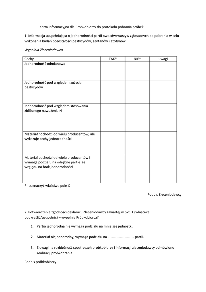 Karta informacyjna dla Próbkobiorcy do protokołu pobrania próbek ……………………. 1. Informacja uzupełniająca o jednorodności partii owoców/warzyw zgłoszonych do pobrania w celu wykonania badań pozostałości pestycydów, azotanów i azotynów Wypełnia Zleceniodawca Cechy Jednorodność odmianowa TAK* NIE* uwagi Jednorodność pod względem zużycia pestycydów Jednorodność pod względem stosowania zbliżonego nawożenia N Materiał pochodzi od wielu producentów, ale wykazuje cechy jednorodności Materiał pochodzi od wielu producentów i wymaga podziału na odrębne partie ze względu na brak jednorodności * - zaznaczyć właściwe pole X Podpis Zleceniodawcy _________________________________________________________________________________ 2. Potwierdzenie zgodności deklaracji Zleceniodawcy zawartej w pkt. 1 (właściwe podkreślić/uzupełnić) – wypełnia Próbkobiorca? 1. Partia jednorodna nie wymaga podziału na mniejsze jednostki, 2. Materiał niejednorodny, wymaga podziału na ………………………… partii. 3. Z uwagi na rozbieżność spostrzeżeń próbkobiorcy i informacji zleceniodawcy odmówiono realizacji próbkobrania. Podpis próbkobiorcy
