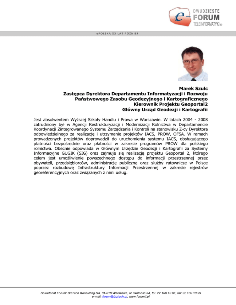 ePOLSKA XX LAT PÓŹNIEJ Marek Szulc Zastępca Dyrektora Departamentu Informatyzacji i Rozwoju Państwowego Zasobu Geodezyjnego i Kartograficznego Kierownik Projektu Geoportal2 Główny Urząd Geodezji i Kartografii Jest absolwentem Wyższej Szkoły Handlu i Prawa w Warszawie. W latach 2004 - 2008 zatrudniony był w Agencji Restrukturyzacji i Modernizacji Rolnictwa w Departamencie Koordynacji Zintegrowanego Systemu Zarządzania i Kontroli na stanowisku Z-cy Dyrektora odpowiedzialnego za realizację i utrzymanie projektów IACS, PROW, OFSA. W ramach prowadzonych projektów doprowadził do uruchomienia systemu IACS, obsługującego płatności bezpośrednie oraz płatności w zakresie programów PROW dla polskiego rolnictwa. Obecnie odpowiada w Głównym Urzędzie Geodezji i Kartografii za Systemy Informacyjne GUGIK (SIG) oraz zajmuje się realizacją projektu Geoportal 2, którego celem jest umożliwienie powszechnego dostępu do informacji przestrzennej przez obywateli, przedsiębiorców, administrację publiczną oraz służby ratownicze w Polsce poprzez rozbudowę Infrastruktury Informacji Przestrzennej w zakresie rejestrów georeferencyjnych oraz związanych z nimi usług. Sekretariat Forum: BizTech Konsulting SA, 01-018 Warszawa, ul. Wolność 3A, tel. 22 100 10 01, fax 22 100 10 99 e-mail: [email protected], www.forumti.pl