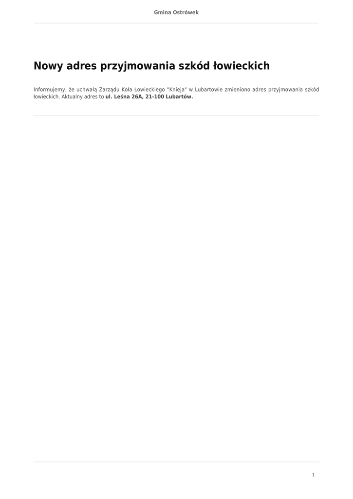 Gmina Ostrówek Nowy adres przyjmowania szkód łowieckich Informujemy, że uchwałą Zarządu Koła Łowieckiego "Knieja" w Lubartowie zmieniono adres przyjmowania szkód łowieckich. Aktualny adres to ul. Leśna 26A, 21-100 Lubartów. 1