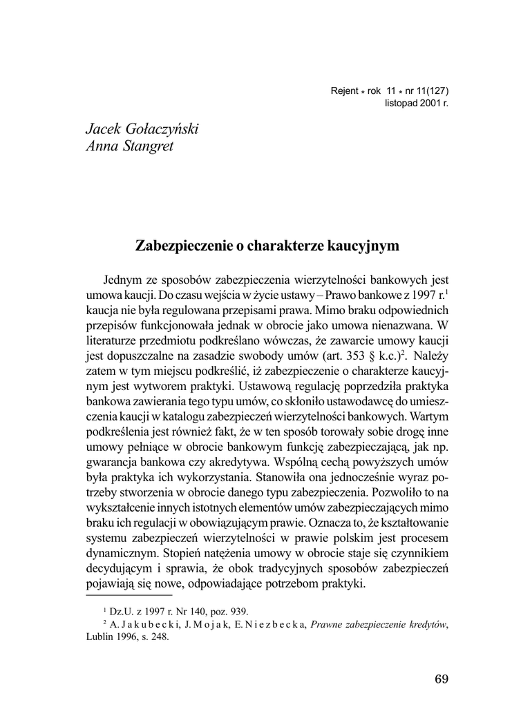 Zabezpieczenie o charakterze kaucyjnym Rejent * rok 11 * nr 11(127) listopad 2001 r. Jacek Go³aczyñski Anna Stangret Zabezpieczenie o charakterze kaucyjnym Jednym ze sposobów zabezpieczenia wierzytelnoœci bankowych jest umowa kaucji. Do czasu wejœcia w ¿ycie ustawy – Prawo bankowe z 1997 r.1 kaucja nie by³a regulowana przepisami prawa. Mimo braku odpowiednich przepisów funkcjonowa³a jednak w obrocie jako umowa nienazwana. W literaturze przedmiotu podkreœlano wówczas, ¿e zawarcie umowy kaucji jest dopuszczalne na zasadzie swobody umów (art. 353 § k.c.)2. Nale¿y zatem w tym miejscu podkreœliæ, i¿ zabezpieczenie o charakterze kaucyjnym jest wytworem praktyki. Ustawow¹ regulacjê poprzedzi³a praktyka bankowa zawierania tego typu umów, co sk³oni³o ustawodawcê do umieszczenia kaucji w katalogu zabezpieczeñ wierzytelnoœci bankowych. Wartym podkreœlenia jest równie¿ fakt, ¿e w ten sposób torowa³y sobie drogê inne umowy pe³ni¹ce w obrocie bankowym funkcjê zabezpieczaj¹c¹, jak np. gwarancja bankowa czy akredytywa. Wspóln¹ cech¹ powy¿szych umów by³a praktyka ich wykorzystania. Stanowi³a ona jednoczeœnie wyraz potrzeby stworzenia w obrocie danego typu zabezpieczenia. Pozwoli³o to na wykszta³cenie innych istotnych elementów umów zabezpieczaj¹cych mimo braku ich regulacji w obowi¹zuj¹cym prawie. Oznacza to, ¿e kszta³towanie systemu zabezpieczeñ wierzytelnoœci w prawie polskim jest procesem dynamicznym. Stopieñ natê¿enia umowy w obrocie staje siê czynnikiem decyduj¹cym i sprawia, ¿e obok tradycyjnych sposobów zabezpieczeñ pojawiaj¹ siê nowe, odpowiadaj¹ce potrzebom praktyki. 1 Dz.U. z 1997 r. Nr 140, poz. 939. A. J a k u b e c k i, J. M o j a k, E. N i e z b e c k a, Prawne zabezpieczenie kredytów, Lublin 1996, s. 248. 2 69 Jacek Go³aczyñski, Anna Stangret Wprowadzenie ustawowej regulacji kaucji nie wyjaœni³o jednak w¹tpliwoœci dotycz¹cych charakteru prawnego tej¿e umowy. Spór o jej naturê prawn¹, jak i dopuszczalnoœæ zawierania tego typu umów wci¹¿ jest przedmiotem rozwa¿añ nauki. Najistotniejsz¹ kwesti¹ jest rozstrzygniêcie, czy kaucja stanowi jedn¹ z postaci umów ju¿ uregulowanych w naszym systemie prawnym, czy te¿ jest odrêbnym typem umowy o okreœlonym katalogu praw i obowi¹zków stron i sposobie realizacji, maj¹cym uzasadnienie w autonomii woli stron (contractus innominatus). Instytucjê kaucji reguluje przepis art. 102 pr. bank., który stanowi, i¿: „w celu zabezpieczenia wierzytelnoœci banku d³u¿nik lub inna osoba mo¿e przelaæ okreœlon¹ kwotê w z³otych lub w innej walucie wymienialnej na rachunek banku, który zobowi¹¿e siê, ¿e zwróci tê kwotê po uzyskaniu sp³aty zad³u¿enia wraz z nale¿nymi odsetkami i prowizj¹”. Powy¿szy przepis reguluje jedynie jedn¹ z postaci kaucji – kaucjê gotówkow¹. Przedmiotem kaucji, obok œrodków pieniê¿nych, mog¹ byæ równie¿ papiery wartoœciowe czy rzeczy oznaczone tylko co gatunku. Trzeba zaznaczyæ jednak, ¿e przepisy prawa bankowego dla przyjêcia zabezpieczenia w postaci rzeczy ruchomych czy papierów wartoœciowych przewiduj¹ inn¹ jego formê, tj. przew³aszczenie na zabezpieczenie (art. 101 pr. bank.), wyra¿nie oddzielaj¹c j¹ od zabezpieczenia w postaci gotówki (art. 102 pr. bank.). Nale¿y równie¿ podkreœliæ, ¿e zawieranie umów kaucji jest dopuszczalne tak¿e poza obrotem bankowym. Jest to spowodowane zasad¹ swobody umów (art. 3531 k.c.), w ramach której strony mog¹ równie¿ korzystaæ z omawianej formy zabezpieczenia wierzytelnoœci. Dla wyjaœnienia prawnego charakteru umowy kaucji definicja z art. 102 pr. bank. z pewnoœci¹ jest niewystarczaj¹ca. Podkreœla ona jedynie zwrotny charakter kaucji oraz precyzuje sposób przeniesienia jej przedmiotu na rzecz banku-wierzyciela. Zgodnie z art. 102 pr. bank., na podstawie umowy zawartej miêdzy d³u¿nikiem (lub osob¹ trzeci¹) a bankiem dochodzi do „przelania” okreœlonej kwoty na rachunek banku. Zwrot ten nasuwa wiele w¹tpliwoœci, poniewa¿ nie rozstrzyga, czy w ramach stosunku kaucji nastêpuje przeniesienie w³asnoœci, czy jedynie posiadania. Problem w³asnoœci œrodków bêd¹cych przedmiotem kaucji jest istotny ze wzglêdu na mo¿liwoœæ uznania kaucji za rodzaj znanych ju¿ naszemu prawu form zabezpieczeñ, tj. zastawu lub przew³aszczenia na zabezpieczenie. Je¿eli w ramach kaucji nastêpuje jedynie przeniesienie posiadania, to umowê tak¹ mo¿na 70 Zabezpieczenie o charakterze kaucyjnym uznaæ za szczególn¹ postaæ zastawu zwyk³ego. Je¿eli natomiast przyjmiemy, ¿e na mocy umowy kaucji dochodzi do przeniesienia w³asnoœci, wówczas bêdzie to forma przew³aszczenia na zabezpieczenie. Kwalifikacja charakteru prawnego umowy kaucji wymaga szerszej analizy. Wykazuje ona bowiem podobieñstwo nie tylko do umowy zastawu czy przew³aszczenia na zabezpieczenie. Swoj¹ konstrukcj¹ zbli¿a siê równie¿ do blokady œrodków na rachunku bankowym, depozytu nieprawid³owego oraz prawa zatrzymania. Wieloœæ powo³anych wy¿ej stosunków prawnych œwiadczy o z³o¿onym charakterze kaucji. Konieczne staje siê zatem jednoznaczne sklasyfikowanie omawianej umowy poprzez okreœlenie jej podstawowych elementów. Prawny sens zabezpieczenia kaucyjnego polega na pozbawieniu d³u¿nika mo¿liwoœci korzystania z przedmiotu kaucji. Na mocy umowy kaucjodawca „przekazuje” wierzycielowi okreœlon¹ iloœæ pieniêdzy w celu zabezpieczenia roszczeñ, jakie mog¹ wynikn¹æ z innego stosunku prawnego. Kaucjobiorca zobowi¹zuje siê natomiast do zwrotu tej samej iloœci pieniêdzy, je¿eli stosunek zabezpieczony kaucj¹ wygaœnie. Wierzyciel mo¿e zatem przez ca³y czas trwania zabezpieczenia swobodnie korzystaæ z przedmiotu kaucji. Je¿eli stron¹ umowy jest bank, z³o¿ona jako kaucja gotówka z pewnoœci¹ bêdzie wykorzystywana do przeprowadzania bie¿¹cych transakcji. Bank uzyskuje w ten sposób bardzo praktyczny œrodek zabezpieczenia, gotówka stanow