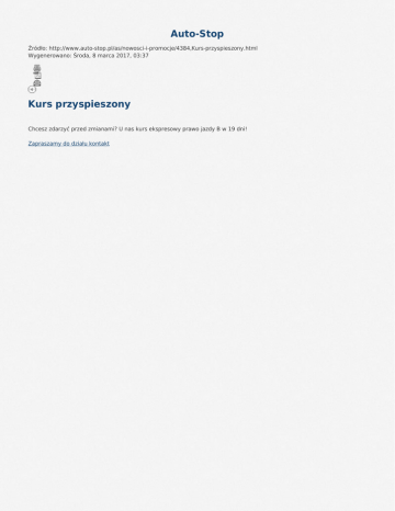 Auto-Stop Źródło: http://www.auto-stop.pl/as/nowosci-i-promocje/4384,Kurs-przyspieszony.html Wygenerowano: Środa, 8 marca 2017, 03:37 Kurs przyspieszony Chcesz zdarzyć przed zmianami? U nas kurs ekspresowy prawo jazdy B w 19 dni! Zapraszamy do działu kontakt