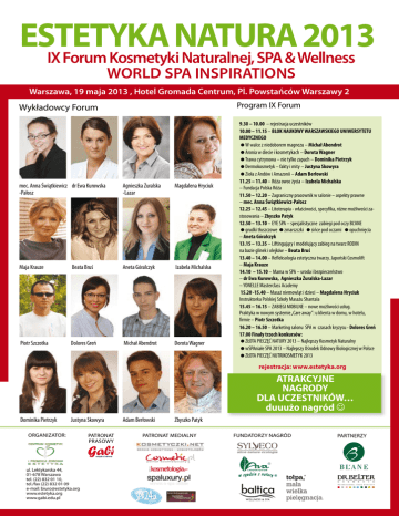 ESTETYKA NATURA 2013 IX Forum Kosmetyki Naturalnej, SPA & Wellness WORLD SPA INSPIRATIONS Warszawa, 19 maja 2013 , Hotel Gromada Centrum, Pl. Powstańców Warszawy 2 Program IX Forum Wykładowcy Forum mec. Anna Świątkiewicz dr Ewa Kurowska -Pałosz Agnieszka Żuralska -Lazar Magdalena Hryciuk Maja Krauze Beata Bruś Aneta Góralczyk Izabela Michalska Piotr Szczotka Dolores Greń Michał Abendrot Dorota Wagner 9.30 – 10.00 – rejestracja uczestników 10.00 – 11.15 – BLOK NAUKOWY WARSZAWSKIEGO UNIWERSYTETU MEDYCZNEGO W walce z niedoborem magnezu – Michał Abendrot Aronia w diecie i kosmetykach – Dorota Wagner Trawa cytrynowa – nie tylko zapach – Dominika Pietrzyk Dermokosmetyk – fakty i mity – Justyna Skowyra Zioła z Andów i Amazonii – Adam Berłowski 11.25 – 11.40 – Róża owoc życia – Izabela Michalska – Fundacja Polska Róża 11.50 – 12.20 – Zagraniczny pracownik w salonie – aspekty prawne – mec. Anna Świątkiewicz-Pałosz 12.25 – 12.45 – Litoterapia - właściwości, specyfika, różne możliwości zastosowania – Zbyszko Patyk 12.50 – 13.10 – EYE SPA – specjalistyczne zabiegi pod oczy BL’ANE grudki tłuszczowe zmarszczki sińce pod oczami opuchnięcia – Aneta Góralczyk 13.15 – 13.35 – Liftingujący i modelujący zabieg na twarz RODIN na bazie glinek i olejków – Beata Bruś 13.40 – 14.00 – Refleksologia estetyczna twarzy. Japoński Cosmolift – Maja Krauze 14.10 – 15.10 – Mama w SPA – uroda i bezpieczeństwo – dr Ewa Kurowska, Agnieszka Żuralska-Lazar – YONELLE Masterclass Academy 15.20 -15.40 – Masaż niemowląt i dzieci – Magdalena Hryciuk Instruktorka Polskiej Szkoły Masażu Shantala 15.45 – 16.15 – ZABIEGI MOBILNE – nowe możliwości usług. Praktyka w nowym systemie „Care away”: u klienta w domu, w hotelu, firmie – Piotr Szczotka 16.20 – 16.50 – Marketing salonu SPA w czasach kryzysu - Dolores Greń 17.00 Finały trzech konkursów: ZŁOTA PIECZĘĆ NATURY 2013 – Najlepszy Kosmetyk Naturalny wSPAniałe SPA 2013 – Najlepszy Ośrodek Odnowy Biologicznej w Polsce ZŁOTA PIECZĘĆ NUTRIKOSMETYK 2013 rejestracja: www.estetyka.org ATRAKCYJNE NAGRODY DLA UCZESTNIKÓW… duuużo nagród Dominika Pietrzyk Justyna Skowyra organizator: ul. Lektykarska 44, 01-678 Warszawa tel. (22) 832 01 10, tel./fax (22) 832 01 09 e-mail: [email protected] www.estetyka.org www.gabi.edu.pl patronat prasowy Adam Berłowski Zbyszko Patyk patronat medialny FUNDATORzy NAGRÓD parTNERzy