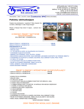 SPÓŁDZIELNIA TURYSTYCZNA 32-600 Oświęcim, ul. Solskiego 2 telefony: (0 48 33) 842-43-76, 842-27-19 tel/fax: (0 48 33) 842-59-94 e-mail: [email protected] Internet: www.turysta.oswiecim.pl Strona główna Oferta Lato 2012 - krajowe Leskowiec SPA Pakiety odchudzające Pakiety odchudzające Czujesz się przemęczony i wypalony? Stres dopada Cię na dobre, odbierając Ci całą Twoją energię? Wizyta w Naszym Spa doda Ci wigoru , wzmocni siły i odpręży! 6 DNIOW Y PAKIET "AKTYW NE ODCHUDZANIE" (DLA GRUP MIN . 4 OSOBOWYCH) CENA W POKOJU 1 0SOBOWYM..............................................................1330 Zł CENA W POKOJU 2 OSOBOWYM..............................................................1192 Zł OSZCZĘDZASZ 61 Zł * KONSULTACJA LEKARSKA * ANALIZA CIAŁA * 3 X WYCIECZKI W GÓRY (W ZALEŻNOŚCI OD POGODY) * CODZIENNE ZAJĘCIA RUCHOWE: - GIMNASTYKA PORANNA: JOGA, PILATES, JOGING - WIECZORNE ZAJĘCIA RUCHOWE: AQUA AEROBIK LUB BASEN DOSTĘPNY NA TERENIE OBIEKTU * CODZIENNIE DO DYSPOZYCJI: BASEN, SIŁOWNIA, SALA GIMNASTYCZNA, PING- PONG * 3 X VACU- FIT/ 30 MIN * 3 X ELEKTROSTYMULACJA (ZABIEGI PUNKTOWE) * PEŁNE WYŻYWIENIE (ŚNIADANIE, OBIAD, KOLACJA) * KAWA, HERBATA, WODA BEZ OGRANICZEŃ * MONITOROWANY PARKING PAKIET 6 DNIOW Y INTENSYW NIE WYSZCZUPLAJĄCY * CENA W POKOJU 1 OSOBOWYM.................................................1777 ZŁ * CENA W POKOJU 2 OSOBOWYM.................................................1653 ZŁ * KONSULTACJA LEKARSKA * ANALIZA CIAŁA * 3 X VACU-FIT/ 30 MIN * 4 X ELEKTROSTYMULACJA (ZABIEG PUNKTOWY NP. BRZUCH, UDA) * 3 X BODY HEALTH/CZĘŚCIOWY * 1 X ZABIEG MODELUJĄCY SYLWETKĘ W KAPSULE SPA NEOQI/ CZĘŚCIOWY * 1 X KĄPIEL W KAPSULE SPA NEOQI * 1 X MASAŻ KLASYCZNY/ CZĘŚCIOWY * 3 X AQUA AEROBIK * 1 X JACUZZI/ 30min * 3 X SAUNA * 5 X ZAJĘCIA RUCHOWE * CODZIENNIE DO DYSPOZYCJI: BASEN, SIŁOWNIA, SALA GIMNASTYCZNA * PEŁNE WYŻYWIENIE (ŚNIADANIE, OBIAD, KOLACJA) (DIETA 1300 KAL0RII) * KAWA, WODA, HERBATA BEZ OGRANICZEŃ * MONITOROWANY PARKING CENY PAKIETÓW MOGĄ ULEC ZMIANIE