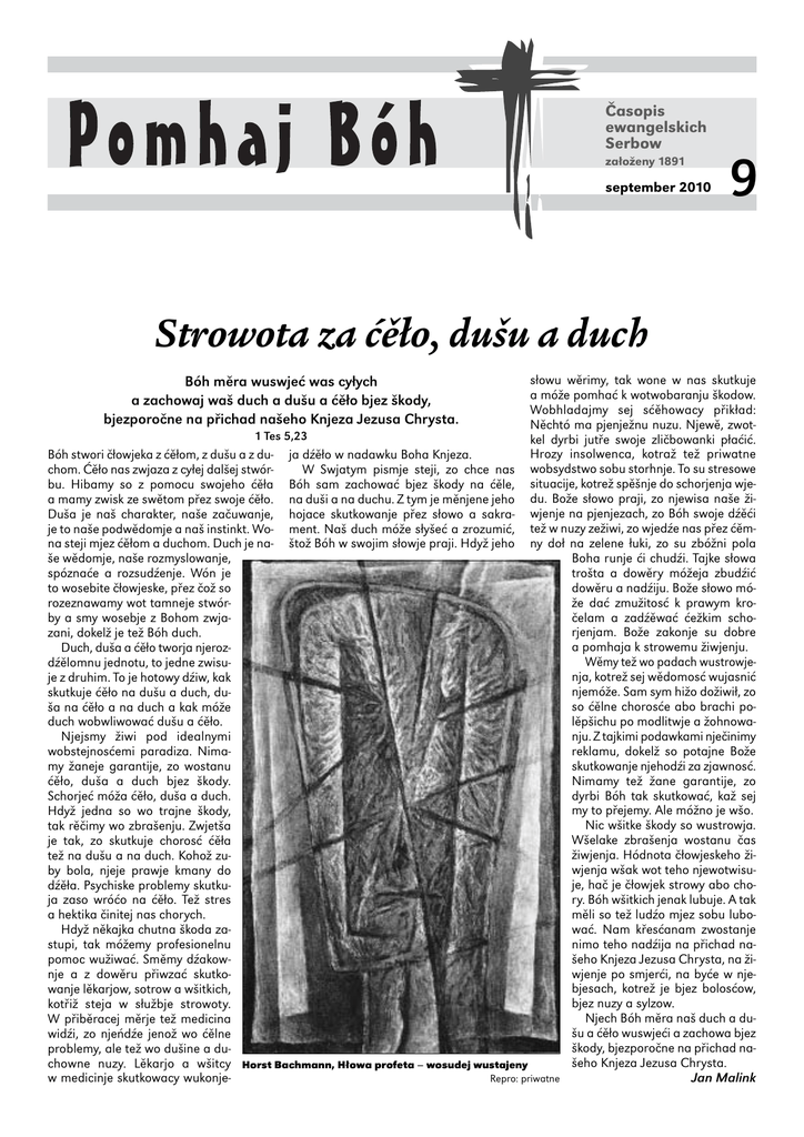 Časopis ewangelskich Serbow załoženy 1891 september 2010 9 Strowota za ćěło, dušu a duch słowu wěrimy, tak wone w nas skutkuje a móže pomhać k wotwobaranju škodow. Wobhladajmy sej sćěhowacy přikład: Něchtó ma pjenježnu nuzu. Njewě, zwot1 Tes 5,23 kel dyrbi jutře swoje zličbowanki płaćić. Hrozy insolwenca, kotraž tež priwatne Bóh stwori čłowjeka z ćěłom, z dušu a z du- ja dźěło w nadawku Boha Knjeza. chom. Ćěło nas zwjaza z cyłej dalšej stwórW Swjatym pismje steji, zo chce nas wobsydstwo sobu storhnje. To su stresowe bu. Hibamy so z pomocu swojeho ćěła Bóh sam zachować bjez škody na ćěle, situacije, kotrež spěšnje do schorjenja wjea mamy zwisk ze swětom přez swoje ćěło. na duši a na duchu. Z tym je měnjene jeho du. Bože słowo praji, zo njewisa naše žiDuša je naš charakter, naše začuwanje, hojace skutkowanje přez słowo a sakra- wjenje na pjenjezach, zo Bóh swoje dźěći je to naše podwědomje a naš instinkt. Wo- ment. Naš duch móže słyšeć a zrozumić, tež w nuzy zežiwi, zo wjedźe nas přez ćěmna steji mjez ćěłom a duchom. Duch je na- štož Bóh w swojim słowje praji. Hdyž jeho ny doł na zelene łuki, zo su zbóžni pola Boha runje ći chudźi. Tajke słowa še wědomje, naše rozmyslowanje, trošta a dowěry móžeja zbudźić spóznaće a rozsudźenje. Wón je dowěru a nadźiju. Bože słowo móto wosebite čłowjeske, přez čož so že dać zmužitosć k prawym krorozeznawamy wot tamneje stwórčelam a zadźěwać ćežkim schoby a smy wosebje z Bohom zwjarjenjam. Bože zakonje su dobre zani, dokelž je tež Bóh duch. a pomhaja k strowemu žiwjenju. Duch, duša a ćěło tworja njerozWěmy tež wo padach wustrowjedźělomnu jednotu, to jedne zwisunja, kotrež sej wědomosć wujasnić je z druhim. To je hotowy dźiw, kak njemóže. Sam sym hižo dožiwił, zo skutkuje ćěło na dušu a duch, duso ćělne chorosće abo brachi poša na ćěło a na duch a kak móže lěpšichu po modlitwje a žohnowaduch wobwliwować dušu a ćěło. nju. Z tajkimi podawkami nječinimy Njejsmy žiwi pod idealnymi reklamu, dokelž so potajne Bože wobstejnosćemi paradiza. Nimaskutkowanje njehodźi za zjawnosć. my žaneje garantije, zo wostanu Nimamy tež žane garantije, zo ćěło, duša a duch bjez škody. dyrbi Bóh tak skutkować, kaž sej Schorjeć móža ćěło, duša a duch. my to přejemy. Ale móžno je wšo. Hdyž jedna so wo trajne škody, Nic wšitke škody so wustrowja. tak rěčimy wo zbrašenju. Zwjetša Wšelake zbrašenja wostanu čas je tak, zo skutkuje chorosć ćěła žiwjenja. Hódnota čłowjeskeho žitež na dušu a na duch. Kohož zuwjenja wšak wot teho njewotwisuby bola, njeje prawje kmany do je, hač je čłowjek strowy abo chodźěła. Psychiske problemy skutkury. Bóh wšitkich jenak lubuje. A tak ja zaso wróćo na ćěło. Tež stres měli so tež ludźo mjez sobu luboa hektika činitej nas chorych. wać. Nam křesćanam zwostanje Hdyž někajka chutna škoda zanimo teho nadźija na přichad nastupi, tak móžemy profesionelnu šeho Knjeza Jezusa Chrysta, na žipomoc wužiwać. Směmy dźakowwjenje po smjerći, na byće w njenje a z dowěru přiwzać skutkobjesach, kotrež je bjez bolosćow, wanje lěkarjow, sotrow a wšitkich, bjez nuzy a sylzow. kotřiž steja w słužbje strowoty. Njech Bóh měra naš duch a duW přiběracej měrje tež medicina šu a ćěło wuswjeći a zachowa bjez widźi, zo njeńdźe jenož wo ćělne škody, bjezporočne na přichad naproblemy, ale tež wo dušine a dušeho Knjeza Jezusa Chrysta. chowne nuzy. Lěkarjo a wšitcy Horst Bachmann, Hłowa profeta – wosudej wustajeny Jan Malink Repro: priwatne w medicinje skutkowacy wukonje- Bóh měra wuswjeć was cyłych a zachowaj waš duch a dušu a ćěło bjez škody, bjezporočne na přichad našeho Knjeza Jezusa Chrysta. 2 september 2010 Mosty twarić město hrjebje ryć Pomhaj Bóh Pokiwy Literarny wječork Basnica Lenka (Christiana Piniekowa) předstaji štwórtk, 2. septembra, w 19.30 hodź. w Budyskej Smolerjec kniharni swoju nowu zběrku basnjow „wokognuśa nimjernosći – wokomiki wěčnosće – augenblicke der ewigkeit“. Poswjećenje stołpa Při rěce bydleštaj něhdy buraj, na lěwym w rěce mjenje wody, tak zo sahaše wjele boku jedyn, tamny na prawym. wulkich kamjenjow z wody, a wot nětka Buraj běštaj na so zawistnaj. Hdyž rano móžeštej dźěsći po kamjenjach prěki skaworaštaj, swarješe tón jedyn, dokelž le- kać. Kóžde připołdnje zetkawaštej so wožeše jeho polo w chłódku, te jeho susoda srjedź rěki na wulkim kamjenju a powědapak w słóncu. Hdyž wječor drjewo kałaštaj, štej sej mjez sobu stawiznički a podawki. swarješe druhi, přetož nětko běše jeho Starši so dźiwachu, zwotkel dźěsći nadobo chěža w chłódku. tak wjele wědźeštej, woni pak nic. Tež žonje teju burow běštej njespokoPo dołhim dešćiku pak dźěsći nadobo jom, tak zo rano, hdyž ta jedna wupłokanu přestaštej stawiznički powědać, přestaštej drastu wěšeše, hižo prěki lózyske słowa spěwać, přestaštej so smjeć. Woda w rěce škrěčeše, wječor pak běše zaso stupała Ze wšej ponižnosću ta druha na druhi bok a dźěćacy móst běše a łahodnosću a sćerpliwosću hrozne słowa wołaše. so zhubił. Nětko zhoJenož připołdnju, znjesće so mjez sobu w lubosći. nichu starši skónčnje hdyž słónco wysoko připołdniše potajnz Lista Pawoła na Efeziskich 4,2 na njebju steješe, knjestwo swojeju dźěsći žeše měr, přetož nětko ležeštaj buraj ze a započachu přemyslować. swojimaj žonomaj spicy pod jabłučinomaj. A jako běchu dołho dosć přemyslowali, Dźěsći burskeju swójbow pak sedźeštej wobzamknychu, zhromadnje z dźěsćomaj w připołdnišim času při wodźe. Jimaj so z kamjenjow a drjewa twarić móst přez wostudźeše. (čěska powěsć) rěku. Tola jedneho rjaneho dnja pluskotaše Tekst a foto: Gabriela Gruhlowa