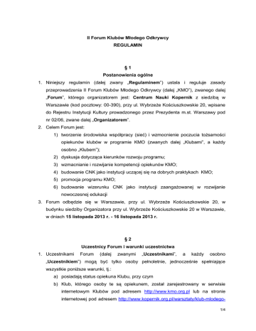 II Forum Klubów Młodego Odkrywcy REGULAMIN §1 Postanowienia ogólne 1. Niniejszy regulamin (dalej zwany „Regulaminem”) ustala i reguluje zasady przeprowadzenia II Forum Klubów Młodego Odkrywcy (dalej „KMO”), zwanego dalej „Forum”, którego organizatorem jest: Centrum Nauki Kopernik z siedzibą w Warszawie (kod pocztowy: 00-390), przy ul. Wybrzeże Kościuszkowskie 20, wpisane do Rejestru Instytucji Kultury prowadzonego przez Prezydenta m.st. Warszawy pod nr 02/06, zwane dalej „Organizatorem”. 2. Celem Forum jest: 1) tworzenie środowiska współpracy (sieć) i wzmocnienie poczucia tożsamości opiekunów klubów w programie KMO (zwanych dalej „Klubami”, a każdy osobno „Klubem”); 2) dyskusja dotycząca kierunków rozwoju programu; 3) wzmacnianie i rozwijanie kompetencji opiekunów KMO; 4) budowanie CNK jako instytucji uczącej się na dobrych praktykach KMO; 5) promocja programu KMO; 6) budowanie wizerunku CNK jako instytucji zaangażowanej w rozwijanie nowoczesnej edukacji 3. Forum odbędzie się w Warszawie, przy ul. Wybrzeże Kościuszkowskie 20, w budynku siedziby Organizatora przy ul. Wybrzeże Kościuszkowskie 20 w Warszawie, w dniach 15 listopada 2013 r. - 16 listopada 2013 r. §2 Uczestnicy Forum i warunki uczestnictwa 1. Uczestnikami Forum (dalej zwanymi „Uczestnikami”, a każdy osobno „Uczestnikiem”) mogą być tylko osoby pełnoletnie, jednocześnie spełniające wszystkie poniższe warunki, tj.: a) posiadają status opiekuna Klubu, przy czym b) Klub, którego osoby te są opiekunem, został zarejestrowany w serwisie internetowym Klubów pod adresem http://www.kmo.org.pl lub na stronie internetowej pod adresem http://www.kopernik.org.pl/warsztaty/klub-mlodego1/4 odkrywcy najpóźniej do dnia 15 września 2013 r., a w wypadku, gdy do tego dnia Klub nie został zarejestrowany – prześlą zgłoszenie swojego udziału w Forum drogą poczty elektronicznej (e-mail) na adres [email protected] do dnia 14 października 2013 r.; c) prawidłowo wypełnią i zapiszą formularz zgłoszeniowy zamieszczony na stronie internetowej http://www.forumkmo.kopernik.org.pl najpóźniej w dniu 14 października 2013 r. do godz. 24.00, zaś wypełnienie i zapisanie formularza zgłoszeniowego odbędzie się drogą środków komunikacji elektronicznej (przy wykorzystaniu funkcji dostępnych w ramach strony internetowej wskazanej w niniejszym punkcie). 2. Poprzez zapisanie wypełnionego formularza zgłoszeniowego, o którym mowa w ust. 1 pkt c) powyżej, Uczestnik oświadcza, że zapoznał się w całości z Regulaminem i akceptuje wszystkie jego postanowienia. 3. Poprzez zapisanie wypełnionego formularza zgłoszeniowego, o którym mowa w ust. 1 pkt c), Uczestnik zgłasza swój udział w Forum. Przy określaniu chwili zgłoszenia decyduje chwila ukończenia zapisu tego formularza zgłoszeniowego w systemie teleinformatycznym Organizatora. 4. Udział w Forum jest bezpłatny. 5. Uczestnicy Forum są zobowiązani do: a) przestrzegania zamieszczonego Regulaminu na stronie zwiedzania Centrum Nauki internetowej Organizatora pod Kopernik adresem http://www.kopernik.org, oraz dostępnego w siedzibie Organizatora, b) stosowania się do poleceń porządkowych Organizatora lub wyznaczonych przez niego osób, c) zachowywania się w sposób niezagrażający bezpieczeństwu innych osób, a w szczególności do przestrzegania przepisów BHP i ppoż. 6. Uczestnicy wyrażają zgodę na rejestrację przebiegu Forum, oraz na utrwalenie jego przebiegu techniką audiowizualną i fotograficzną przez Organizatora. Uczestnicy wyrażają również zgodę na nieodpłatne utrwalanie, odtwarzanie i rozpowszechnianie swojego wizerunku oraz wypowiedzi przez Organizatora dla celów opublikowania w internetowych i pisemnych publikacjach, informacjach i materiałach promocyjnych oraz na stronach internetowych Organizatora w zakresie dotyczącym Forum, w tym promocji Forum, a także w zakresie promocji działalności Organizatora. Prawo do korzystania z wizerunku i wypowiedzi Uczestników następuje z chwilą utrwalenia podczas przebiegu Forum. 2/4 §3 Dane osobowe 1. Poprzez zapisanie wypełnionego formularza zgłoszeniowego, o którym mowa w § 2 ust. 1 pkt c) powyżej, Uczestnik wyraża zgodę na przetwarzanie przez Organizatora jego danych osobowych zgodnie z ustawą z dnia 29 sierpnia 1997 r. o ochronie danych osobowych (Dz. U. z 2002, Nr 101, poz. 926 ze zm.) w zakresie udostępnionym przez Uczestnika w formularzu zgłoszeniowym, wyłącznie dla celów organizacji Forum, w tym umieszczenia w materiałach produkowanych na potrzeby organizacji Forum. 2. Podanie danych osobowych jest dobrowolne. 3. Uczestnikowi przysługuje prawo dostępu do jego danych osobowych, do ich poprawienia oraz usunięcia. 4. Administratorem danych osobowych jest Organizator, którego adres siedziby i pełna nazwa zostały wskazane w § 1 ust. 1 Regulaminu. 5. Organizator nie ponosi odpowiedzialności za skutki podania błędnych danych osobowych przez Uczestnika. §4 Zwrot kosztów zakwaterowania i podróży 1. Uczestnikom zamieszkującym poza m. st. Warszawą, Organizator zapewnia: a) dwa noclegi, przypadające, według wyboru Uczestnika, na dwa z trzech następujących terminów: z 14 na 15 listopada 2013 r., z 15 na 16 listopada 2013 r., z 16 na 17 listopada 2013 r., b) zwrot uzasadnionych kosztów podróży do kwoty 200,00 zł (słownie: dwieście złotych), 2. Zwrot uzasadnionych kosztów podróży, o których mowa w ust. 1 pkt b) powyżej, będzie możliwy pod warunkiem doręczenia do siedziby Organizatora, najpóźniej do dnia 6 grudnia 2013 r., alternatywnie następujących dokumentów: a) dla Uczestników korzystających z własnych pojazdów – ewidencji przebiegu pojazdu, b) dla Uczestników korzystających z środków transportu publicznego – biletów. 3. W uzasadnionych wypadkach, według swobodnej decyzji Organizatora, kwota, o której mowa w ust. 1 pkt b) powyżej, może ulec zwiększeniu. W tym celu