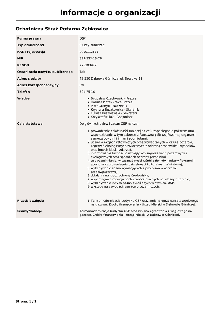 Informacje o organizacji Ochotnicza Straż Pożarna Ząbkowice Forma prawna OSP Typ działalności Służby publiczne KRS / rejestracja 0000112671 NIP 629-223-15-76 REGON 276303927 Organizacja pożytku publicznego Tak Adres siedziby 42-520 Dąbrowa Górnicza, ul. Szosowa 13 Adres korespondencyjny j.w. Telefon 721-75-16 Władze Cele statutowe Bogusław Czechowski - Prezes Dariusz Piątek - V-ce Prezes Piotr Gotfryd - Naczelnik Krystyna Buczkowska - Skarbnik Łukasz Kuszniewski - Sekretarz Krzysztof Kulak - Gospodarz Do głównych celów i zadań OSP należą: 1. prowadzenie działalności mającej na celu zapobieganie pożarom oraz współdziałanie w tym zakresie z Państwową Strażą Pożarną, organami samorządowymi i innymi podmiotami, 2. udział w akcjach ratowniczych przeprowadzanych w czasie pożarów, zagrożeń ekologicznych związanych z ochroną środowiska, wypadków oraz innych klęsk i zdarzeń, 3. informowanie ludności o istniejących zagrożeniach pożarowych i ekologicznych oraz sposobach ochrony przed nimi, 4. upowszechnianie, w szczególności wśród członków, kultury fizycznej i sportu oraz prowadzenia działalności kulturalnej i oświatowej, 5. wykonywanie zadań wynikających z przepisów o ochronie przeciwpożarowej, 6. działania na rzecz ochrony środowiska, 7. wspomaganie rozwoju społeczności lokalnych na własnym terenie, 8. wykonywanie innych zadań określonych w statucie OSP, 9. występy na zawodach sportowo-pożarniczych. Przedsięwzięcia Granty/dotacje Strona: 1 / 1 Powered by TCPDF (www.tcpdf.org) 1. Termomodernizacja budynku OSP oraz zmiana ogrzewania z węglowego na gazowe. Źródło finansowania - Urząd Miejski w Dąbrowie Górniczej. Termomodernizacja budynku OSP oraz zmiana ogrzewania z węglowego na gazowe. Źródło finansowania - Urząd Miejski w Dąbrowie Górniczej.