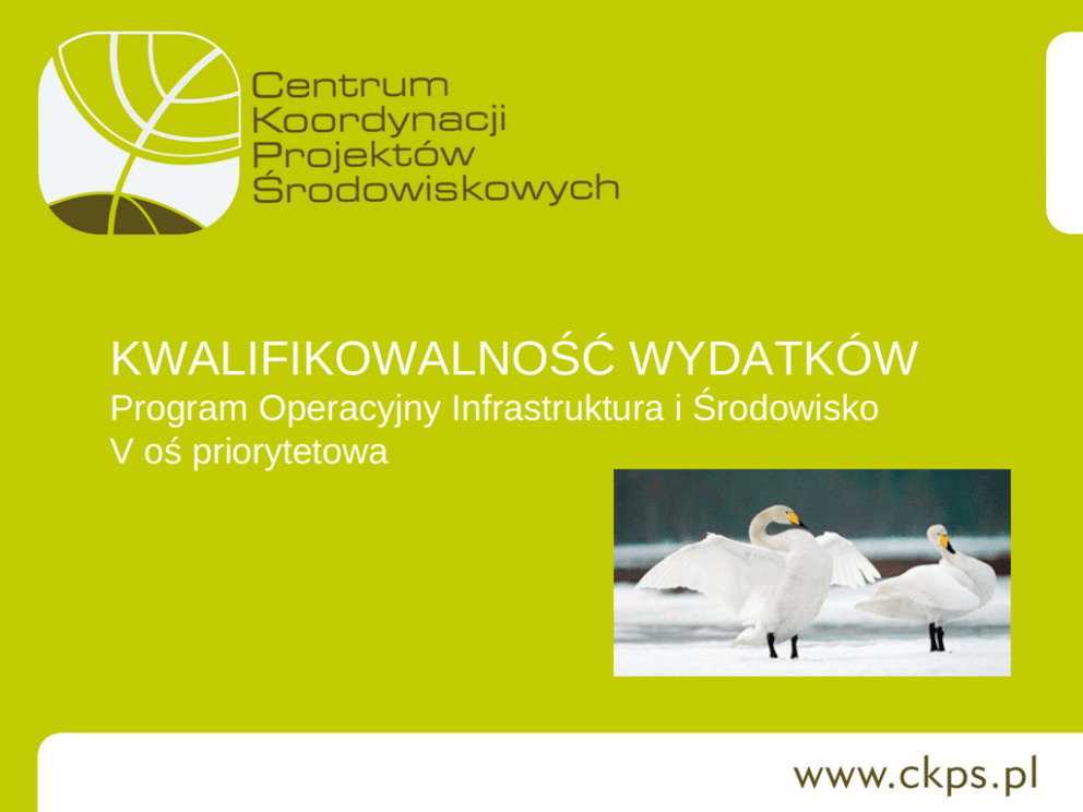 KWALIFIKOWALNOŚĆ WYDATKÓW Program Operacyjny Infrastruktura i Środowisko V oś priorytetowa Szkolenie współfinansowane jest przez Unię Europejską ze środków Funduszu Rozwoju Regionalnego w ramach pomocy technicznej Programu Operacyjnego Infrastruktura i Środowisko WYDATKI KWALIFIKOWALNE Ogólne zasady dotyczące kwalifikowania wydatków WYDATKI KWALIFIKOWALNE PODSTAWA Wytyczne w zakresie kwalifikowania wydatków w ramach PO IiŚ Ministerstwo Rozwoju Regionalnego WYDATKI KWALIFIKOWALNE KWALIFIKOWALNOŚĆ PROJEKTU A KWALIFIKOWALNOŚĆ WYDATKÓW • Sam fakt, że dany projekt kwalifikuje się do wsparcia w ramach PO IiŚ nie oznacza jeszcze, że wszystkie wydatki poniesione podczas realizacji tego projektu będą uznane za kwalifikowalne. WYDATKI KWALIFIKOWALNE ZASIĘG GEOGRAFICZNY KWALIFIKOWALNOŚCI • Projekt współfinansowany w ramach PO IiŚ powinien być realizowany na terytorium Rzeczpospolitej Polskiej. • Odstępstwa od tej zasady są możliwe tylko za zgodą IZ i tylko w sytuacji, kiedy projekt przynosi znaczące korzyści dla obszaru objętego wsparciem przez dany program. • Jako zgodę rozumie się umieszczenie odpowiedniego postanowienia w Programie Operacyjnym lub akceptację realizacji projektu w takim kształcie w umowie o dofinansowanie. WYDATKI KWALIFIKOWALNE TRWAŁOŚĆ PROJEKTU • Każdy projekt współfinansowany ze środków funduszy strukturalnych lub FS musi zachować trwałość przez okres co najmniej 5 lat od daty stanowiącej ostatni dzień okresu kwalifikowania wydatków wskazanego w umowie o dofinansowanie. • Pojęcie „trwałości projektu” rozumiane jest jako nie poddanie projektu tzw. znaczącej modyfikacji, tj.: a) modyfikacji mającej znaczny wpływ na charakter lub warunki realizacji projektu lub powodującej uzyskanie nieuzasadnionej korzyści przez przedsiębiorstwo lub podmiot publiczny oraz b) wynikającej ze zmiany charakteru własności elementu infrastruktury (…). WYDATKI KWALIFIKOWALNE OKRES KWALIFIKOWANIA WYDATKÓW (1) • Początek okresu kwalifikowania wydatków dla PO IiŚ stanowi 1 stycznia 2007 r. • Koniec okresu kwalifikowania wydatków dla PO IiŚ stanowi data 31 grudnia 2015 r. • Ostateczny okres kwalifikowania wydatków dla danego projektu zostanie określony w umowie o dofinansowanie zawieranej z Beneficjentem, która określi zarówno początkową jak i końcową datę kwalifikowalności wydatku. WYDATKI KWALIFIKOWALNE OKRES KWALIFIKOWANIA WYDATKÓW (2) • Nie ma przepisów uniemożliwiających finansowanie w ramach PO IiŚ projektów częściowo bądź całkowicie zrealizowanych • Wydatki poniesione będą musiały spełniać wszystkie zasady dotyczące kwalifikowania wydatków obowiązujące dla projektów, których realizacja nie została rozpoczęta przed podpisaniem umowy o dofinansowanie, tj. przede wszystkim dotyczące pomocy publicznej, zamówień publicznych oraz płatności – konieczność analizy poniesionych wydatków pod kątem zgodności z zasadami kwalifikowania projektów – przed złożeniem wniosku!!! WYDATKI KWALIFIKOWALNE PROCEDURA ZAMÓWIEŃ PUBLICZNYCH • Beneficjent jest zobowiązany do zawierania umów z wykonawcami dla zadań objętych projektem zgodnie z przepisami ustawy Pzp w przypadku gdy wymóg jej stosowania wynika z tej ustawy. • Beneficjent zawierający umowy, których zawieranie jest wyłączone z zakresu stosowania ustawy Pzp, zobowiązany jest zawierać umowy z wykonawcami w trybie przetargu, zgodnie z art. 701 – 705 K.c, z uwzględnieniem następujących zasad: a) jawności b) niedyskryminacyjnego opisu przedmiotu zamówienia c) równego dostępu dla podmiotów gospodarczych ze wszystkich państw członkowskich e) odpowiednich terminów f) przejrzystego i obiektywnego podejścia WYDATKI KWALIFIKOWALNE WYDATKI FAKTYCZNIE PONIESIONE (1) • Jedynie wydatek faktycznie poniesiony może być uznany za kwalifikowalny. • Pod pojęciem wydatku faktycznie poniesionego należy rozumieć wydatek faktycznie zrealizowany w znaczeniu kasowym (jako rozchód środków pieniężnych z rachunku bankowego Beneficjenta lub innego podmiotu upoważnionego do ponoszenia wydatków kwalifikowalnych). • Wydatek faktycznie poniesiony powinien być poparty fakturą z oznaczeniem zapłaty lub dokumentami księgowymi o równoważnej wartości dowodowej wraz z potwierdzeniem płatności na rzecz wykonawcy w postaci wyciągu z rachunku bankowego. WYDATKI KWALIFIKOWALNE WYDATKI FAKTYCZNIE PONIESIONE (2) • Jedynym wyjątkiem od zasad przedstawionych powyżej są koszty związane z wkładem niepieniężnym lub amortyzacją, w zakresie w jakim zgodnie z Wytycznymi mogą być uznane za kwalifikowalne. WYDATKI KWALIFIKOWALNE WKŁAD NIEPIENIĘŻNY • Wkład niepieniężny wniesiony na rzecz projektu przez beneficjenta może mieć postać dóbr lub usług, za które nie dokonano płatności: wniesienie nieruchomości, urządzeń lub materiałów (surowców), ekspertyz lub nieodpłatnej pracy wykonywanej przez wolontariuszy. • W przypadku wniesienia nieodpłatnej pracy wykonywanej przez wolontariuszy, jej wartość określa się z uwzględnieniem poświęconego czasu na jej wykonanie oraz średniej stawki godzinowej lub dziennej występującej na rynku za dany rodzaj pracy (konieczność zawarcia umowy wolontariackiej oraz prowadzenia karty pracy) WYDATKI KWALIFIKOWALNE EFEKTYWNOŚĆ WYDATKÓW • Za kwalifikowalny może być uznany jedynie wydatek efektywny, tj. wydatek zapewniający osiągniecie najlepszego efektu przy możliwie najniższych kosztach. • Ciężar udowodnienia, iż wydatek został poniesiony z zachowaniem osiągnięcia najlepszego efektu przy możliwie najniższych kosztach spoczywa na Beneficjencie. WYDATKI KWALIFIKOWALNE ZAKAZ PODWÓJNEGO FINANSOWANIA • Na potrzeby Wytycznych podwójne finansowanie oznacza niedozwolone refundowanie całkowite lub częściowe danego wydatku dwa razy ze środków publicznych – krajowych lub wspólnotowych. • Podwójnym finansowaniem je