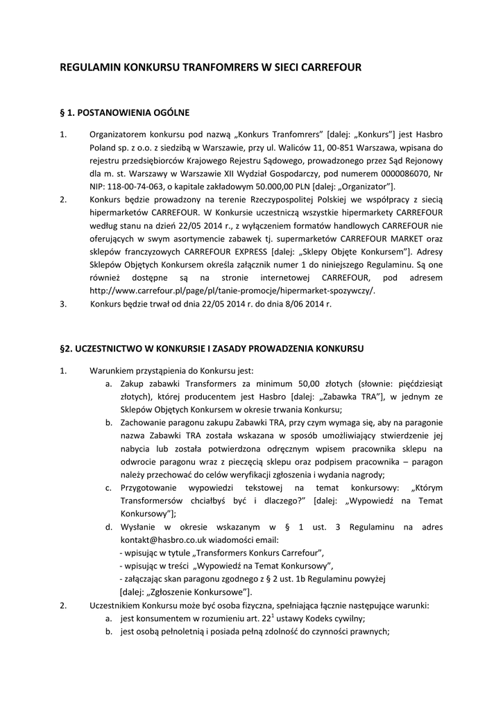 REGULAMIN KONKURSU TRANFOMRERS W SIECI CARREFOUR § 1. POSTANOWIENIA OGÓLNE 1. 2. 3. Organizatorem konkursu pod nazwą „Konkurs Tranfomrers” [dalej: „Konkurs”] jest Hasbro Poland sp. z o.o. z siedzibą w Warszawie, przy ul. Waliców 11, 00-851 Warszawa, wpisana do rejestru przedsiębiorców Krajowego Rejestru Sądowego, prowadzonego przez Sąd Rejonowy dla m. st. Warszawy w Warszawie XII Wydział Gospodarczy, pod numerem 0000086070, Nr NIP: 118-00-74-063, o kapitale zakładowym 50.000,00 PLN [dalej: „Organizator”]. Konkurs będzie prowadzony na terenie Rzeczypospolitej Polskiej we współpracy z siecią hipermarketów CARREFOUR. W Konkursie uczestniczą wszystkie hipermarkety CARREFOUR według stanu na dzień 22/05 2014 r., z wyłączeniem formatów handlowych CARREFOUR nie oferujących w swym asortymencie zabawek tj. supermarketów CARREFOUR MARKET oraz sklepów franczyzowych CARREFOUR EXPRESS [dalej: „Sklepy Objęte Konkursem”]. Adresy Sklepów Objętych Konkursem określa załącznik numer 1 do niniejszego Regulaminu. Są one również dostępne są na stronie internetowej CARREFOUR, pod adresem http://www.carrefour.pl/page/pl/tanie-promocje/hipermarket-spozywczy/. Konkurs będzie trwał od dnia 22/05 2014 r. do dnia 8/06 2014 r. §2. UCZESTNICTWO W KONKURSIE I ZASADY PROWADZENIA KONKURSU 1. 2. Warunkiem przystąpienia do Konkursu jest: a. Zakup zabawki Transformers za minimum 50,00 złotych (słownie: pięćdziesiąt złotych), której producentem jest Hasbro [dalej: „Zabawka TRA”], w jednym ze Sklepów Objętych Konkursem w okresie trwania Konkursu; b. Zachowanie paragonu zakupu Zabawki TRA, przy czym wymaga się, aby na paragonie nazwa Zabawki TRA została wskazana w sposób umożliwiający stwierdzenie jej nabycia lub została potwierdzona odręcznym wpisem pracownika sklepu na odwrocie paragonu wraz z pieczęcią sklepu oraz podpisem pracownika – paragon należy przechować do celów weryfikacji zgłoszenia i wydania nagrody; c. Przygotowanie wypowiedzi tekstowej na temat konkursowy: „Którym Transformersów chciałbyś być i dlaczego?” [dalej: „Wypowiedź na Temat Konkursowy”]; d. Wysłanie w okresie wskazanym w § 1 ust. 3 Regulaminu na adres [email protected] wiadomości email: - wpisując w tytule „Transformers Konkurs Carrefour”, - wpisując w treści „Wypowiedź na Temat Konkursowy”, - załączając skan paragonu zgodnego z § 2 ust. 1b Regulaminu powyżej [dalej: „Zgłoszenie Konkursowe”]. Uczestnikiem Konkursu może być osoba fizyczna, spełniająca łącznie następujące warunki: a. jest konsumentem w rozumieniu art. 221 ustawy Kodeks cywilny; b. jest osobą pełnoletnią i posiada pełną zdolność do czynności prawnych; 3. 4. c. zamieszkuje na terytorium Rzeczypospolitej Polskiej i posiada adres do doręczeń na terenie Rzeczypospolitej Polskiej; d. spełnia warunki uczestnictwa w Konkursie określone w § 2 ust. 1 powyżej; e. nie podlega wykluczeniu z uczestnictwa w Konkursie, zgodnie z postanowieniami ust. 3 i 4 poniżej. W Konkursie nie mogą uczestniczyć pracownicy Organizatora, jak również inne osoby bezpośrednio zaangażowane przez Organizatora w przygotowaniu lub przeprowadzeniu Konkursu, a także członkowie najbliższej rodziny tychże osób. Przez członków najbliższej rodziny, o których mowa w ust. 3 powyżej, rozumie się: wstępnych, zstępnych, rodzeństwo, małżonków, rodziców małżonków oraz osoby pozostające w stosunku przysposobienia. §3. NAGRODA 1. 2. 3. 4. 5. 6. Dla uczestników Konkursu przewidziano jedną nagrodę rzeczową, w postaci wycieczki dla dwóch osób (dziecko + pełnoletni opiekun) do Berlina na Europejską Premierę Filmu Transformers 4 [dalej: „Nagroda”]. Szczegóły Nagrody (przewidywany termin wyjazdu, czas trwania, świadczenia gwarantowane w trakcie wycieczki) stanowi załącznik numer 2 do niniejszego Regulaminu Łączna wartość Nagrody w dniu rozpoczęcia Konkursu nie jest znana i zostanie ustalona najpóźniej do dnia 10 czerwca 2014 roku. Przewiduje się, że wartość Nagrody wyniesie nie więcej niż 6.000,00 zł (słownie: sześć tysięcy złotych). Niezależnie od tego Zwycięzca Konkursu otrzyma nagrodę pieniężną w wysokości równej wysokości podatku dochodowego od łącznej wartości Nagrody i nagrody pieniężnej, którą Zwycięzca Konkursu przekaże Organizatorowi, przed wydaniem mu wycieczki, na pokrycie podatku. Należny zryczałtowany podatek od nagród zostanie uiszczony bezpośrednio przez Organizatora. Dokładna wartość Nagrody zostanie podana Zwycięzcy Konkursu po uzyskaniu przez niego tej Nagrody. Uczestnikom Konkursu nie przysługuje prawo do otrzymania ekwiwalentu (pieniężnego, rzeczowego) Nagrody. Nagroda niewykorzystana w terminie wskazanym w załączniku nr 2 do Regulaminu przepada bez możliwości zamiany jej na inną nagrodę lub ekwiwalent. Zwycięzca Konkursu nie ma możliwości zmiany Nagrody, w tym m.in. zmiany terminu wycieczki, lotniska wylotowego i powrotnego, wskazanego w Nagrodzie hotelu czy zagwarantowanych świadczeń. Zwycięzca Konkursu zostanie wyłoniony przez komisję konkursową powołaną przez Organizatora [dalej: „Komisja”]. Komisja czuwa nad prawidłowym przebiegiem Konkursu, w szczególności Komisja wyłoni 1 (słownie: jednego) zwycięzcę Konkursu w terminie do dnia 10 czerwca 2014 r. Werdykt Komisji jest werdyktem ostatecznym w zakresie wyników Konkursu i wyboru najciekawszej wypowiedzi w ramach Wykonania Zadania Konkursowego. Komisja potwierdza zgodność przeprowadzenia Konkursu z Regulaminem. Zwycięzca Konkursu zostanie powiadomiony o wygranej w terminie wskazanym w ust. 4 powyżej, tj. najpóźniej w dniu 10 czerwca 2014 roku poprzez przesłanie wiadomości na adres e-mail wskazany w Zgłoszeniu Konkursowym. W odpowiedzi na wiadomość Organizatora o wygranej, zwycięzca Konkursu jest zobowiązany do wskazania Organizatorowi lub podmiotowi wskazanemu przez Organizatora wszystkich 7. 8. 9.