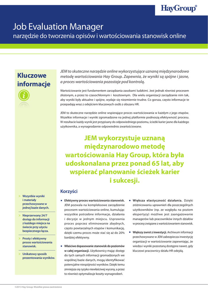 Job Evaluation Manager narzędzie do tworzenia opisów i wartościowania stanowisk online Kluczowe informacje JEM to skuteczne narzędzie online wykorzystujące uznaną międzynarodowo metodę wartościowania Hay Group. Zapewnia, że wyniki są spójne i jasne, a proces wartościowania pozostaje pod kontrolą. Wartościowanie jest fundamentem zarządzania zasobami ludzkimi. Jest jednak również procesem złożonym, a przez to czasochłonnym i kosztownym. Dla wielu organizacji zarządzanie nim tak, aby wyniki były aktualne i spójne, wydaje się niezmiernie trudne. Co gorsza, często informacje te przepadają wraz z odejściem kluczowych osób z obszaru HR. JEM to skuteczne narzędzie online wspierające proces wartościowania w każdym z jego etapów. Wszelkie informacje i wyniki zgromadzone na jednej platformie podnoszą efektywność procesu. W rezultacie każdy wynik jest przypisany do odpowiedniego poziomu, ścieżki karier jasne dla każdego użytkownika, a wynagrodzenie odpowiednio zwartościowane. JEM wykorzystuje uznaną międzynarodowo metodę wartościowania Hay Group, która była udoskonalana przez ponad 65 lat, aby wspierać planowanie ścieżek karier i sukcesji. >> Wszystkie wyniki i materiały przechowywane w jednej bazie danych. Korzyści >> Nieprzerwany 24/7 dostęp do informacji z każdego miejsca na świecie przy użyciu bezpiecznego łącza. >> Prosty i efektywny proces wartościowania stanowisk. >> Unikatowy sposób prezentowania wyników. ©2013 Hay Group. Wszelkie prawa zastrzeżone Efektywny proces wartościowania stanowisk. JEM pozwala na kompleksowe zarządzenie procesem wartościowania online, kumulując wszystkie potrzebne informacje, działania i decyzje w jednym miejscu. Usprawnia proces poprzez eliminowanie zbędnych, często powtarzalnych etapów i komunikację, dzięki czemu proces może stać się aż do 20% bardziej efektywny. Właściwe dopasowanie stanowisk do poziomów w całej organizacji. Użytkownicy mając dostęp do tych samych informacji gromadzonych we wspólnej bazie danych, mogą identyfikować potencjalne niespójności wyników. Dzięki temu zmniejsza się ryzyko niewłaściwej wyceny, a przez to również optymalizuje koszty wynagrodzeń. Większa elastyczność działania. Dzięki zróżnicowaniu uprawnień dla poszczególnych użytkowników (np. ze względu na poziom ekspertyzy) możliwe jest zaangażowanie managerów lub pracowników innych działów w procesy związane z wartościowaniem stanowisk. Większy zwrot z inwestycji. Archiwum informacji przechowywane w JEM zabezpiecza inwestycję organizacji w wartościowanie zapewniając, że wiedza i wyniki pozostaną dostępne nawet, gdy kluczowi pracownicy działu HR odejdą. Jak to działa? Opisz i zwartościuj stanowiska JEM zwiększa efektywność procesu wartościowania udostępniając tabele, kalkulator oraz dostępne moduły w zależności od potrzeb uczestników procesu, czy to z obszaru HR, czy menedżerów liniowych. Zarchiwizuj i przechowuj informacje JEM może przechować tysiące danych o stanowiskach w jednym wspólnym miejscu – zarówno opisy stanowisk, jak i wyniki wartościowania. JEM może zostać skonfigurowany tak, aby oddawać specyfikę organizacji – zarówno strukturę poziomów stanowisk, jak i ich funkcji. Użytkownicy mogą sprawdzić i edytować aktualne i archiwalne opisy i wyniki wartościowania stanowisk. Zarządź procesem JEM pozwala na zróżnicowanie poziomów dostępu do informacji – użytkownik może sprawdzać i edytować dane w zależności od przyznanych uprawnień. System posiada różne poziomy dostępu - każdy użytkownik może otrzymać uprawnienia do wykonywania odpowiednich zadań czy czynności. Użytkownicy mogą śledzić historię oraz zatwierdzać wprowadzane zmiany. Wygeneruj wyniki Użytkownicy mogą generować raporty według każdego z dostępnych kryteriów. Najbardziej popularny raport przedstawia matrycę stanowisk, która zawiera ścieżki kariery szeregowane ze względu na rodziny stanowisk lub jednostki biznesowe, zapewniając kompleksowy wgląd w strukturę organizacji. Inne raporty mogą zawierać matrycę ról w organizacji, opisy stanowisk, rationale. Aby dowiedzieć się więcej o możliwościach i korzyściach związanych z Job Evaluation Manager, prosimy o kontakt: e [email protected] wwww.atrium.haygroup.com/pl ©2013 Hay Group. Wszelkie prawa zastrzeżone