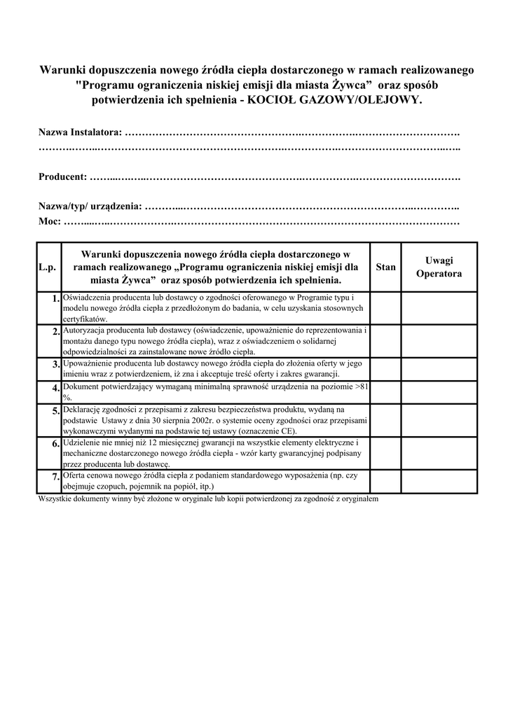 Warunki dopuszczenia nowego źródła ciepła dostarczonego w ramach realizowanego "Programu ograniczenia niskiej emisji dla miasta Żywca” oraz sposób potwierdzenia ich spełnienia - KOCIOŁ GAZOWY/OLEJOWY. Nazwa Instalatora: …………………………………………….…………….…………………………. ……….……..……………………………………………….…………….…………………………..….. Producent: ……...….…..……………………………………….…………….…………………………. Nazwa/typ/ urządzenia: ………...…………………………………………………………..………….. Moc: ……....…..……………….………………………………………………………………………… L.p. Warunki dopuszczenia nowego źródła ciepła dostarczonego w ramach realizowanego „Programu ograniczenia niskiej emisji dla miasta Żywca” oraz sposób potwierdzenia ich spełnienia. 1. Oświadczenia producenta lub dostawcy o zgodności oferowanego w Programie typu i Stan modelu nowego źródła ciepła z przedłożonym do badania, w celu uzyskania stosownych certyfikatów. 2. Autoryzacja producenta lub dostawcy (oświadczenie, upoważnienie do reprezentowania i montażu danego typu nowego źródła ciepła), wraz z oświadczeniem o solidarnej odpowiedzialności za zainstalowane nowe źródło ciepła. 3. Upoważnienie producenta lub dostawcy nowego źródła ciepła do złożenia oferty w jego imieniu wraz z potwierdzeniem, iż zna i akceptuje treść oferty i zakres gwarancji. 4. Dokument potwierdzający wymaganą minimalną sprawność urządzenia na poziomie >81 %. 5. Deklarację zgodności z przepisami z zakresu bezpieczeństwa produktu, wydaną na podstawie Ustawy z dnia 30 sierpnia 2002r. o systemie oceny zgodności oraz przepisami wykonawczymi wydanymi na podstawie tej ustawy (oznaczenie CE). 6. Udzielenie nie mniej niż 12 miesięcznej gwarancji na wszystkie elementy elektryczne i mechaniczne dostarczonego nowego źródła ciepła - wzór karty gwarancyjnej podpisany przez producenta lub dostawcę. 7. Oferta cenowa nowego źródła ciepła z podaniem standardowego wyposażenia (np. czy obejmuje czopuch, pojemnik na popiół, itp.) Wszystkie dokumenty winny być złożone w oryginale lub kopii potwierdzonej za zgodność z oryginałem Uwagi Operatora