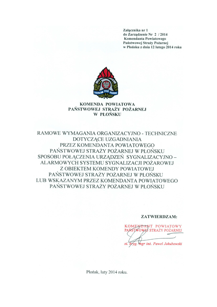 1. Zakres opracowania Niniejsze opracowanie to zbiór wymagań organizacyjno – technicznych, obejmujących w szczególności: - procedurę przyłączenia obiektu do centrum odbiorczego alarmów pożarowych (COAP), - ogólne zasady uzgadniania sposobu połączenia do systemu transmisji sygnałów alarmowych i uszkodzeniowych, - zasady organizacji, funkcjonowanie i budowę systemów transmisji sygnałów alarmowych pożarowych i uszkodzeniowych, - wymagania dotyczące konserwacji i przeglądów systemu sygnalizacji pożarowej w świetle obowiązujących przepisów, norm oraz wiedzy technicznej, - wymagania techniczne dla elementów składowych systemów sygnalizacji pożarowej i systemów transmisji alarmów pożarowych i sygnałów uszkodzeniowych. Przedstawione w niniejszym opracowaniu wytyczne zostaną uwzględnione w treści umów cywilno – prawnych zawieranych pomiędzy Komendantem Powiatowym Państwowej Straży Pożarnej w Płońsku a podmiotami realizującymi monitoring. 2 2. Wykaz powołanych przepisów, norm oraz specyfikacji technicznych - ustawa z dnia 24 sierpnia 1991 roku o Państwowej Straży Pożarnej ( Dz. U. z 2009 roku Nr 12, poz. 68 z późn. zm.), - ustawa z dnia 24 sierpnia 1991 roku o ochronie przeciwpożarowej ( Dz. U. z 2009 roku Nr 178, poz. 1380 z późn. zm.), - rozporządzenie Ministra Spraw Wewnętrznych i Administracji z dnia 7 czerwca 2010 roku w sprawie ochrony przeciwpożarowej budynków, innych obiektów budowlanych i terenów ( Dz. U. Nr 109, poz. 719), - rozporządzenie Ministra Spraw Wewnętrznych i Administracji z dnia 20 czerwca 2007 roku w sprawie wykazu wyrobów służących zapewnieniu bezpieczeństwa publicznego lub ochronie zdrowia i życia oraz mienia, a także zasad wydawania dopuszczenia tych wyrobów do użytku ( Dz. U. Nr 143, poz. 1002 z poen. zm.), - rozporządzenia Ministra Infrastruktury z dnia 15 kwietnia 2004 roku w sprawie dokonywania oceny zgodności telekomunikacyjnych urządzeń końcowych przeznaczonych do dołączenia do zakończeń sieci publicznej i urządzeń radiowych z zasadniczymi wymaganiami oraz ich oznakowania ( Dz. U. Z 2004 roku, Nr 73, poz. 659 z późn. zm.), - PN-EN 54-1:2011 Systemy Sygnalizacji Pożarowej. Wprowadzenie, - PN-EN 54-2:2002 Systemy Sygnalizacji Pożarowej. Część 2. Centrale sygnalizacji pożarowej, - PN-EN 54-2:2002/A1:2007 Systemy Sygnalizacji Pożarowej. Część 2. Centrale Sygnalizacji Pożarowej, - PN-EN 54-21:2009 Systemy Sygnalizacji Pożarowej. Urządzenia transmisji alarmów pożarowych i sygnałów uszkodzeniowych, - PN-EN 50136-1-1:2007 Systemy alarmowe. Systemy i urządzenia transmisji alarmu. Część 1-1: Wymagania ogólne dotyczące systemów transmisji alarmu, - PN-EN 50136-1-2:2007 Systemy alarmowe. Systemy i urządzenia transmisji alarmu. Część 1-2: Wymagania dla systemów wykorzystujących dedykowane tory transmisji, - PN-EN 50136-1-3:2007 Systemy alarmowe. Systemy i urządzenia transmisji alarmu. Część 1-3: Wymagania dla systemów lączności cyfrowej wykorzystujących publiczną sieć komutowaną, - PN-ISO 8411-3:1996 Ochrona przeciwpożarowa. Terminologia. Wykrywanie pożaru. 3 - Specyfikacja techniczna CLC/TS 50136-4 Systemy alarmowe – Systemy i urządzenia transmisji alarmu – Część 4: Urządzenia powiadamiania w Alarmowych Centrach Odbiorczych. - Specyfikacja techniczna PKN-CEN/TS 54-14:2006 Systemy sygnalizacji pożarowej – Cześć 14: Wytyczne planowania, projektowania, instalowania, odbioru i konserwacji. 4 3. Definicje i określenia ABONENT – osoba fizyczna lub prawna odpowiedzialna za organizację systemu sygnalizacji pożarowej i systemu transmisji sygnału alarmu pożarowego w obiekcie, która jest stroną umowy z Operatorem. CENTRALA SYGNALIZACJI POŻAROWEJ ( CSP ) – urządzenie, poprzez które czujki pożarowe mogą być zasilane energią, służące do potwierdzenia wykrytego sygnału i wywołania alarmu pożarowego, przesłania sygnału o wykryciu pożaru, poprzez układ transmisji alarmów pożarowych, do straży pożarnej lub automatycznych urządzeń gaśniczych oraz automatycznej kontroli prawidłowego funkcjonowania systemu sygnalizacji pożarowej. CENTRUM ODBIORCZE ALARMÓW POŻAROWYCH ( COAP ) – miejsce z ciągłą obsługą, z którego dysponowane są siły i środki będące jednostkami ochrony przeciwpożarowej, wskazane przez właściwego miejscowo komendanta powiatowego/miejskiego Państwowej Straży Pożarnej, wyposażone w stacje odbiorcze alarmów pożarowych oraz system wizualizacji informacji. CENTRUM MONITOROWANIA OPERATORA SYSTEMU ( CMOS ) – miejsce z ciągłą obsługą, należące do operatora systemu monitoringu pożarowego, z którego nadzorowany jest stan systemu transmisji alarmów pożarowych i sygnałów uszkodzeniowych oraz dysponowany jest serwis tego systemu. Może być zintegrowane z centrum odbiorczym sygnałów uszkodzeniowych. Centrum monitorowania operatora systemu (CMOS) wchodzi w skład Centrum Odbiorczego Operatora. CENTRUM ODBIORCZE SYGNAŁÓW USZKODZENIOWYCH ( COSU ) - miejsce z ciągłą obsługą, należące do operatora systemu monitoringu pożarowego, odbierające sygnały uszkodzeniowe z urządzenia transmisji alarmów pożarowych i sygnałów uszkodzeniowych ( UTASU ), z którego mogą być również powiadamiane firmy serwisujące systemy sygnalizacji pożarowej oraz uszkodzeniach tych systemów. Zawiera stację odbiorczą sygnałów uszkodzeniowych. Centrum odbiorcze sygnałów uszkodzeniowych ( COSU ) wchodzi w skład Centrum Odbiorczego Operatora. 5 DWUSTOPNIOWE ALARMOWANIE – jest to alarmowanie polegające na takim zaprogramowaniu systemu sygnalizacji pożarowej, aby po wykryciu pożaru przez element liniowy ( np. czujkę pożarową) w centrali sygnalizacji pożarowej (CSP) był sygnalizowany alarm wstępny ( alarm I stopnia ) przez czas T1 przewidziany na zgłoszenie się personelu. Alarm I stopnia jest przeznaczony wyłączenie dla przeszkolonego personelu obsługującego CSP. Brak 