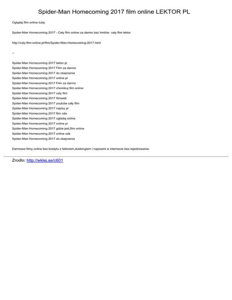 Spider-Man Homecoming 2017 film online LEKTOR PL Oglądaj film online tutaj: Spider-Man Homecoming 2017 - Cały film online za darmo bez limitów cały film lektor http://caly-film-online.pl/film/Spider-Man-Homecoming-2017.html -Spider-Man Homecoming 2017 lektor pl Spider-Man Homecoming 2017 Film za darmo Spider-Man Homecoming 2017 do obejrzenia Spider-Man Homecoming 2017 online pl Spider-Man Homecoming 2017 Film za darmo Spider-Man Homecoming 2017 chomikuj film online Spider-Man Homecoming 2017 caly film Spider-Man Homecoming 2017 filmweb Spider-Man Homecoming 2017 youtube cały film Spider-Man Homecoming 2017 napisy pl Spider-Man Homecoming 2017 film cda Spider-Man Homecoming 2017 ogladaj online Spider-Man Homecoming 2017 online pl Spider-Man Homecoming 2017 gdzie jest,film online Spider-Man Homecoming 2017 online cda Spider-Man Homecoming 2017 do obejrzenia Darmowe filmy online bez kredytu z lektorem,dubbingiem i napisami w internecie bez rejestrowania. Zrodlo: http://wklej.se/c601